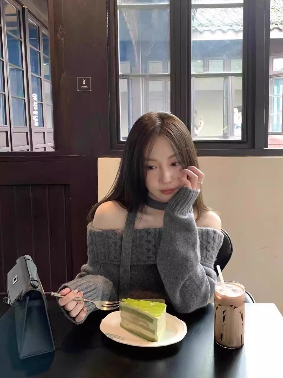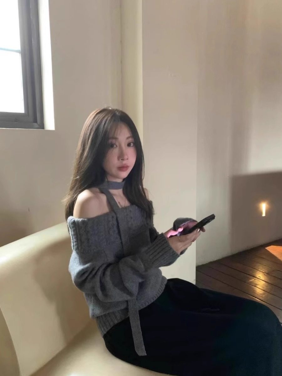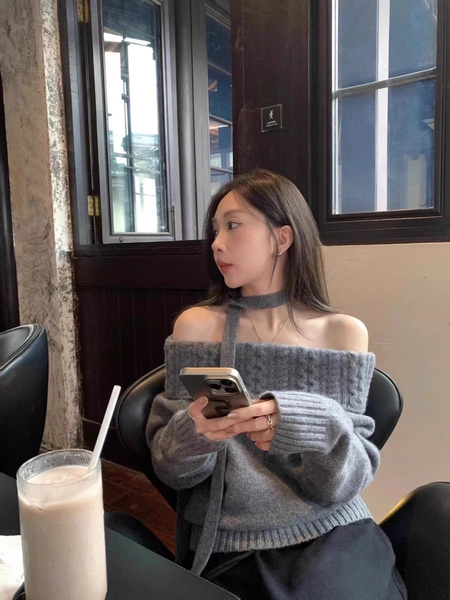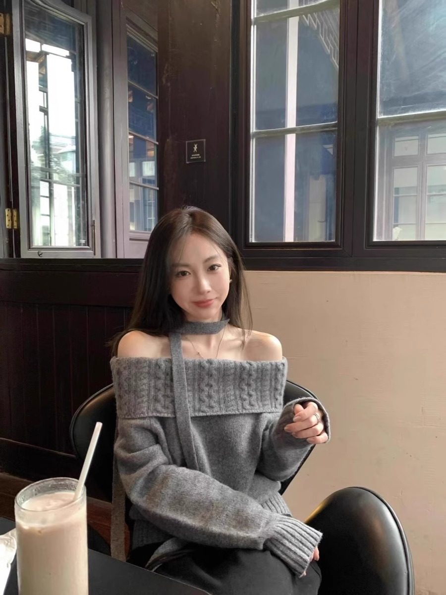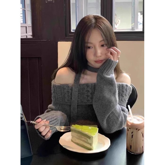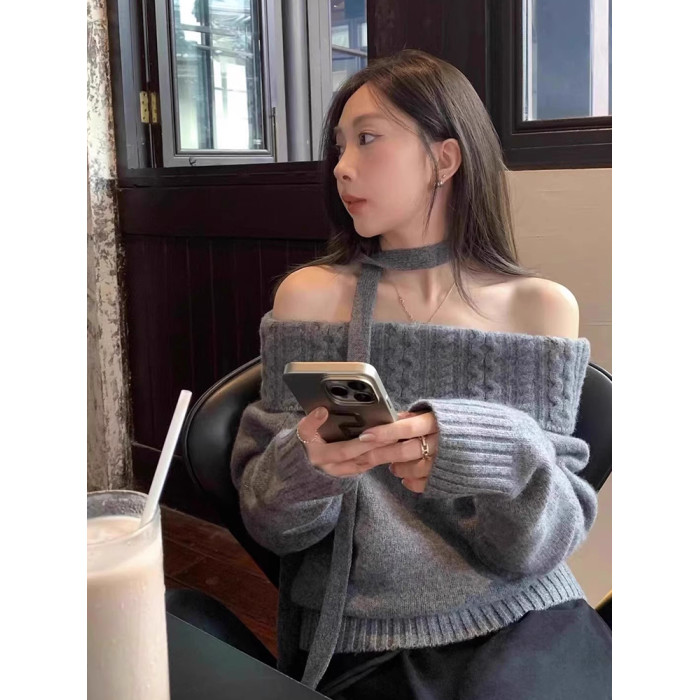 韓系灰色一字肩毛衣女冬季高級感寬鬆外穿慵懶風獨特漂亮針織上衣