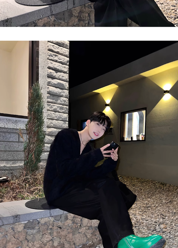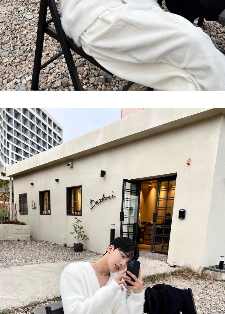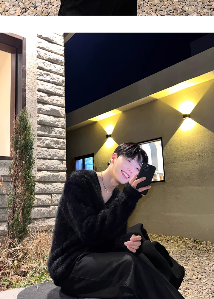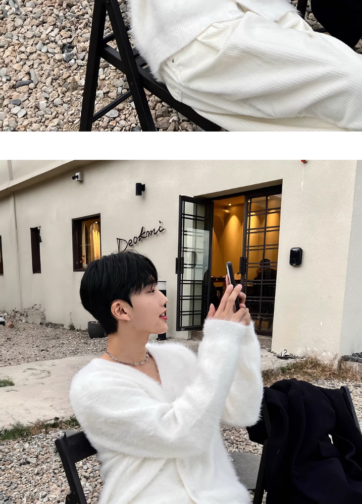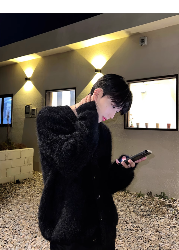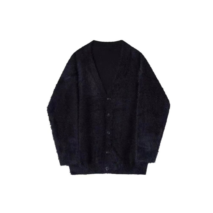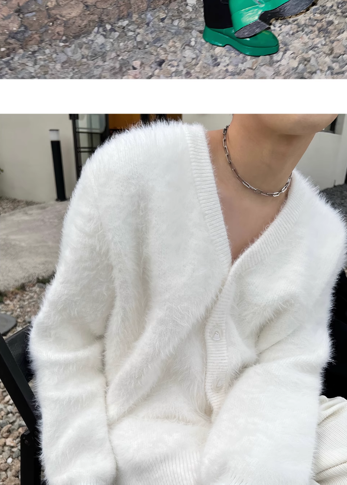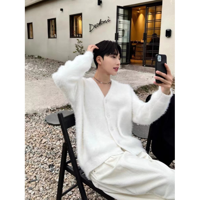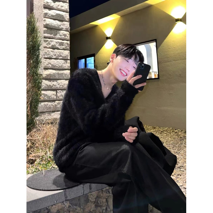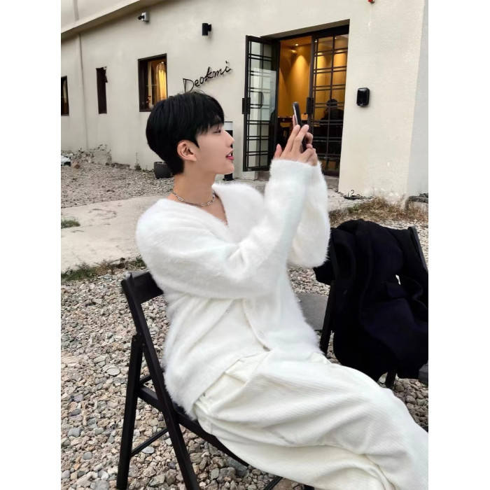 秋冬季水貂絨V領針織開衫外套男士韓版寬松休閒外穿小衆純色毛衣