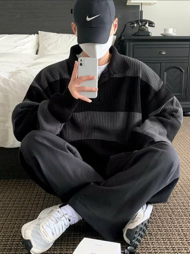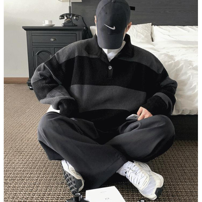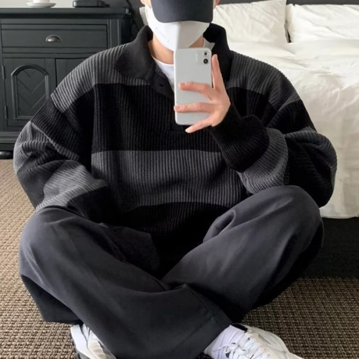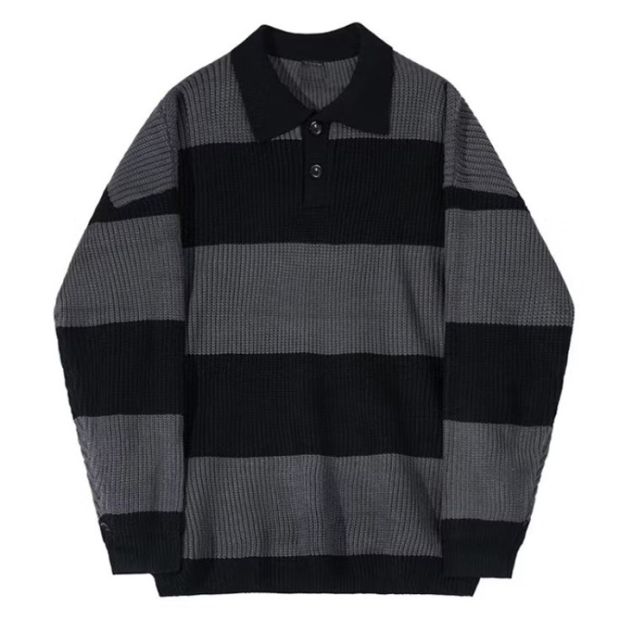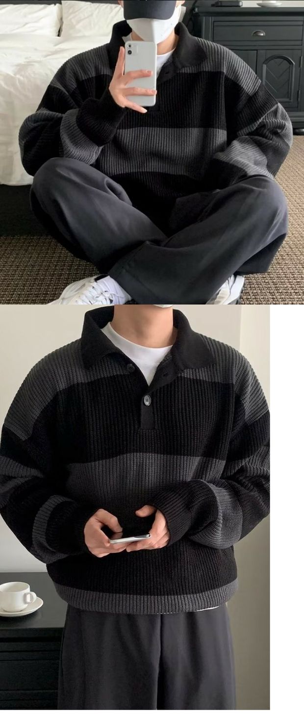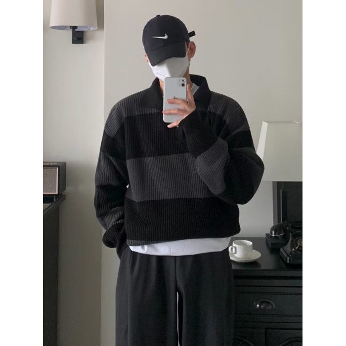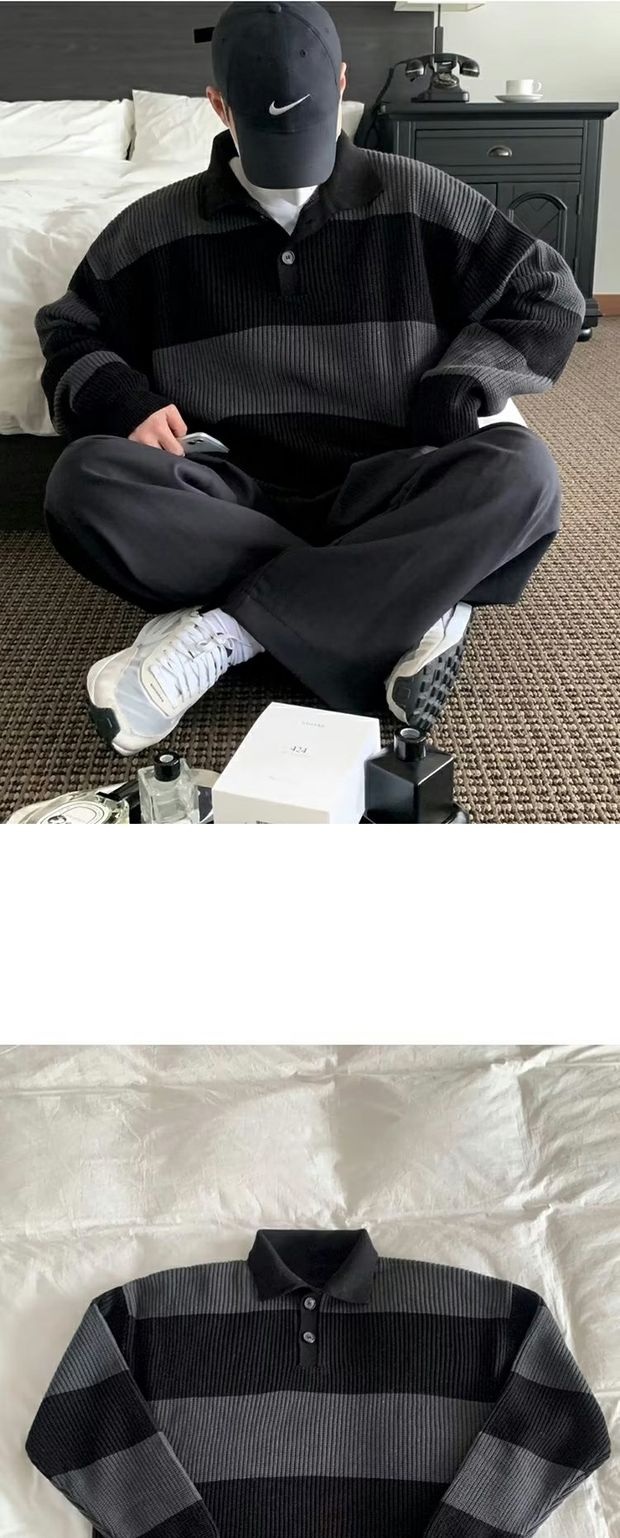 撞色條紋針織polo衫男高級感寬松長袖翻領毛衣cityboy海魂羊毛衫