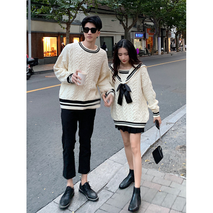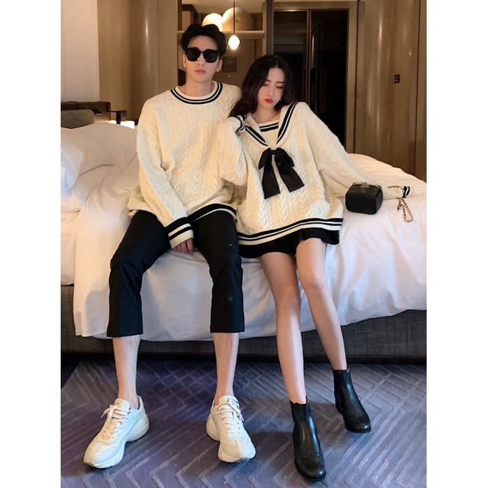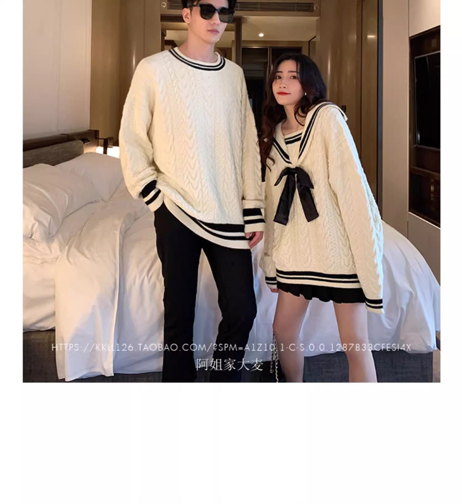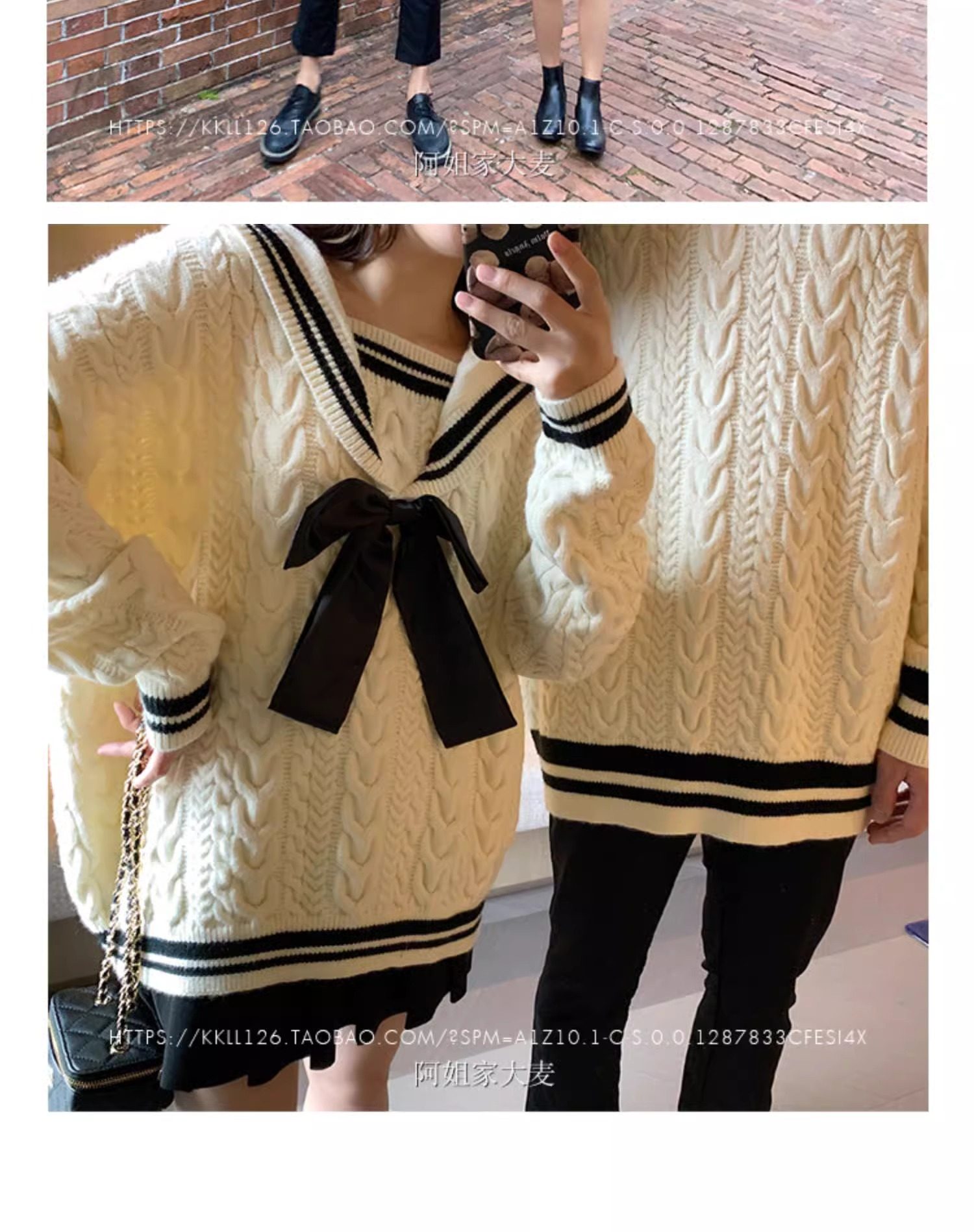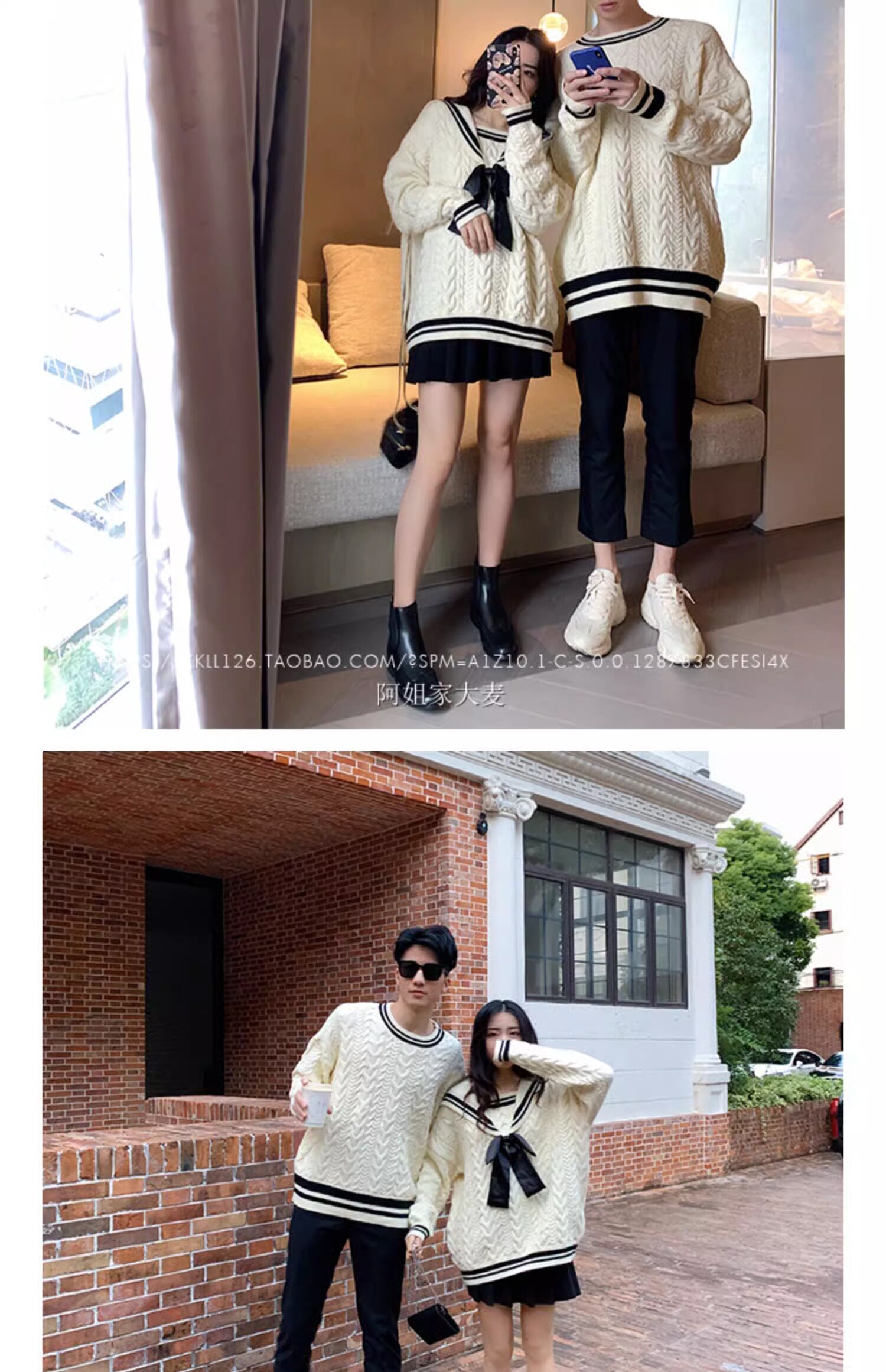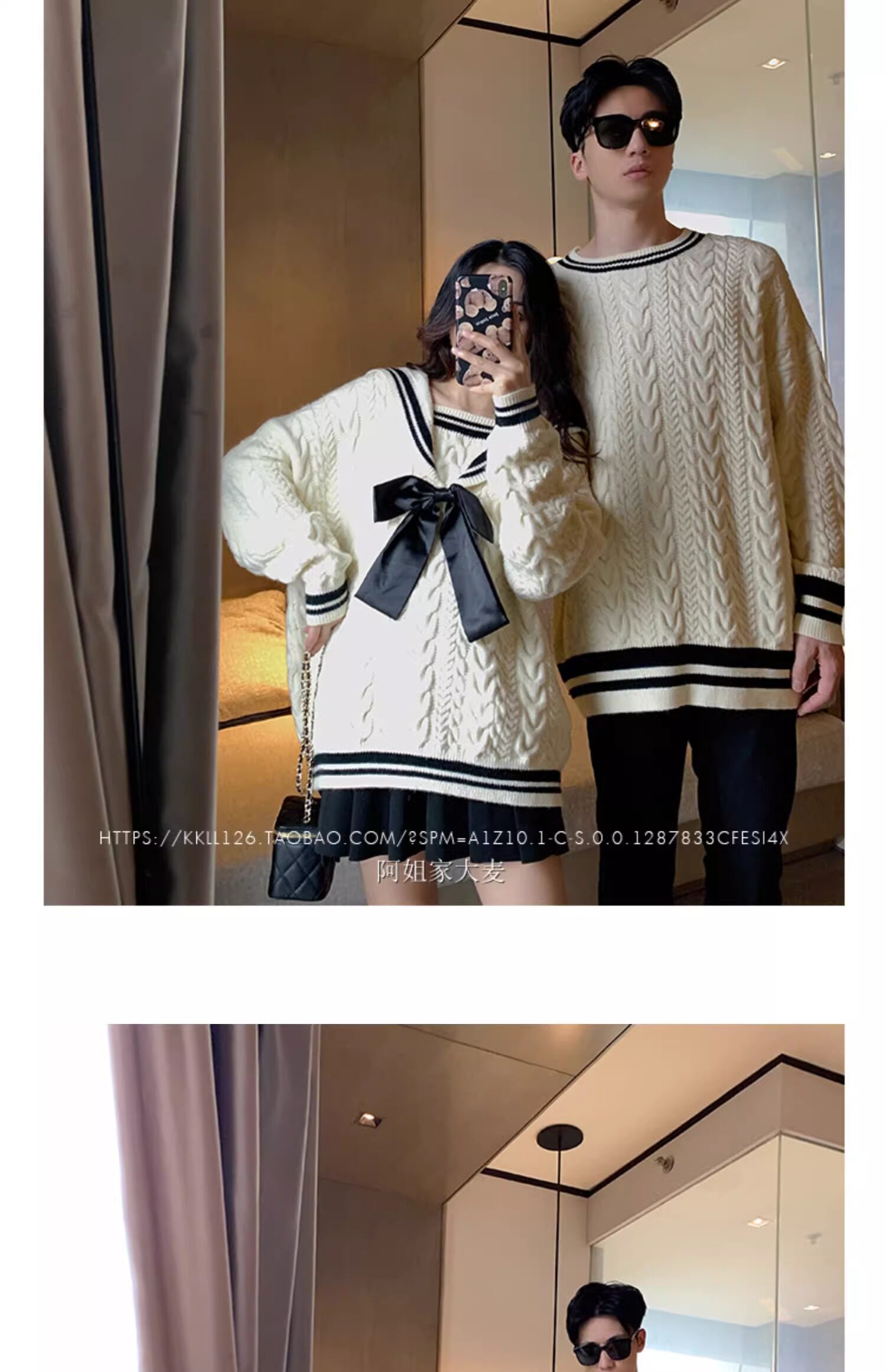 情侶裝春季2025新款潮流復古蝴蝶結針織衫上衣學院風海軍領毛衣女