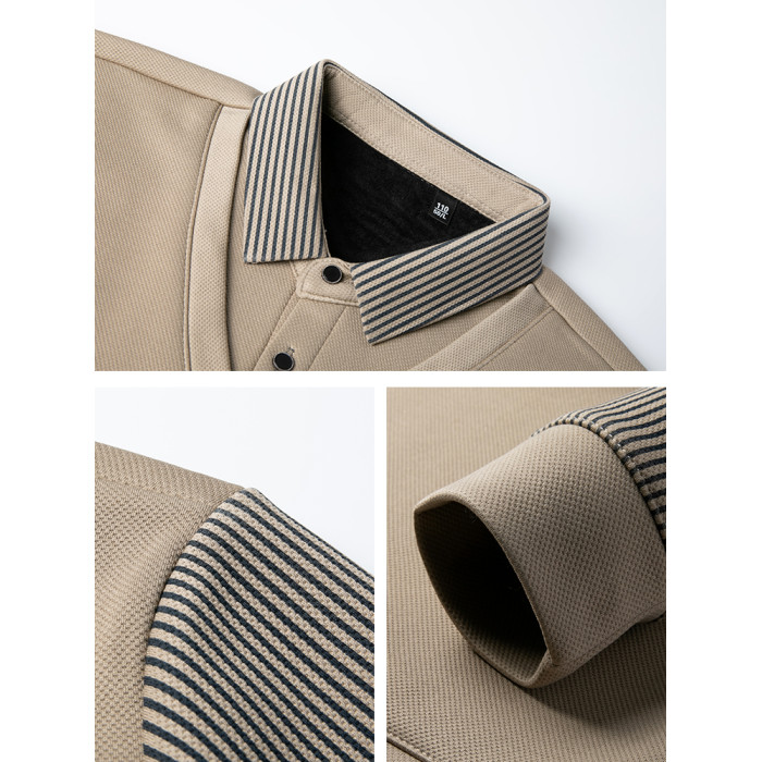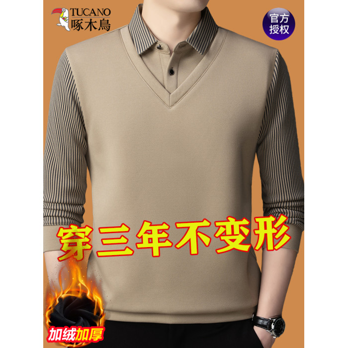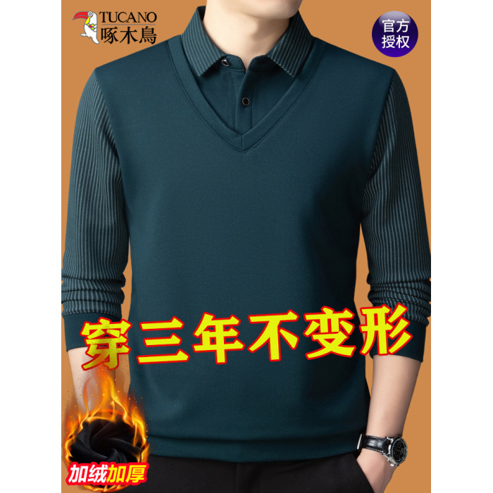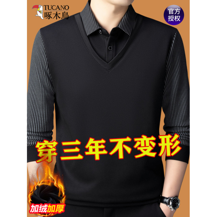 啄木鳥冬季中年男士假兩件毛衣長袖t恤加絨保暖爸爸裝針織打底衫