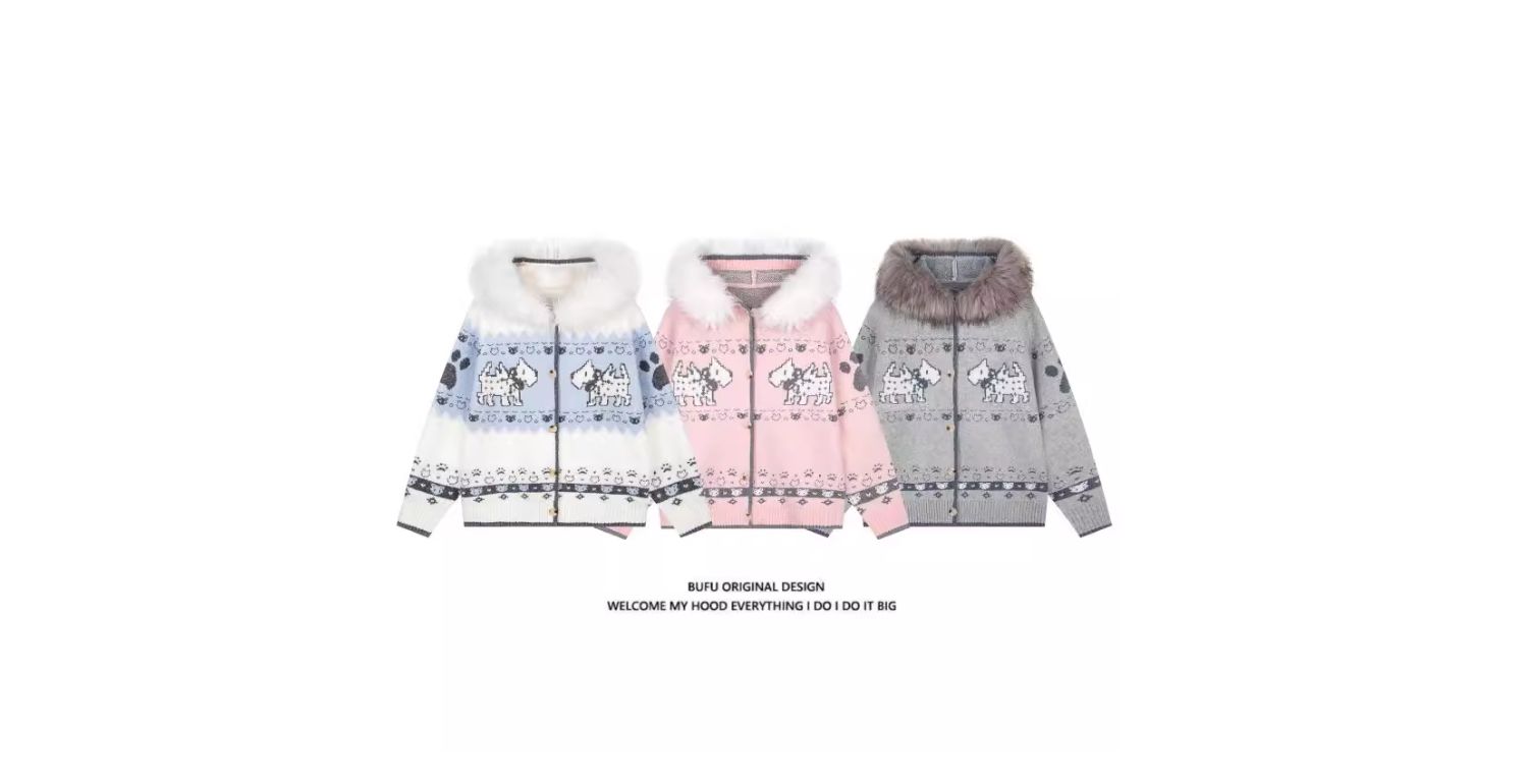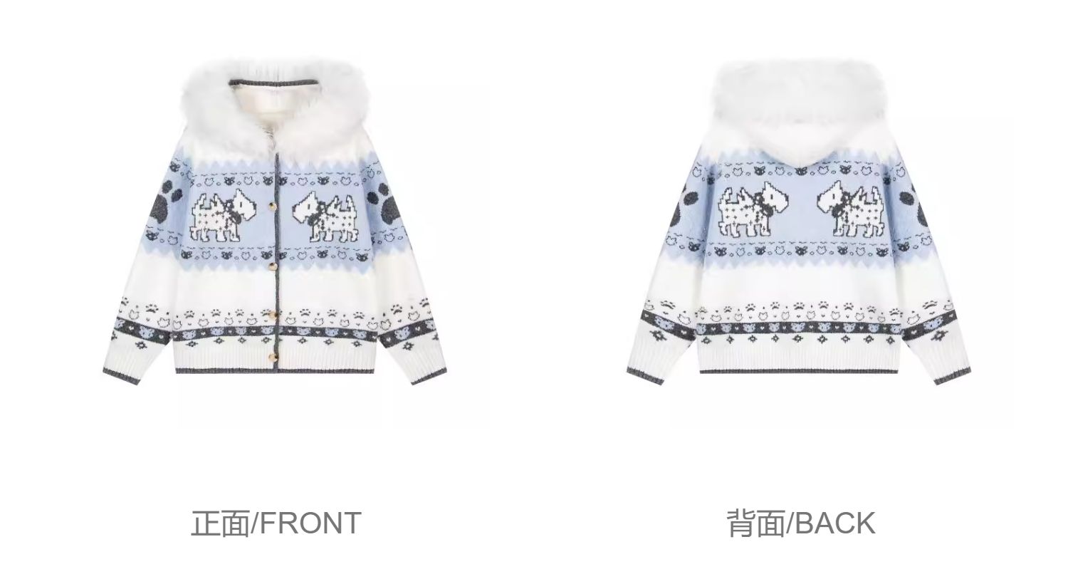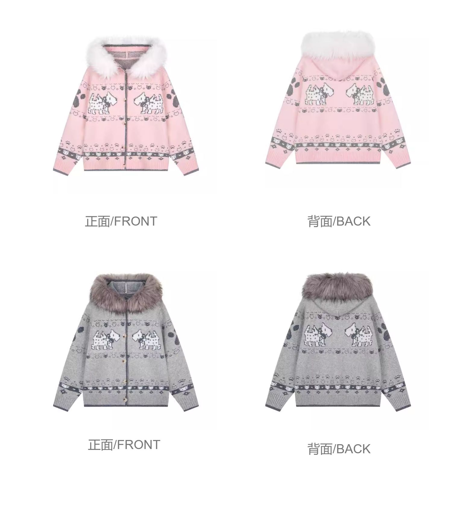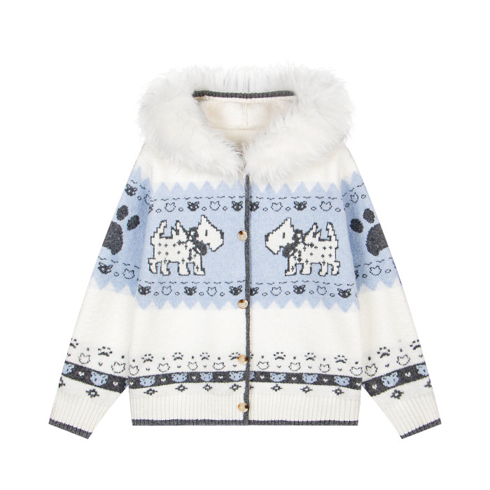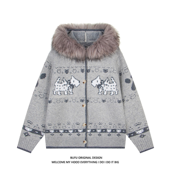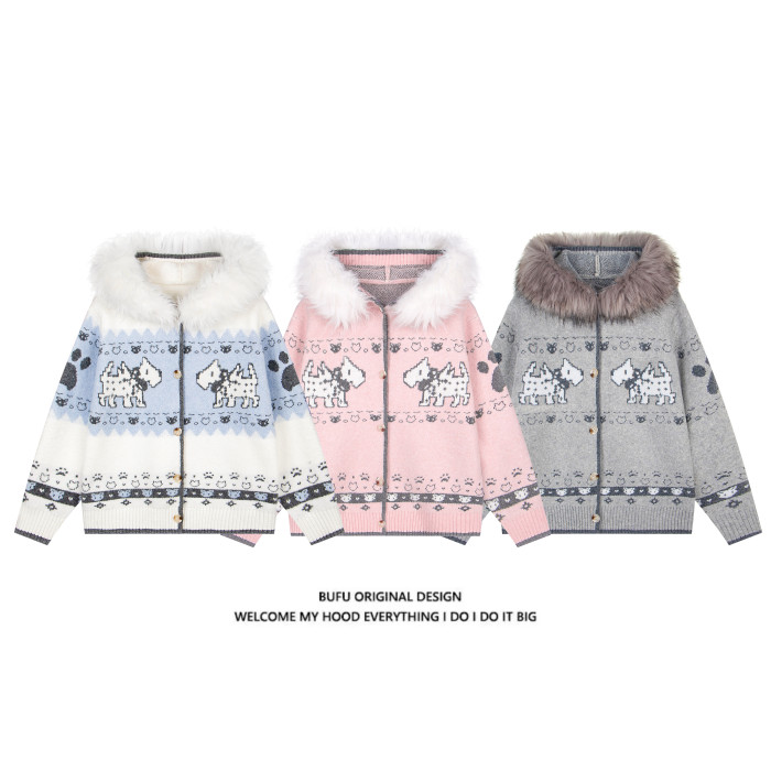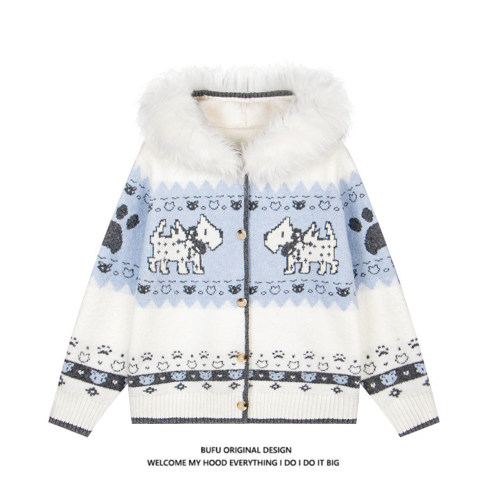 億萬少年BUFU原創美式復古毛領提花連帽針織開衫弗爾島小狗毛衣女