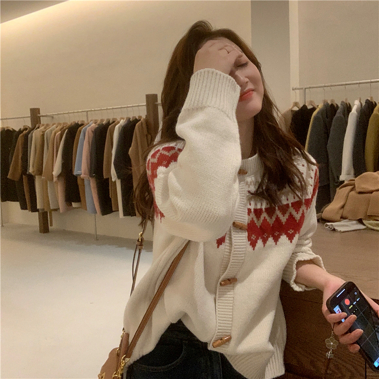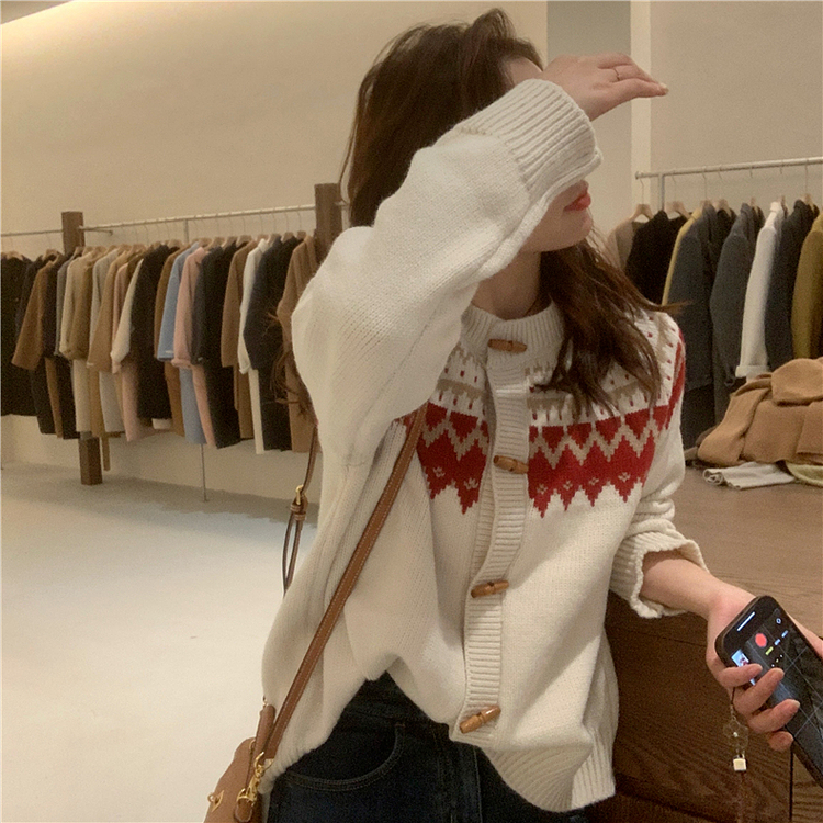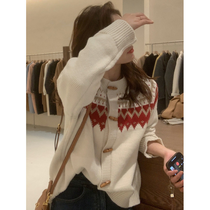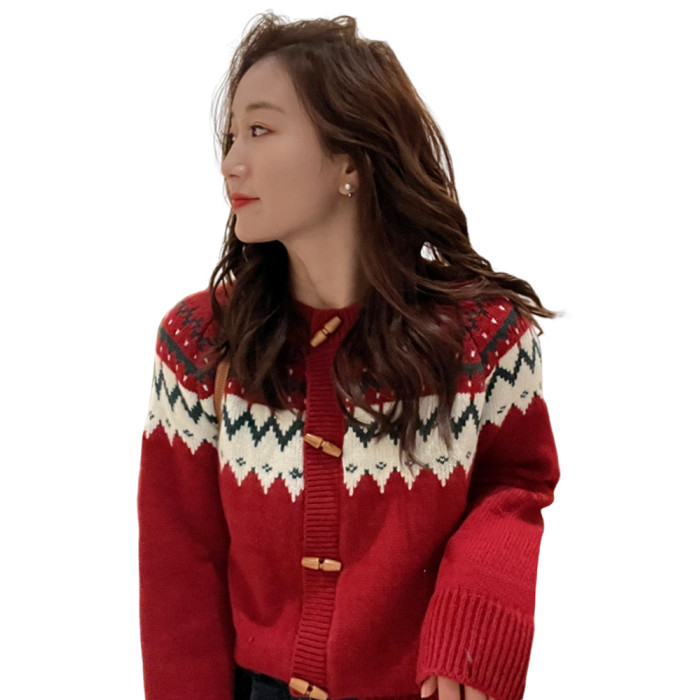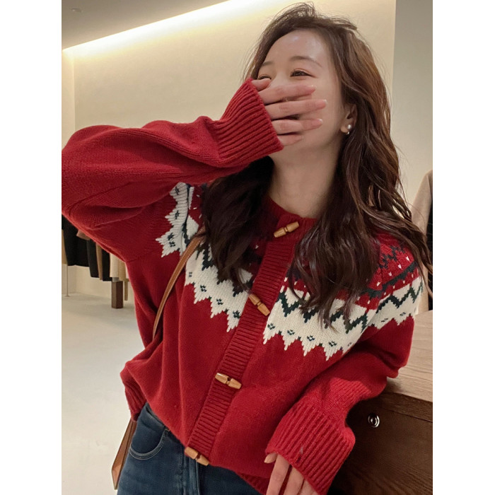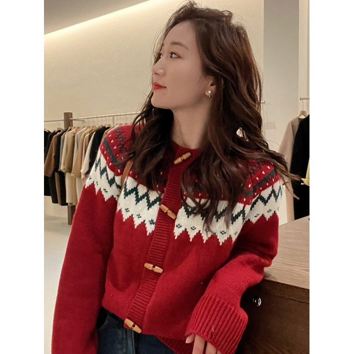 聖誕新年紅色費爾島毛衣女2025新款秋冬高級感超好看慵懶針織開衫
