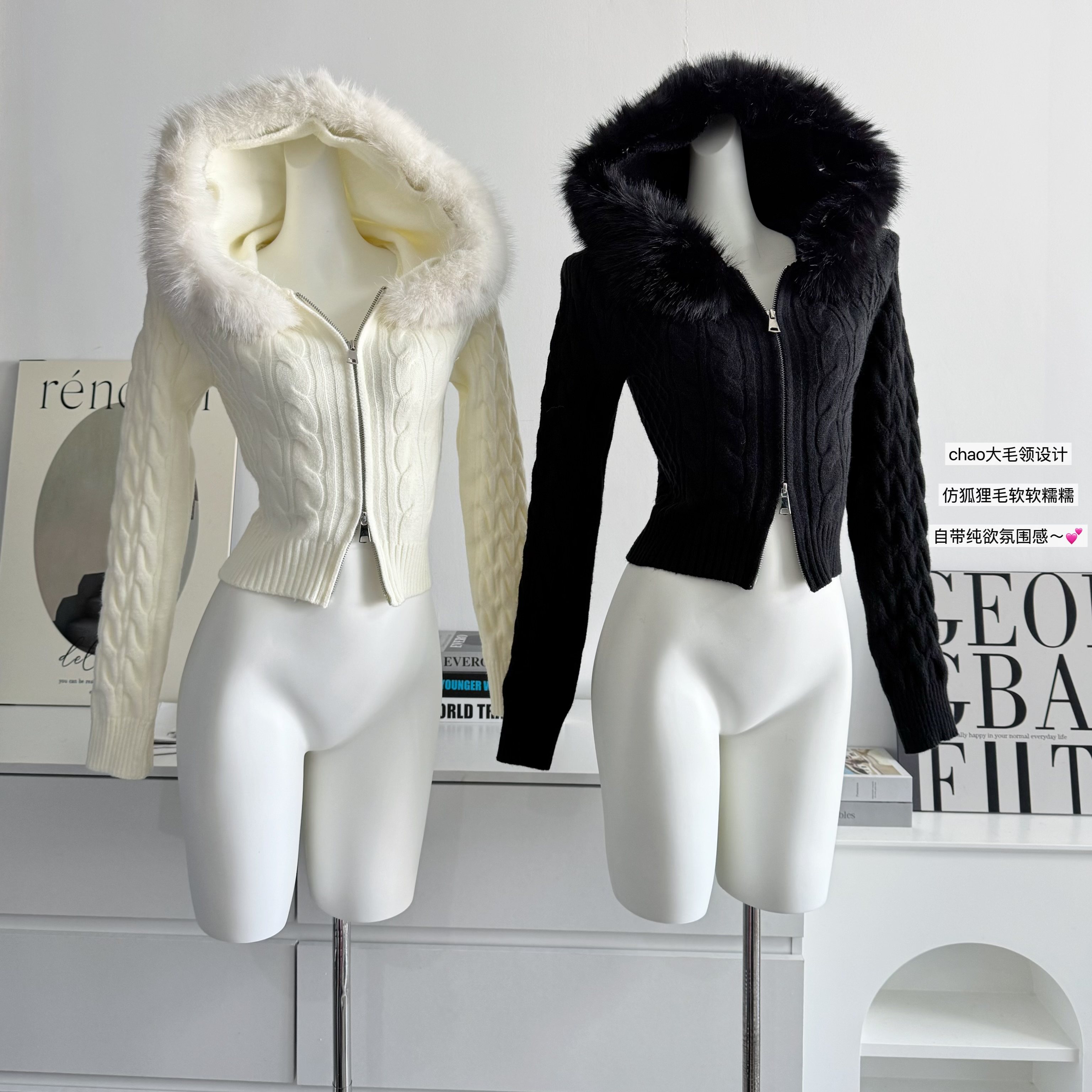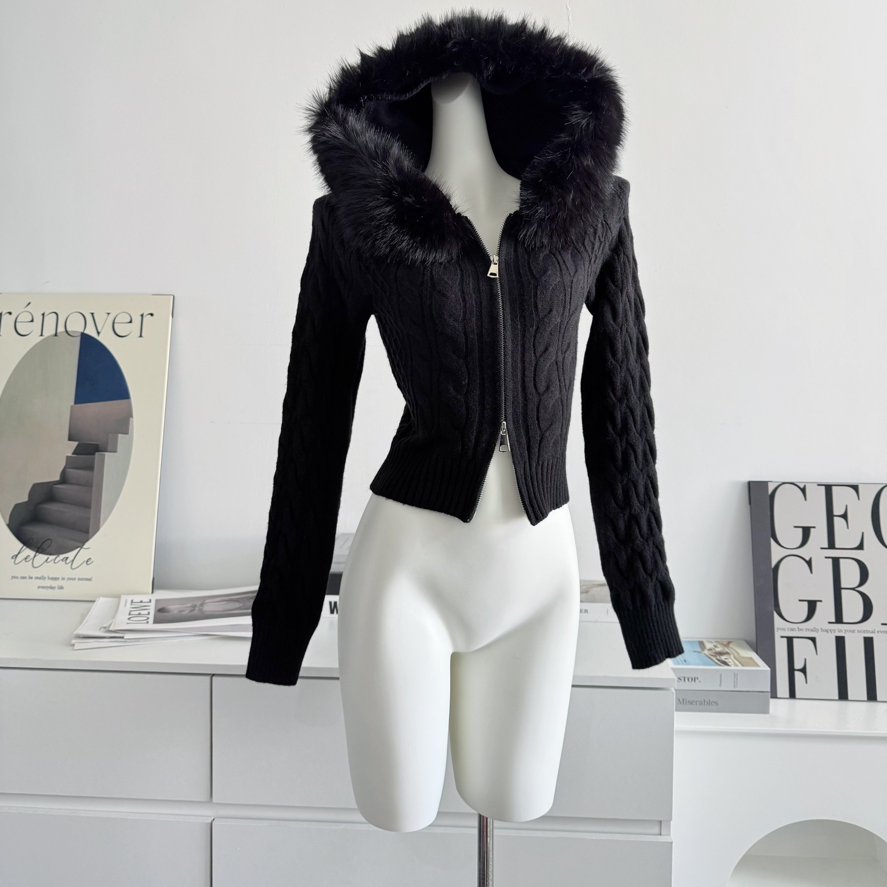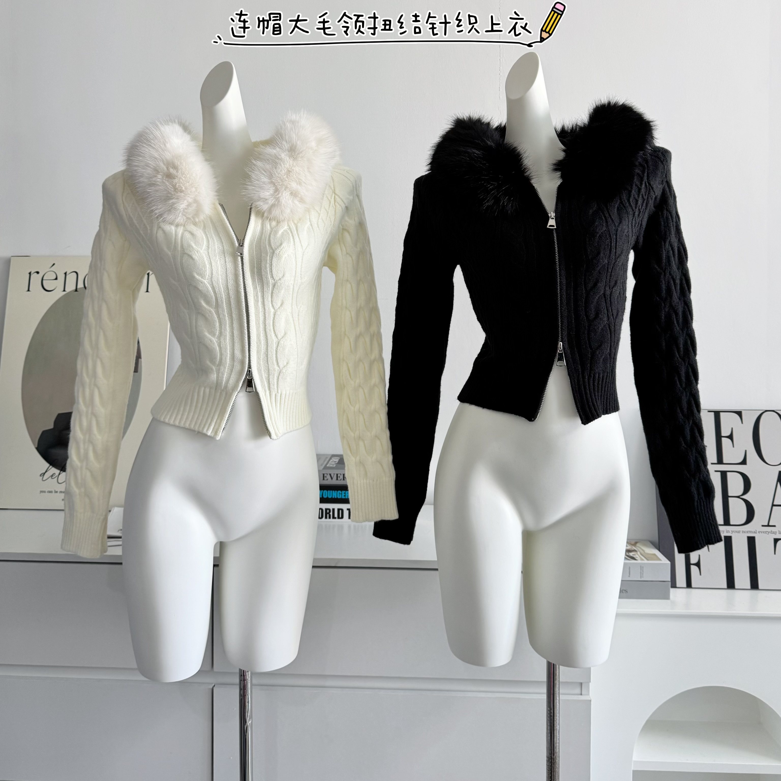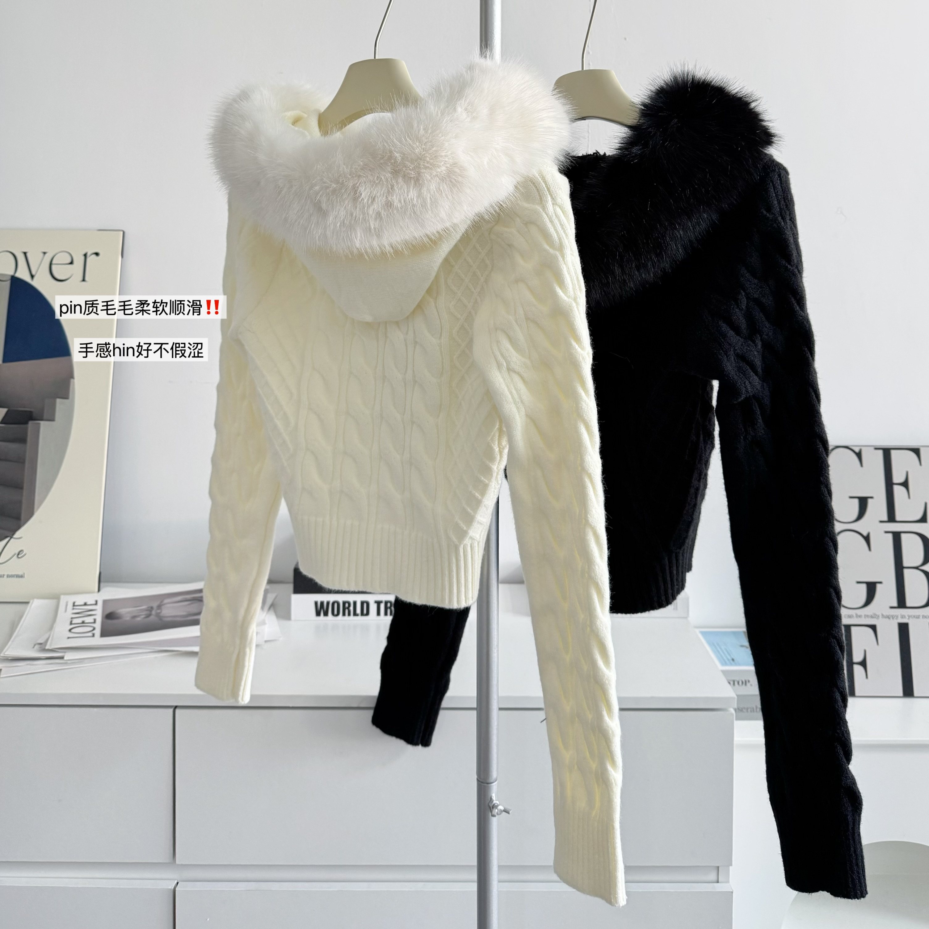POPW 溫柔連帽開衫拉鍊毛衣女冬季新款優雅修身顯瘦短款針織衫