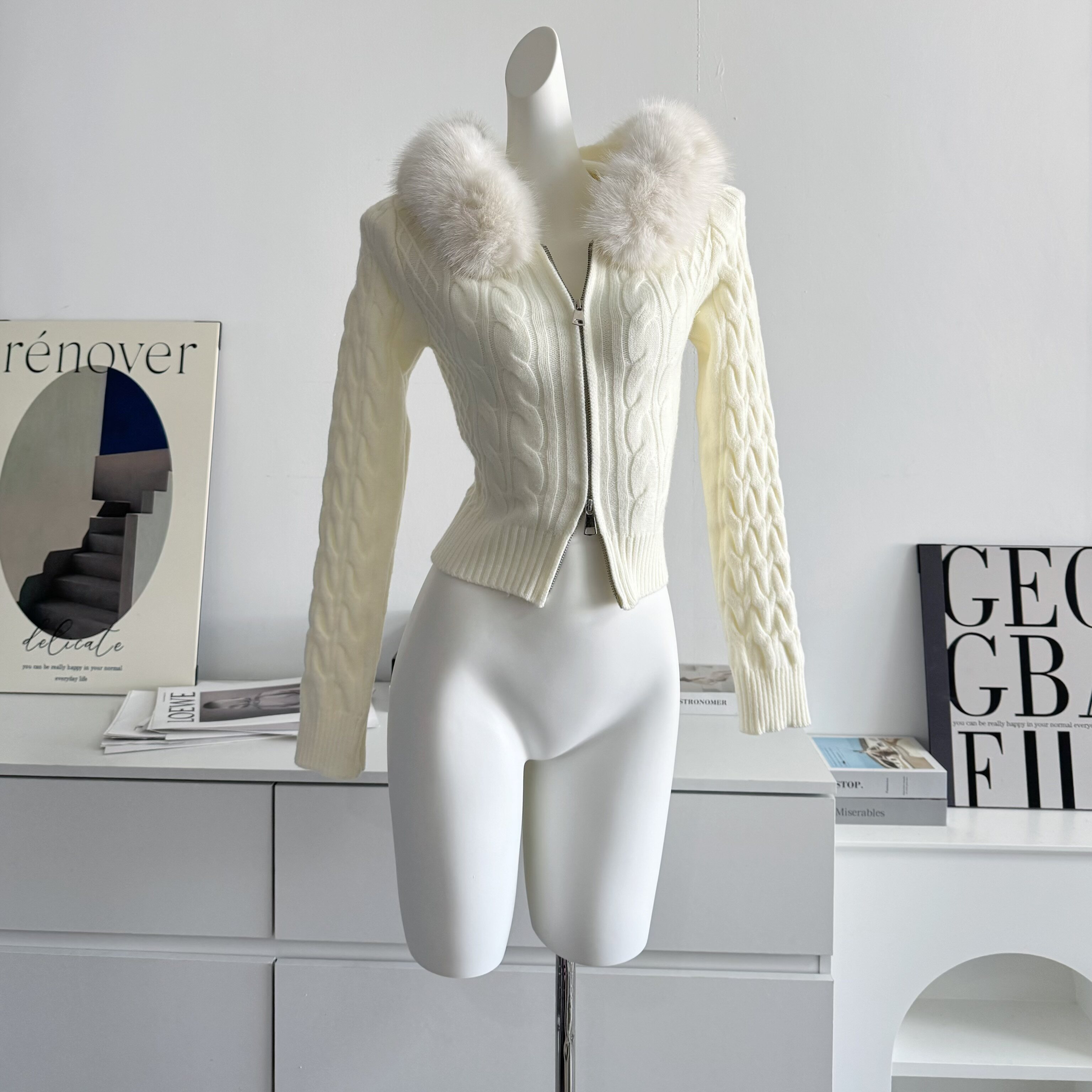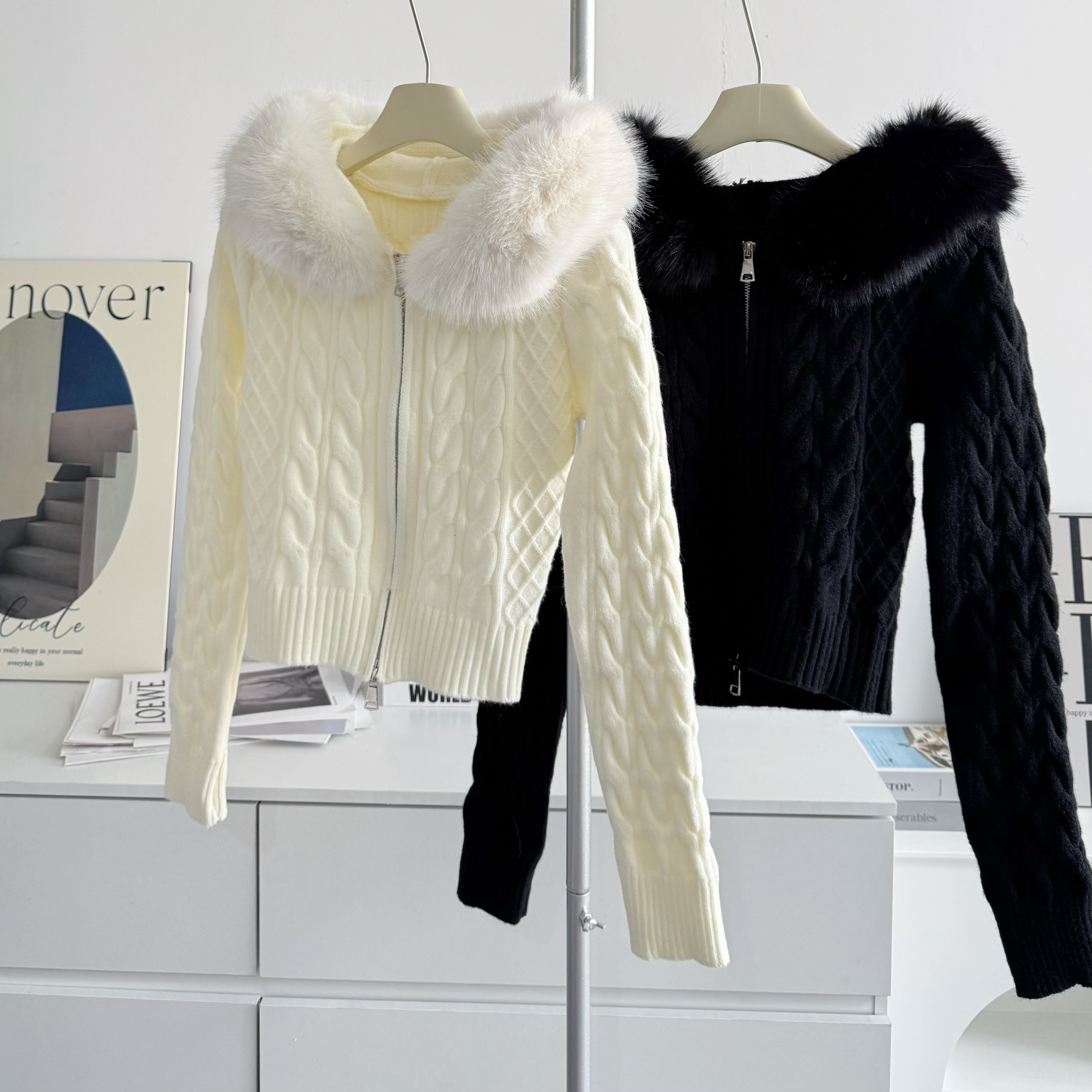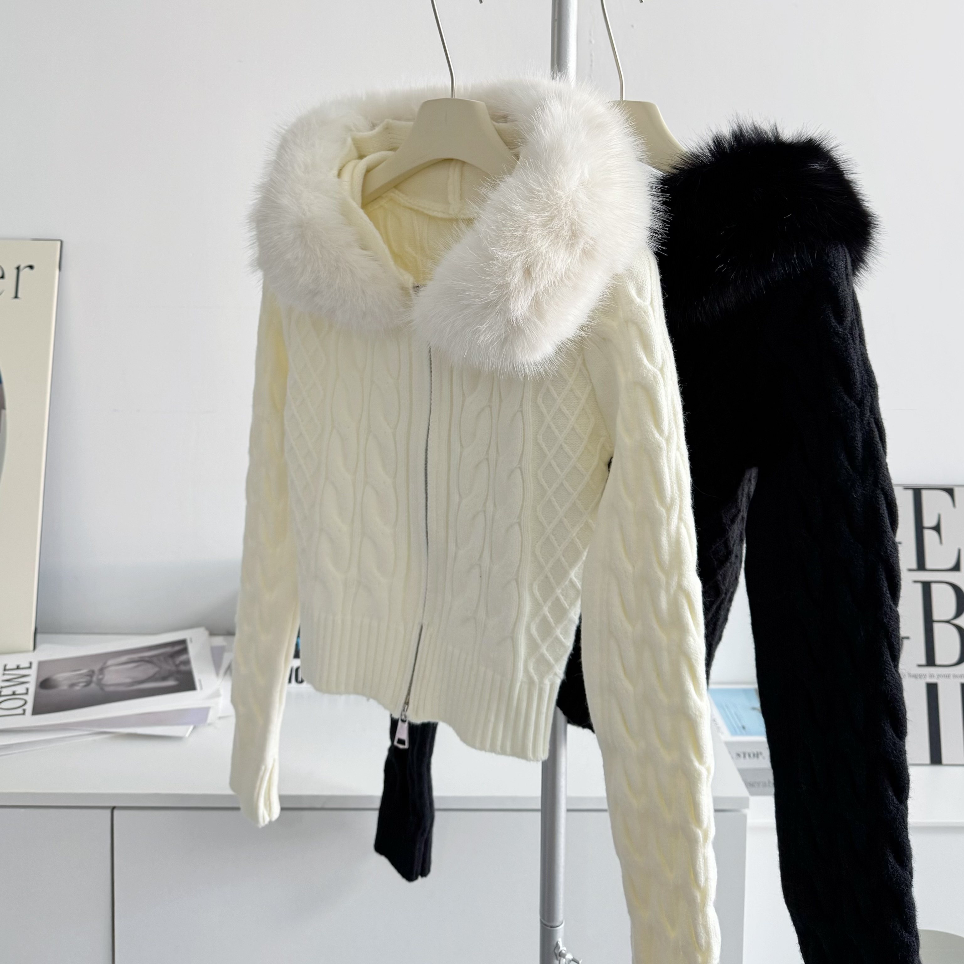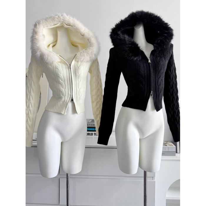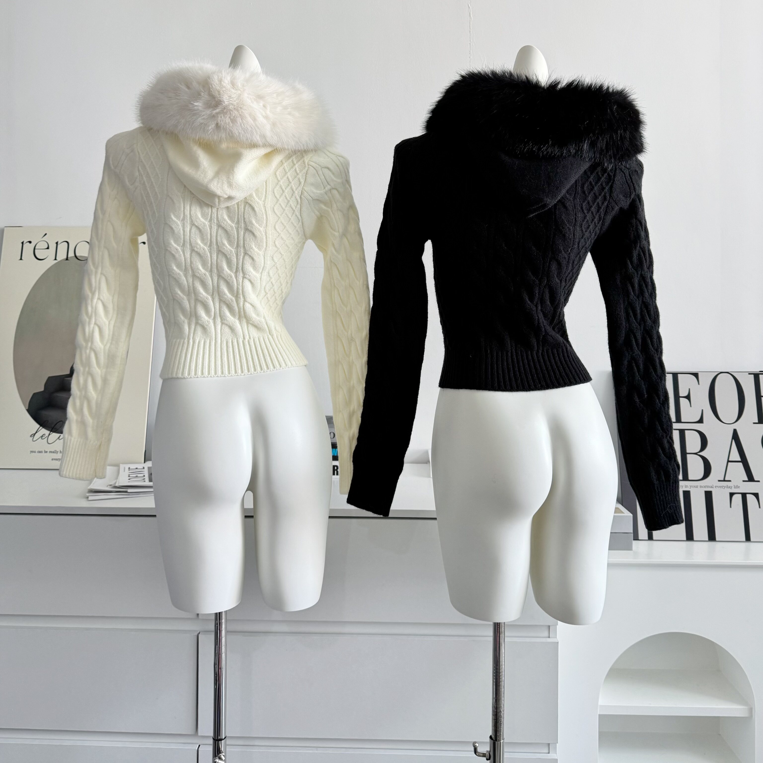 POPW 溫柔連帽開衫拉鍊毛衣女冬季新款優雅修身顯瘦短款針織衫