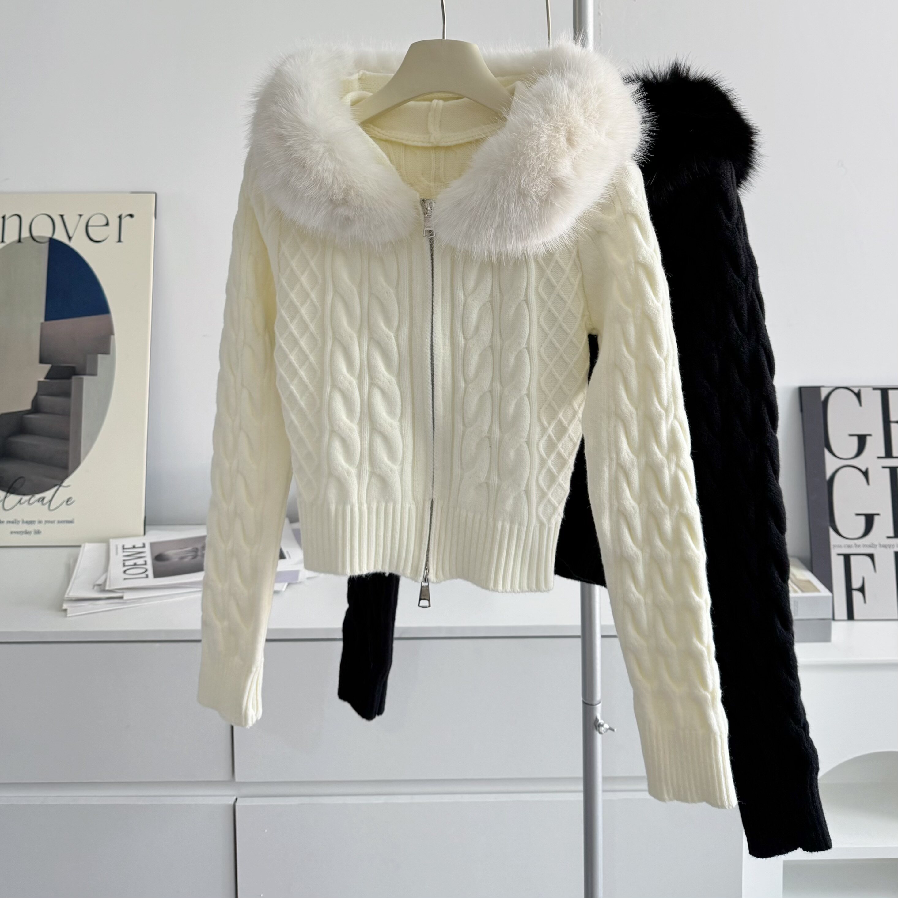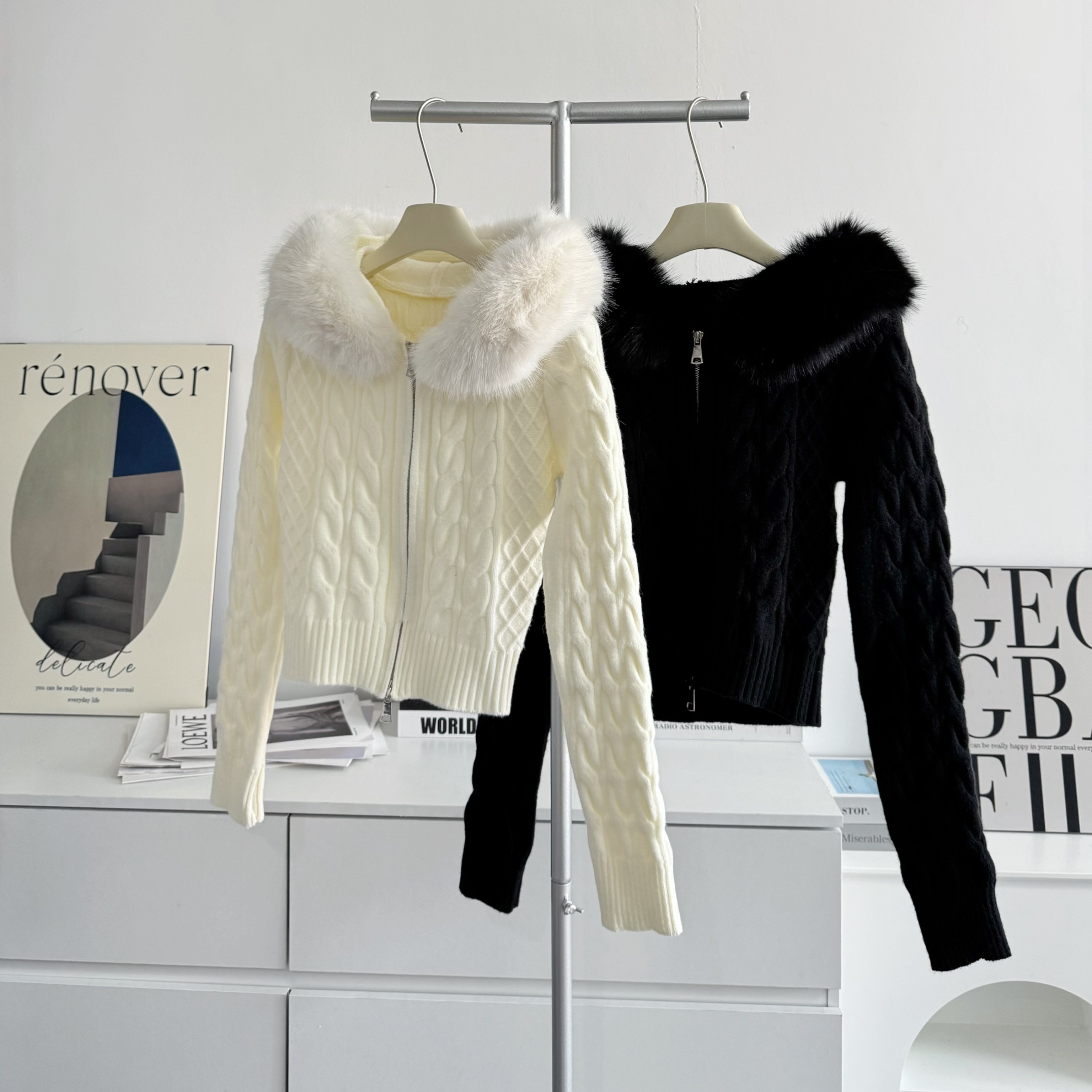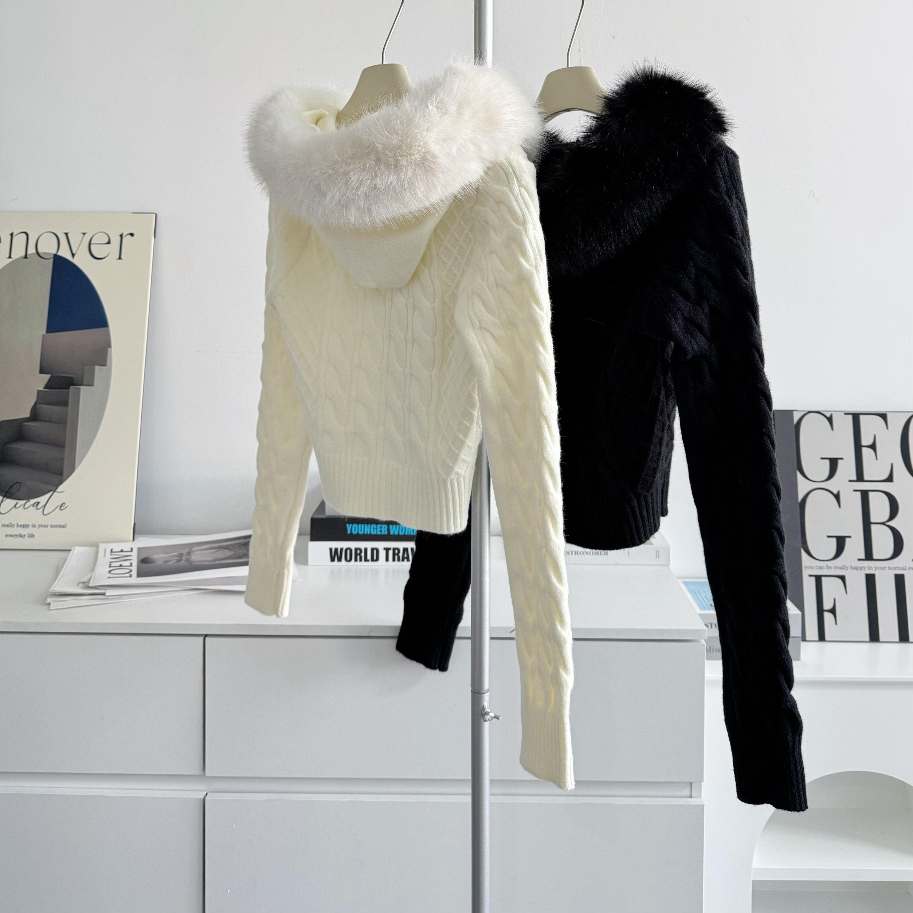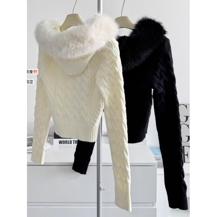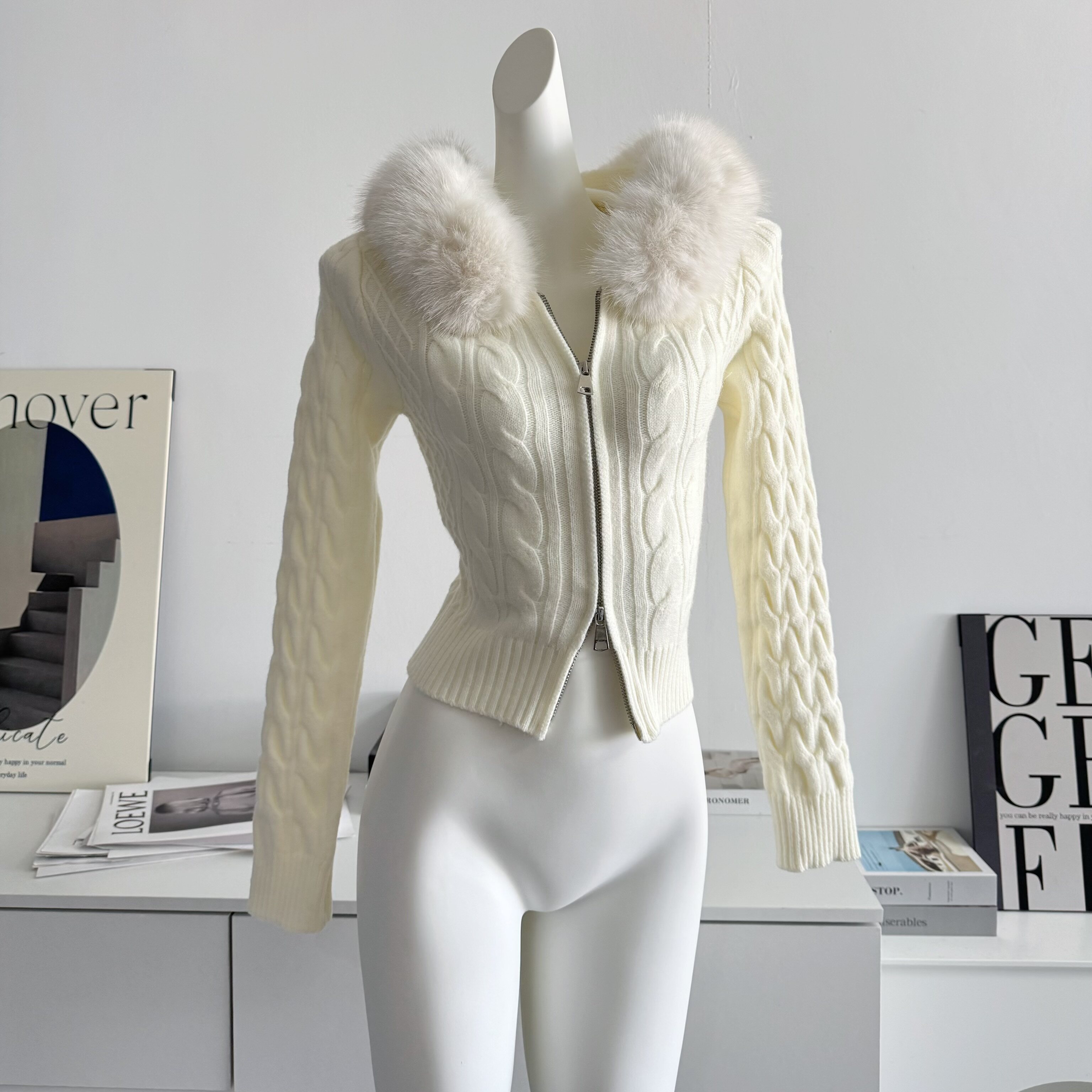 POPW 溫柔連帽開衫拉鍊毛衣女冬季新款優雅修身顯瘦短款針織衫