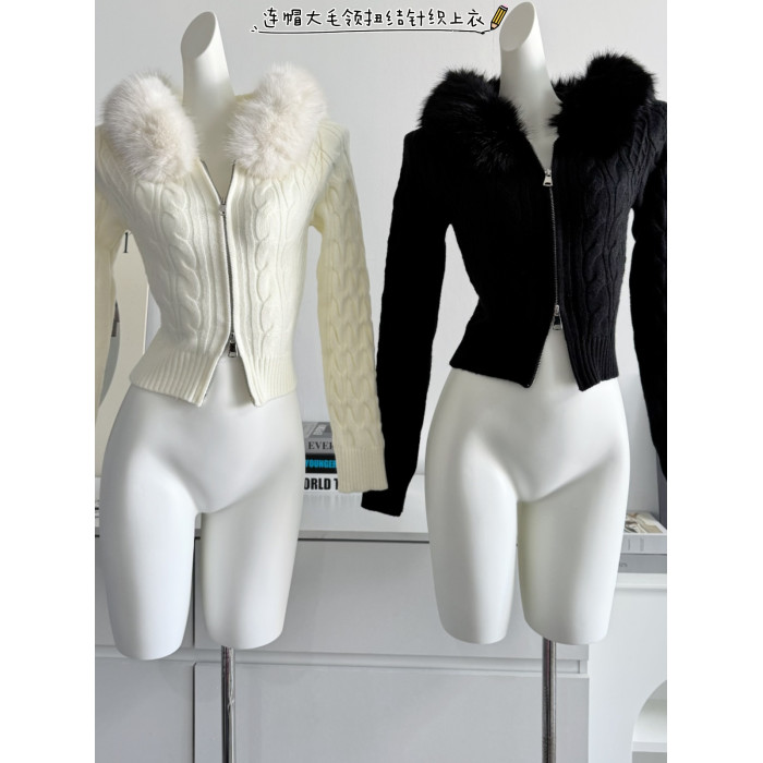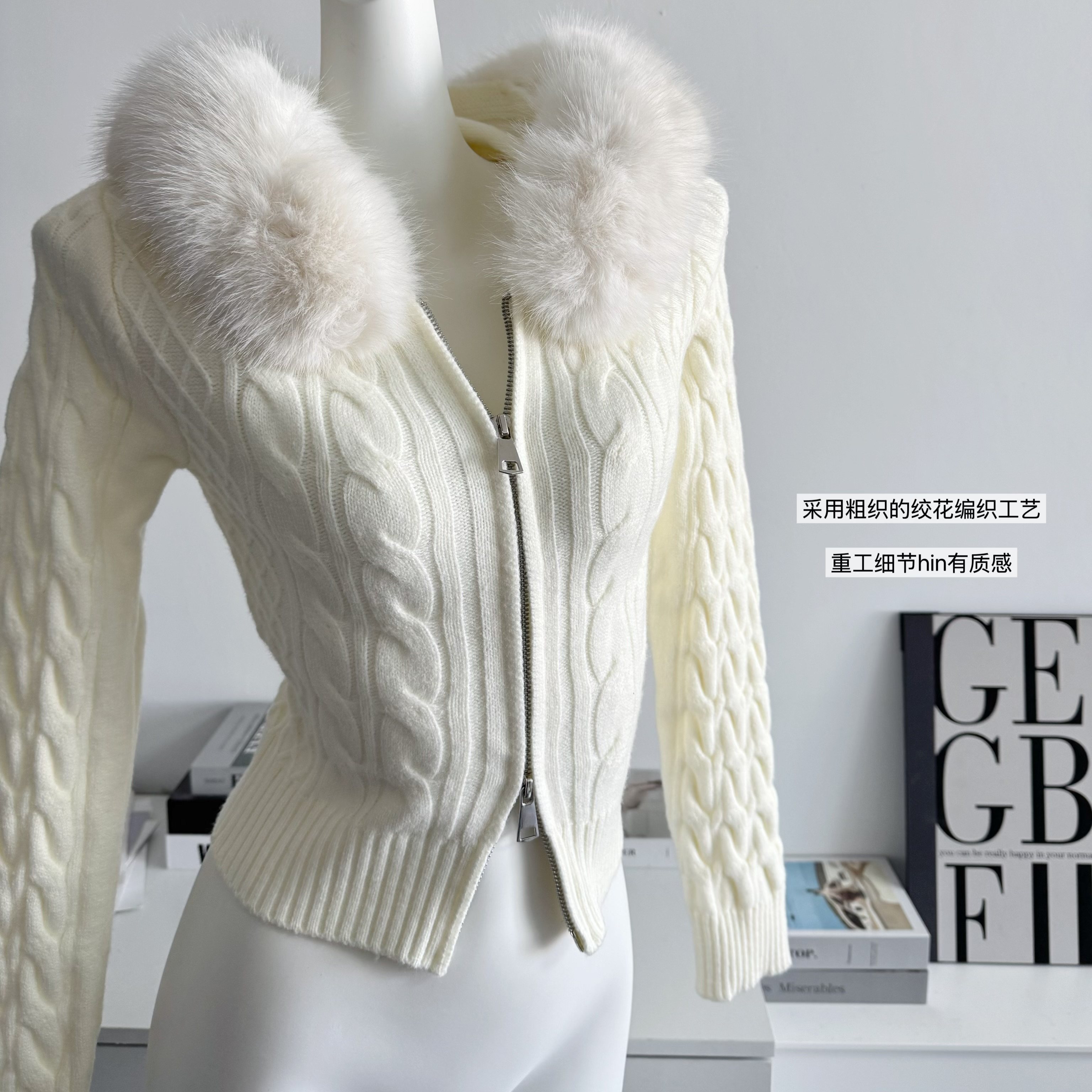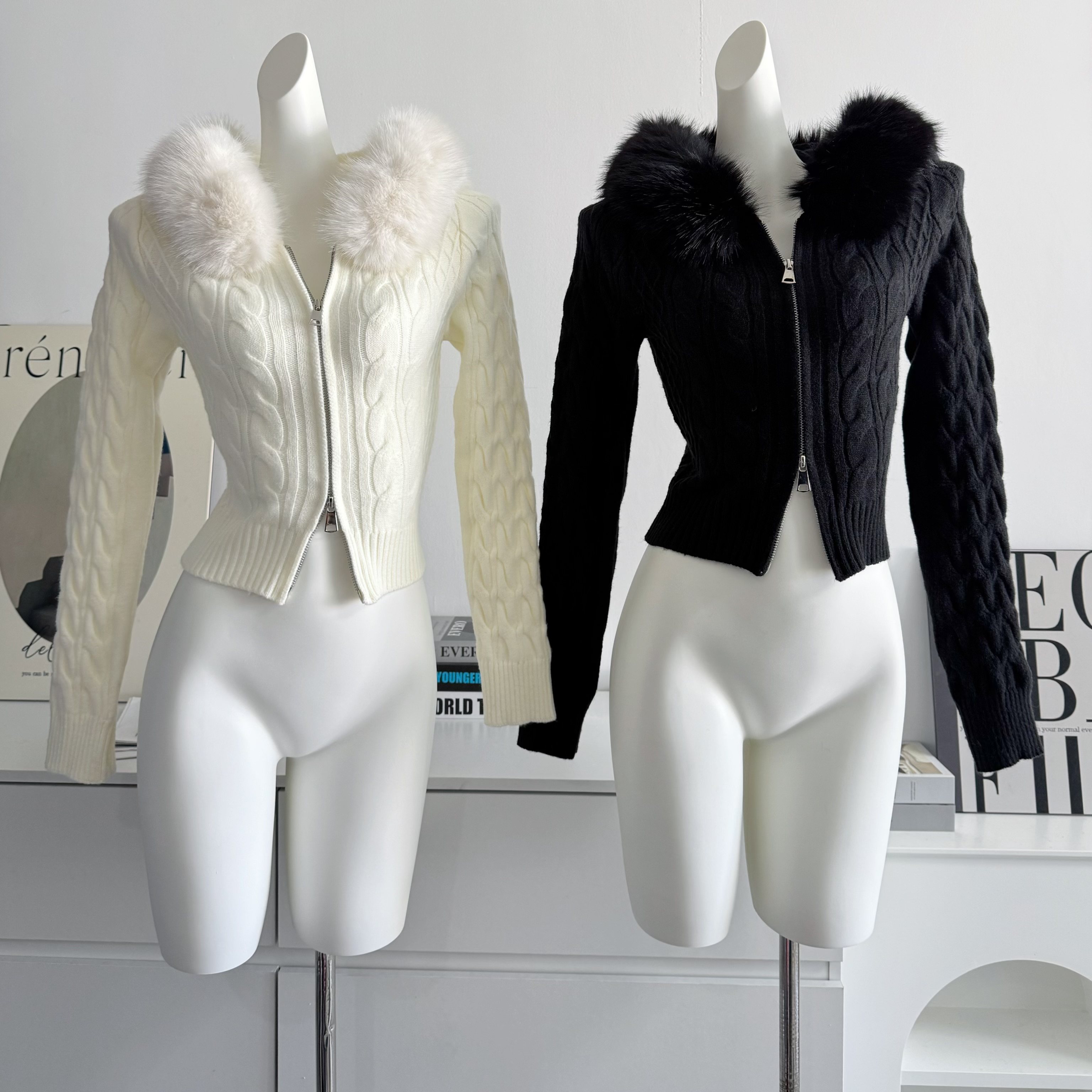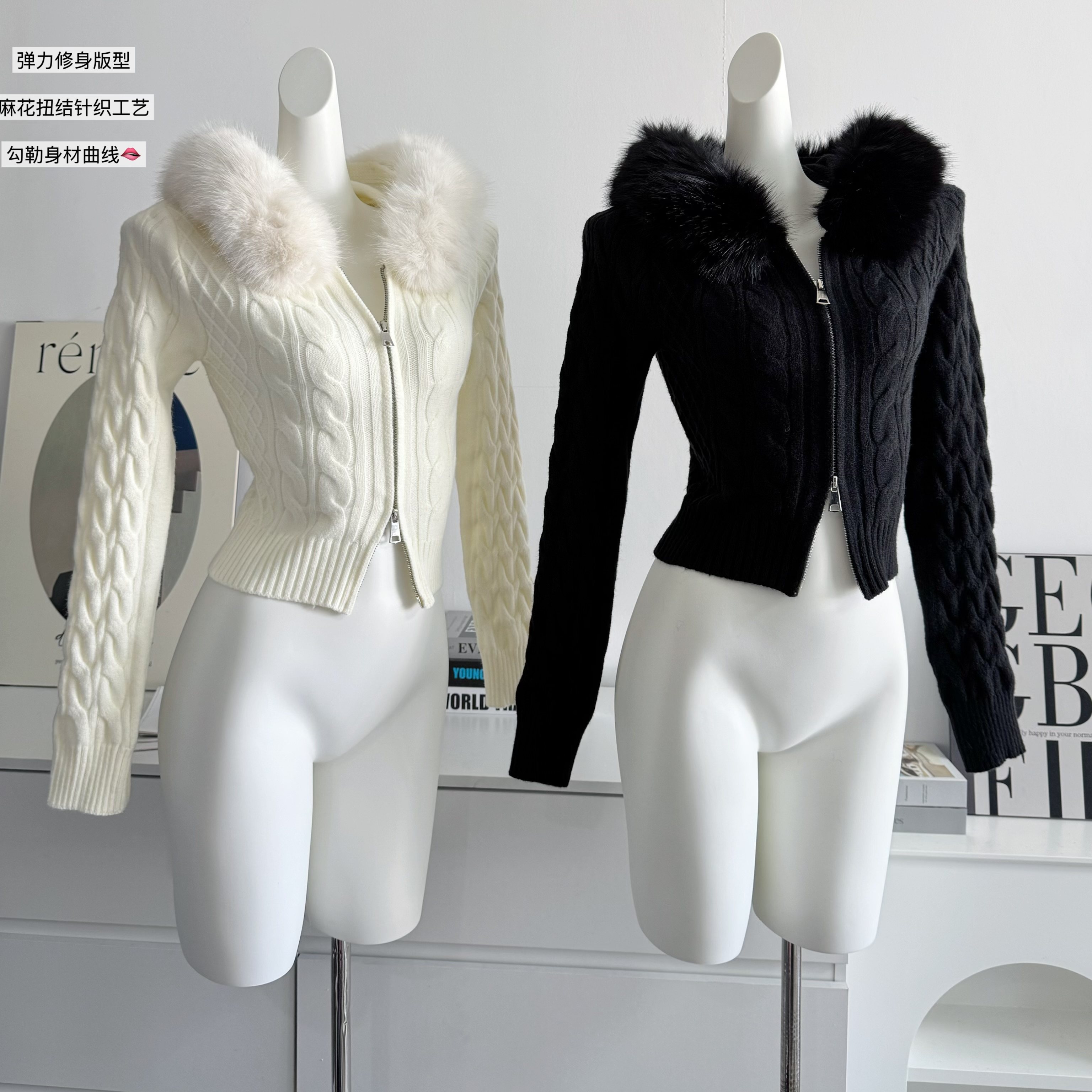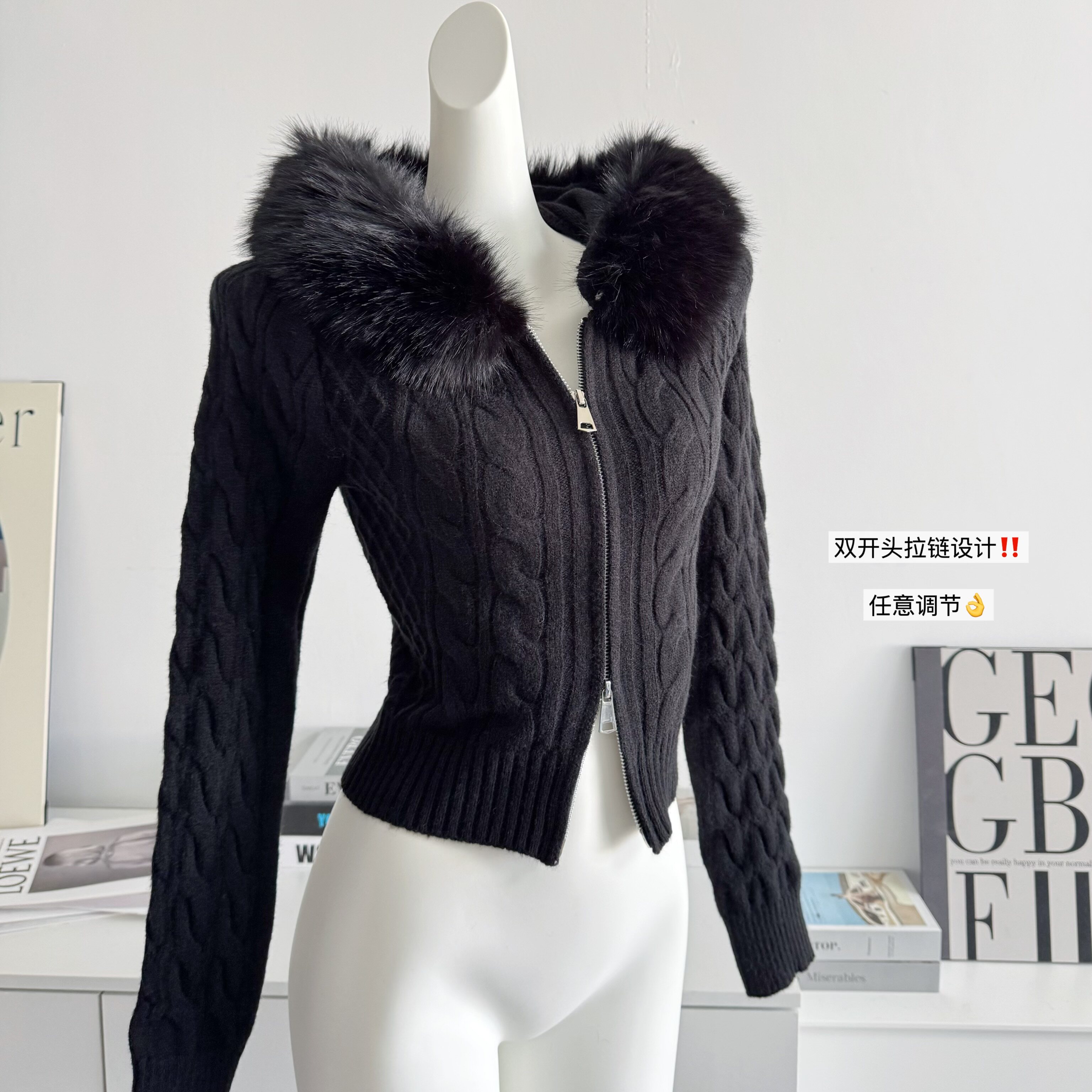 POPW 溫柔連帽開衫拉鍊毛衣女冬季新款優雅修身顯瘦短款針織衫