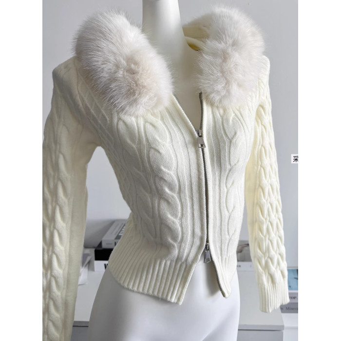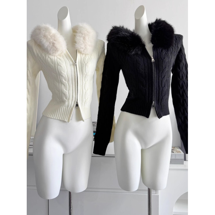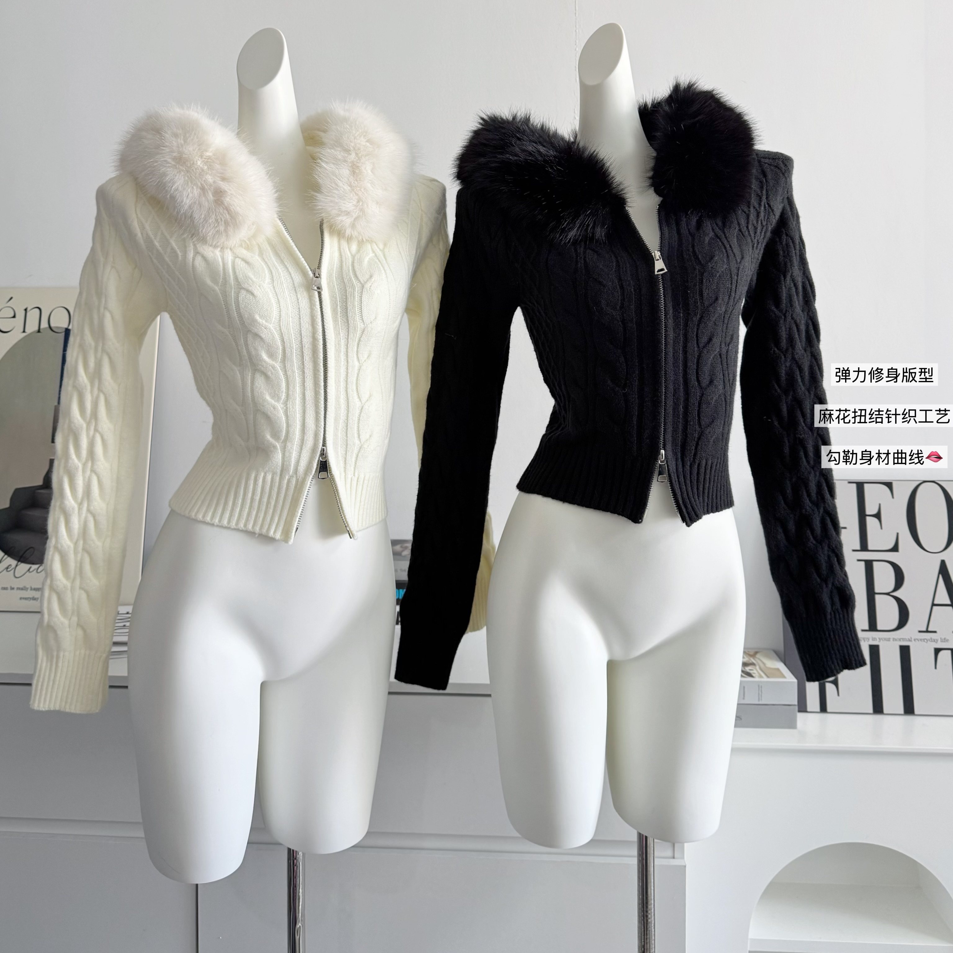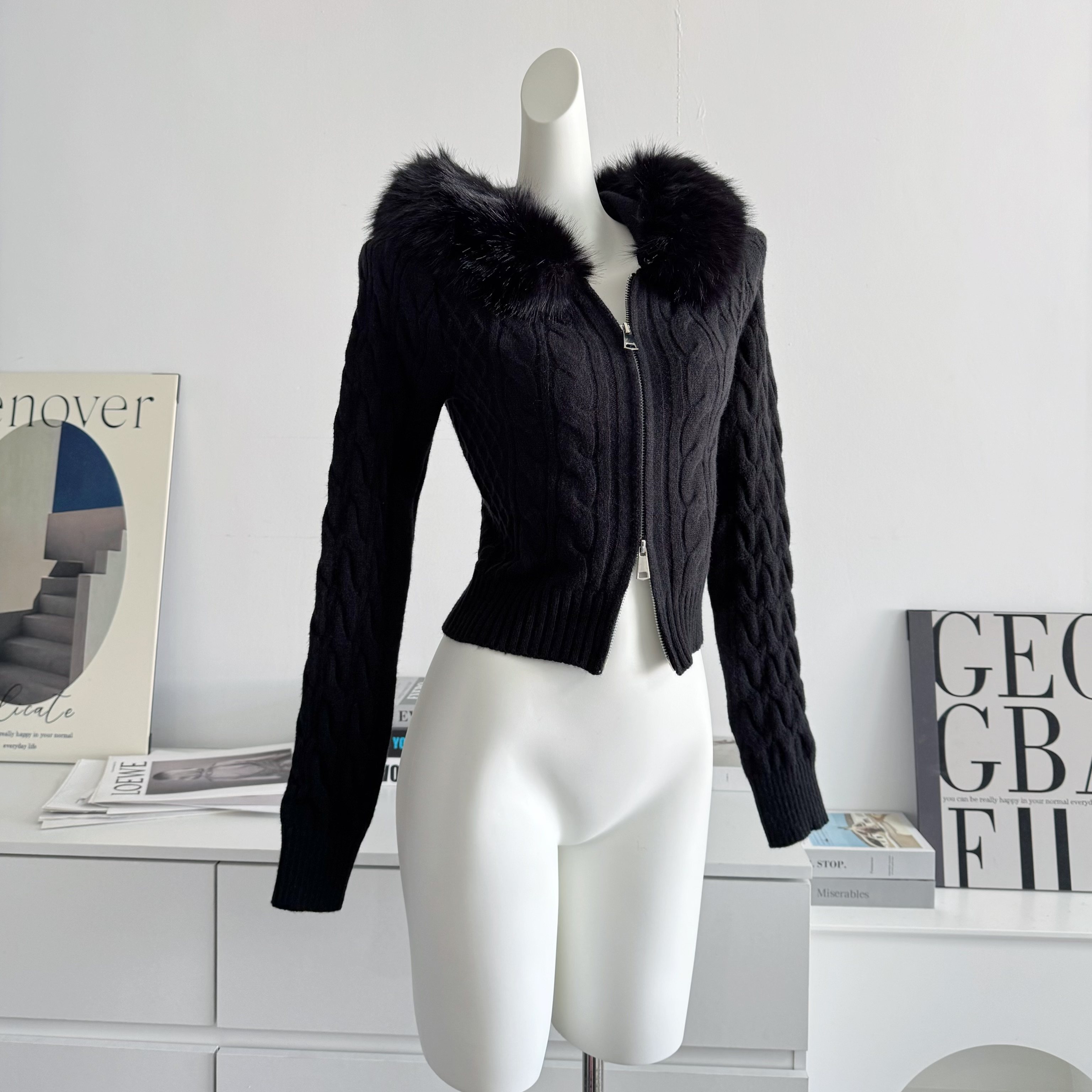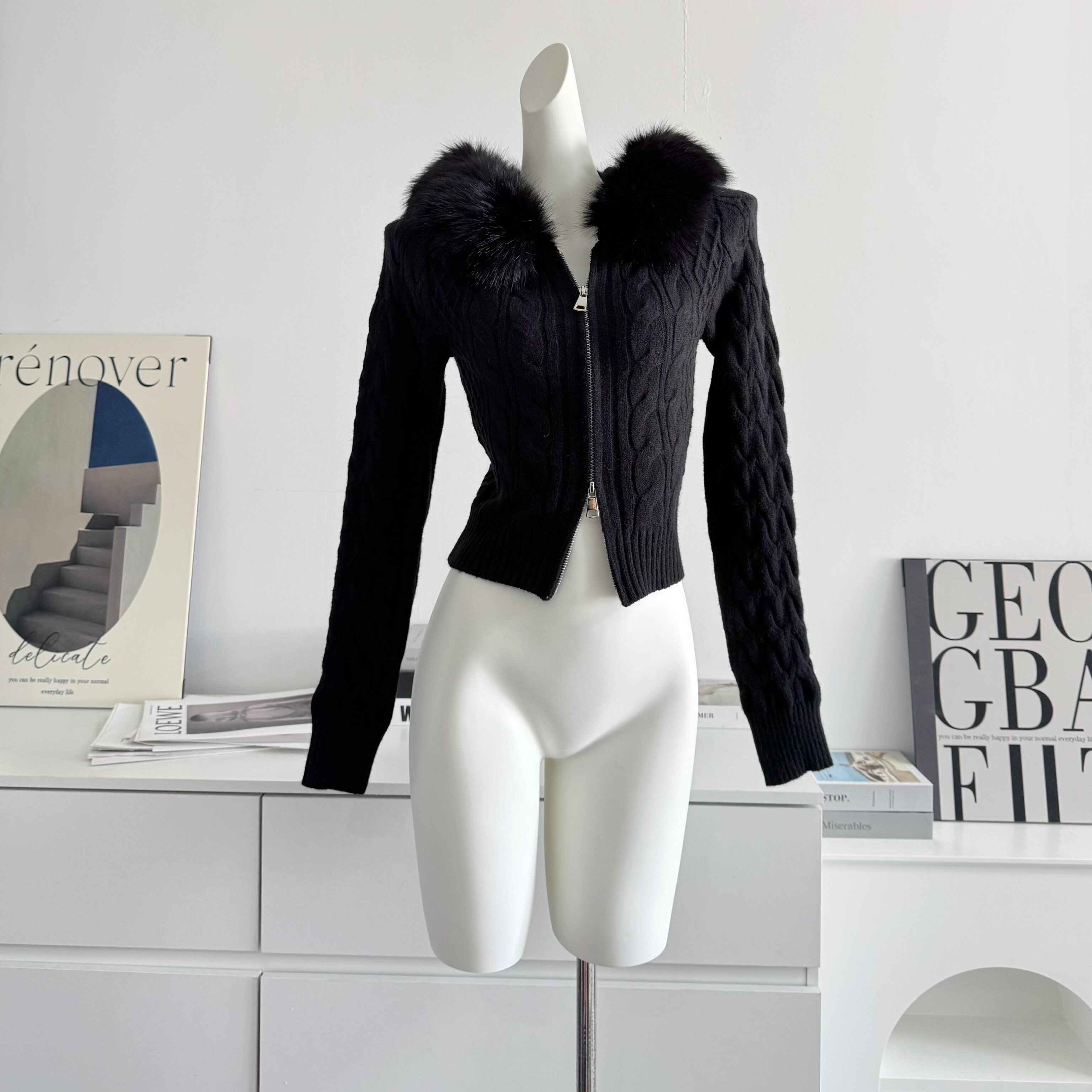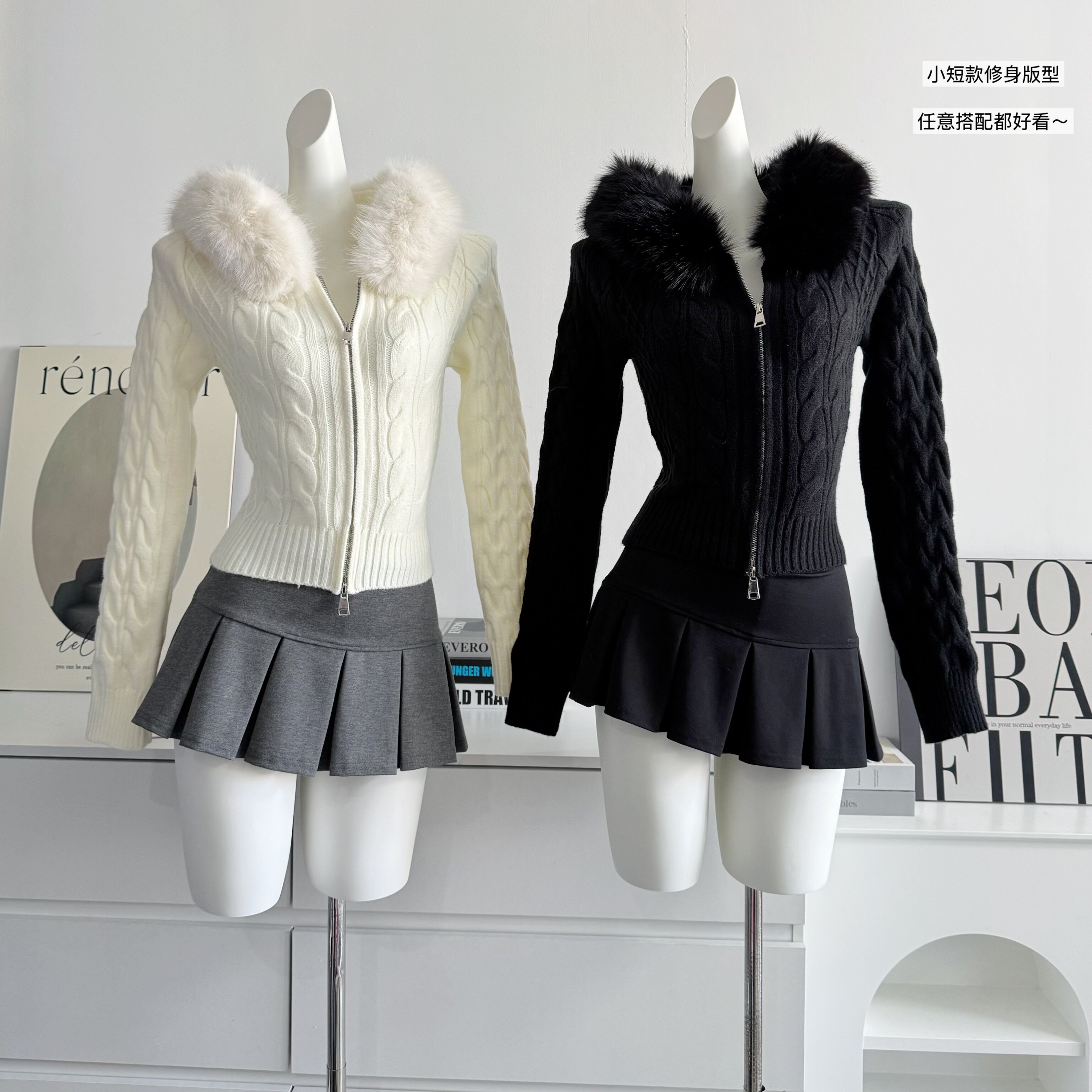 POPW 溫柔連帽開衫拉鍊毛衣女冬季新款優雅修身顯瘦短款針織衫