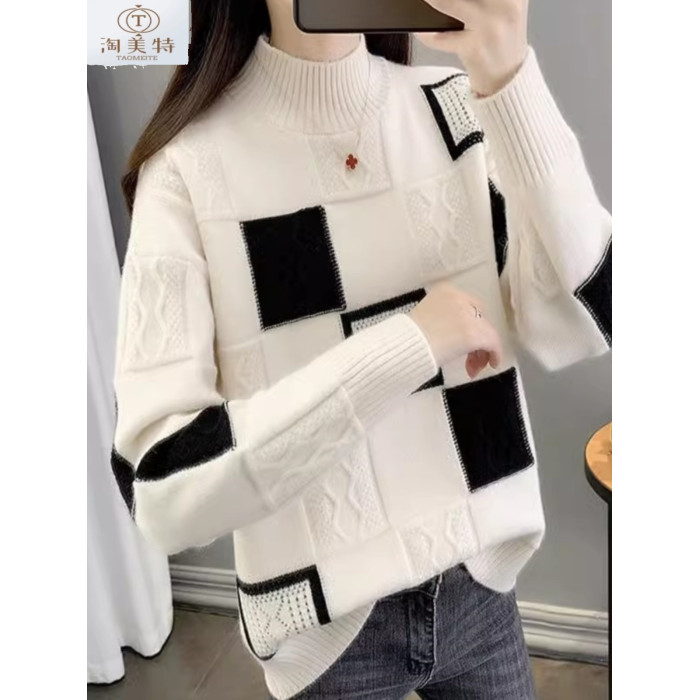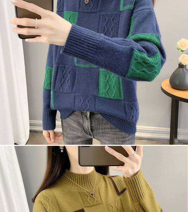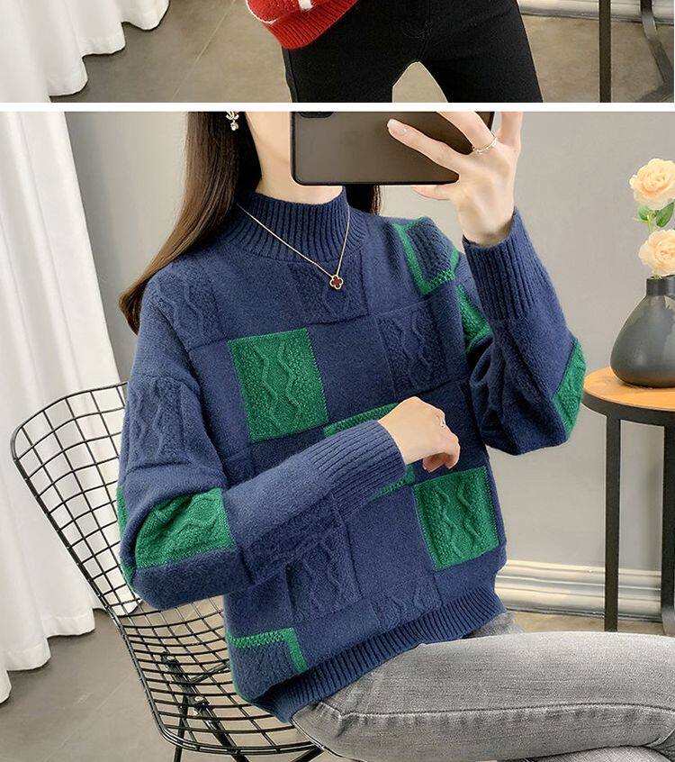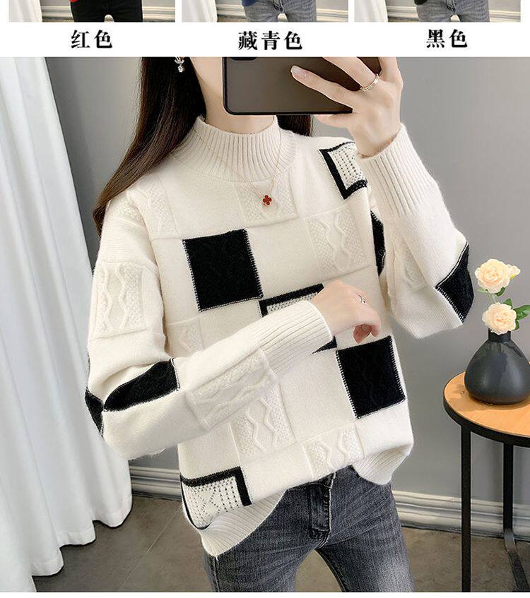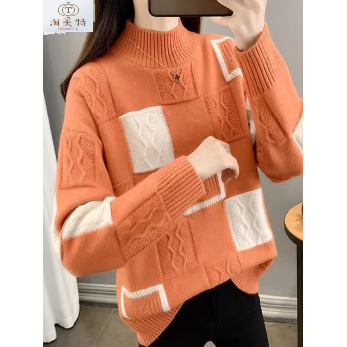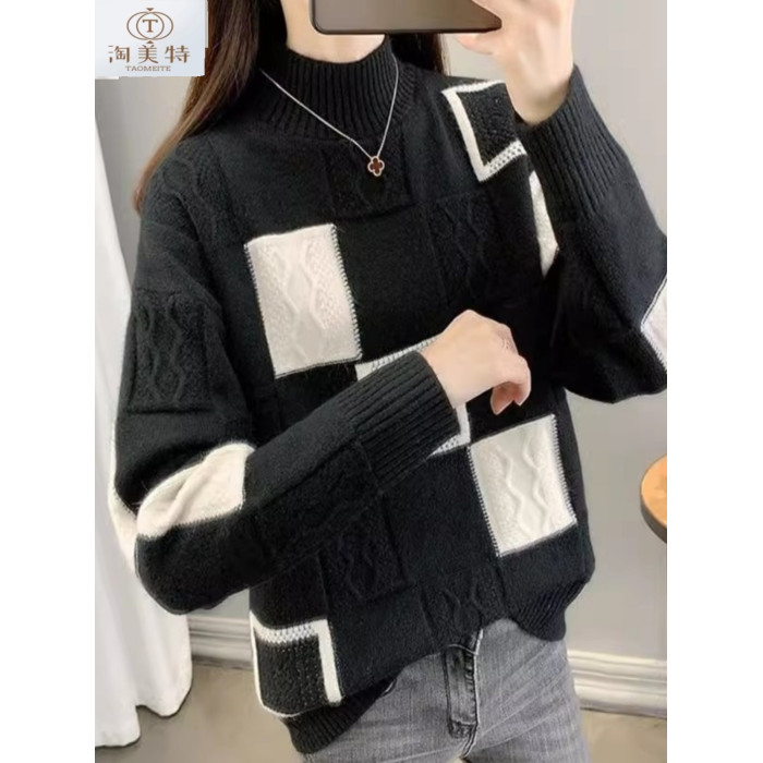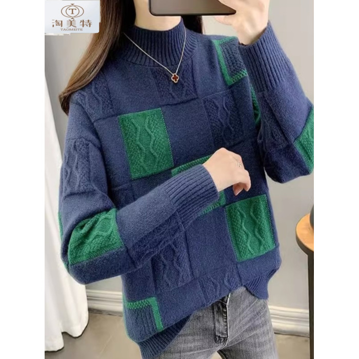 新款半高領毛衣女秋冬季2024年女士羊毛衫拼色時尚寬松針織打底衫