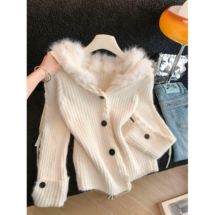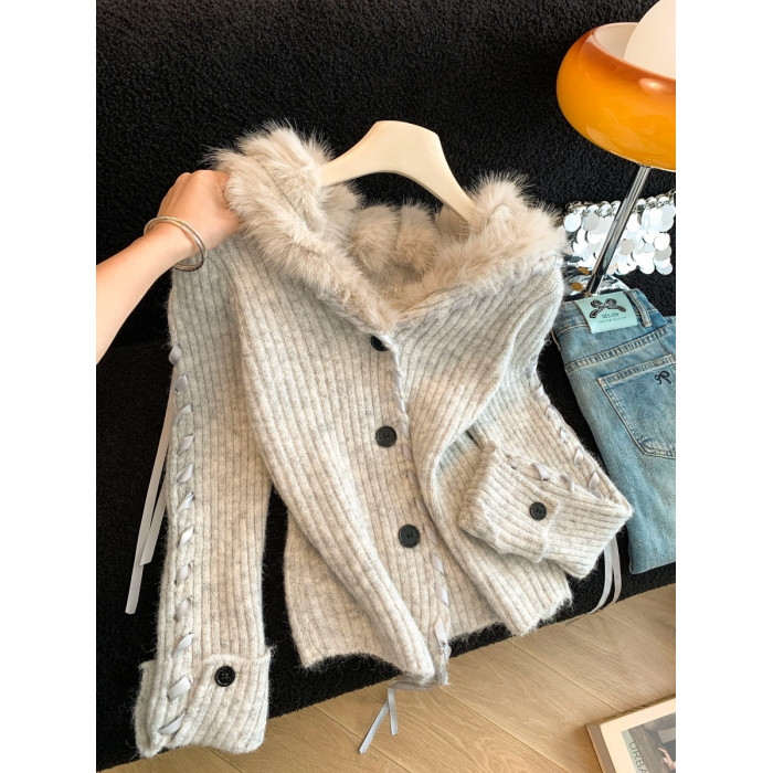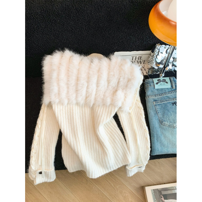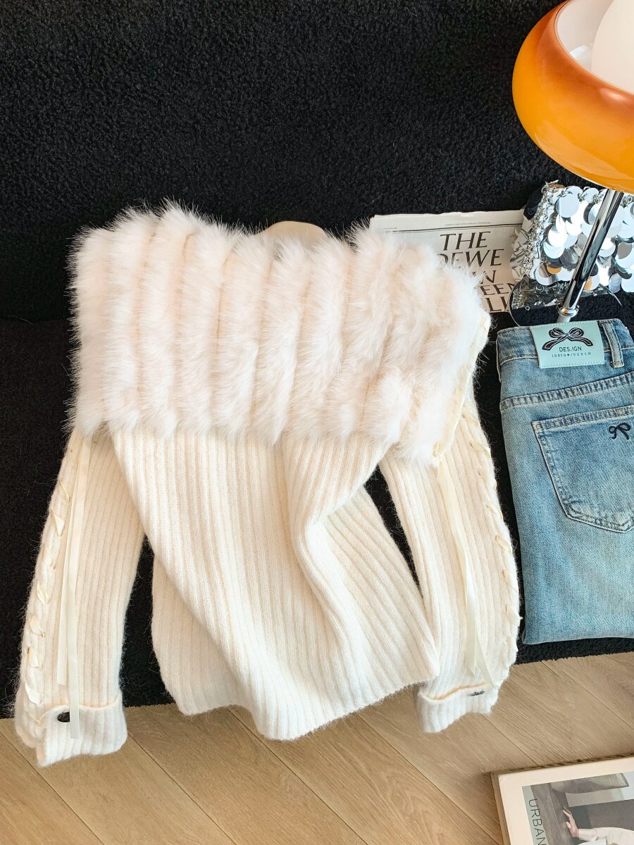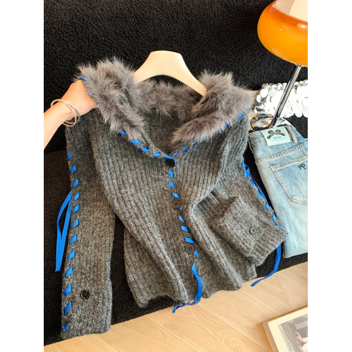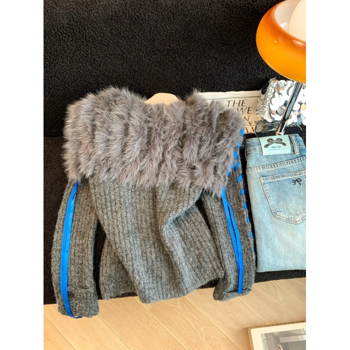 慵懶風仿狐狸毛座山雕坑條紋毛衣女裝秋冬花灰色軟糯針織外套上衣