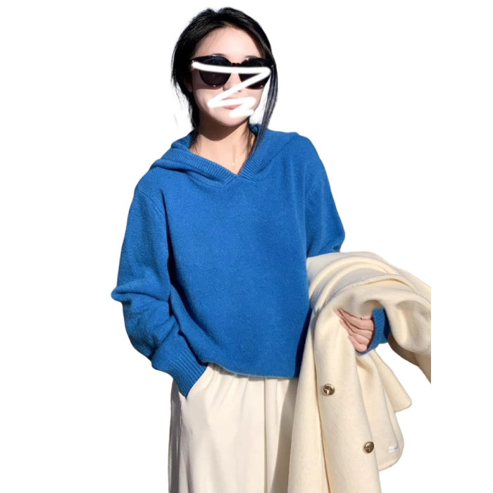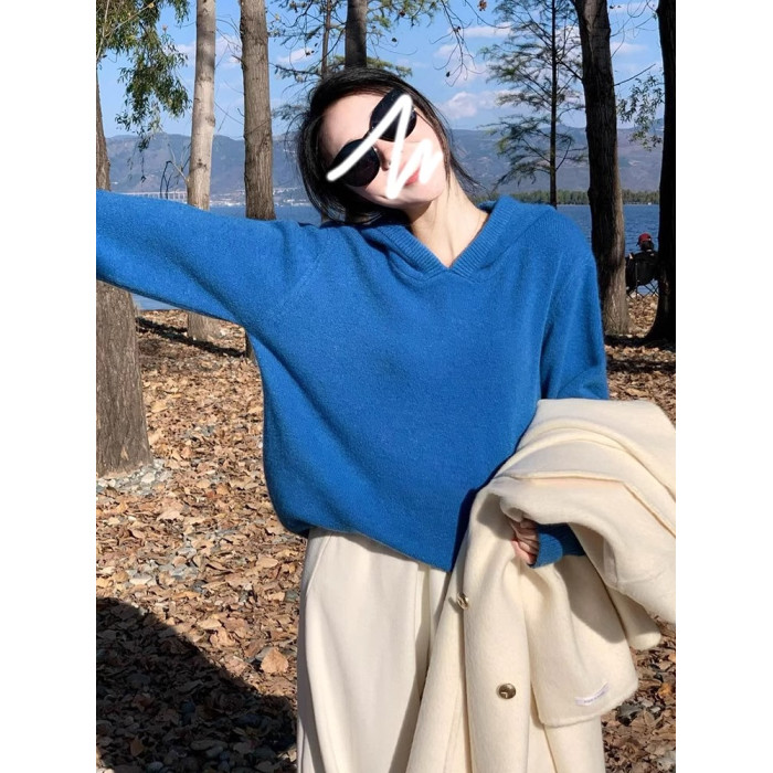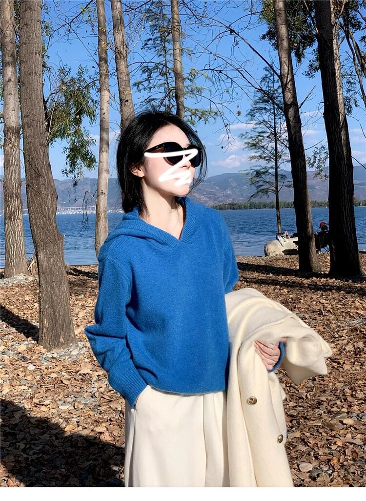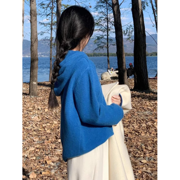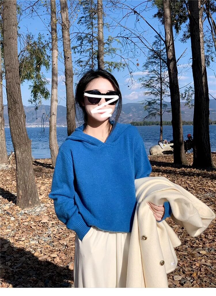 克萊因藍色連帽毛衣女深秋初冬季穿搭2025新款慵懶高級感針織上衣