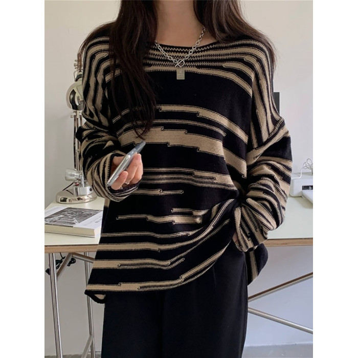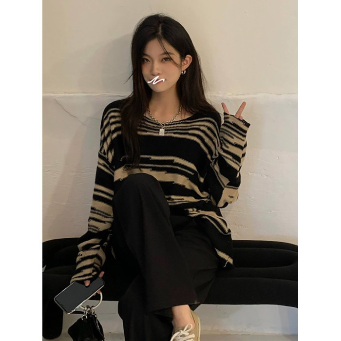 韓版寬松復古條紋針織毛衣女設計感小衆秋冬薄款慵懶風上衣打底衫