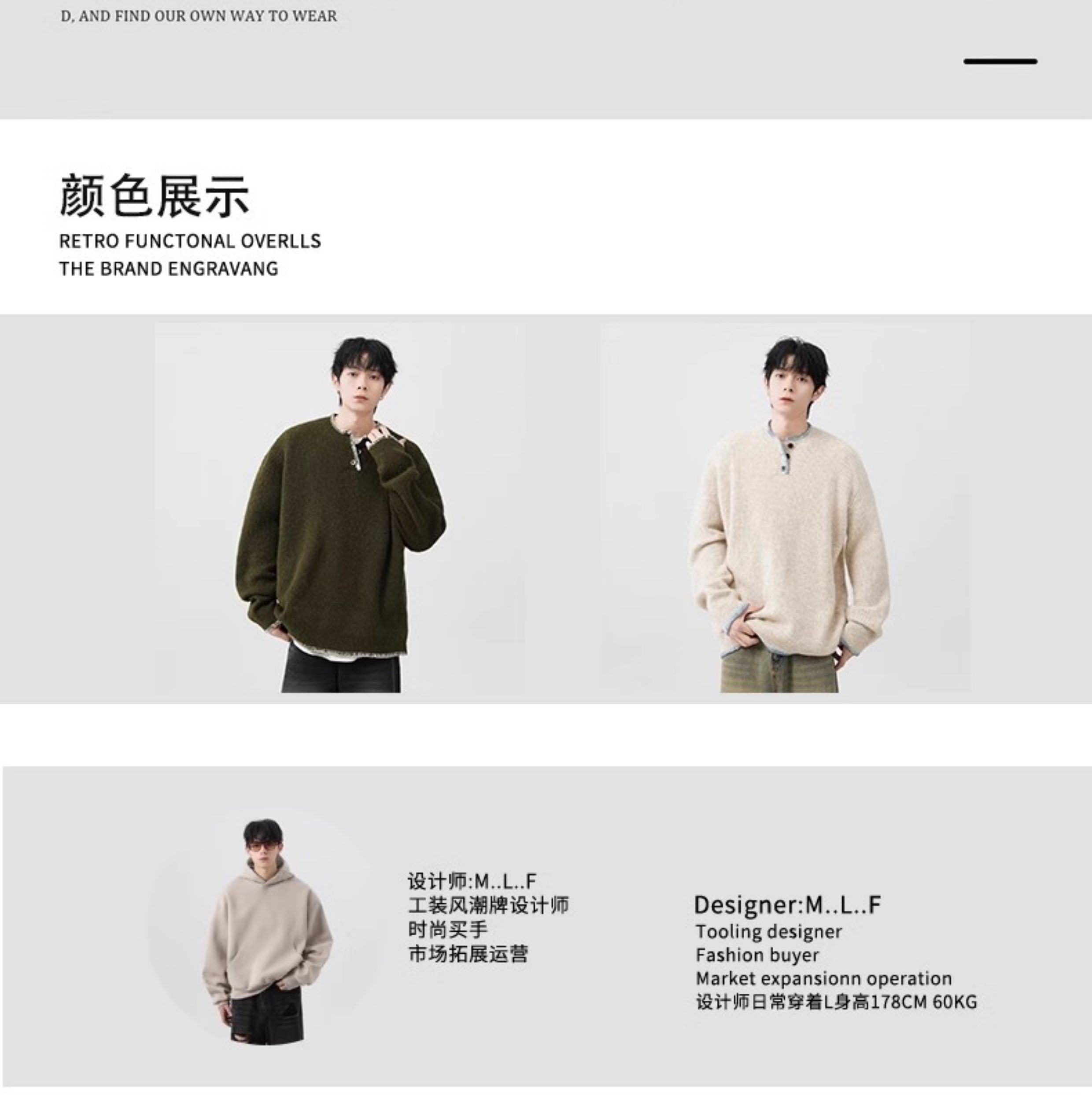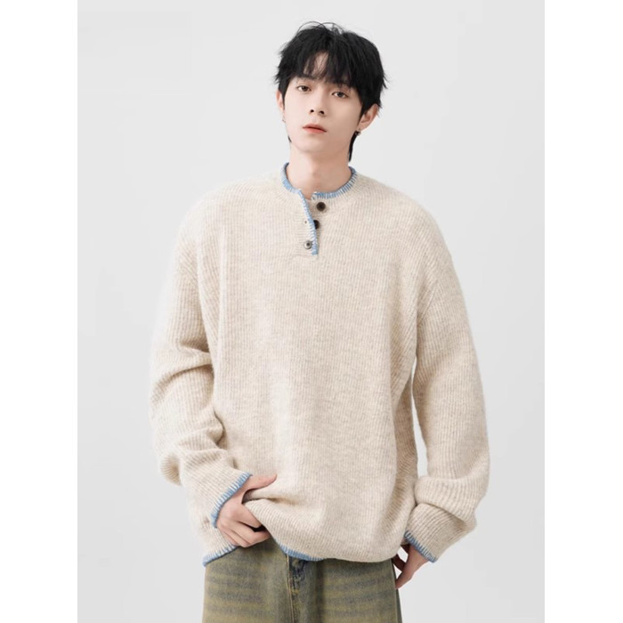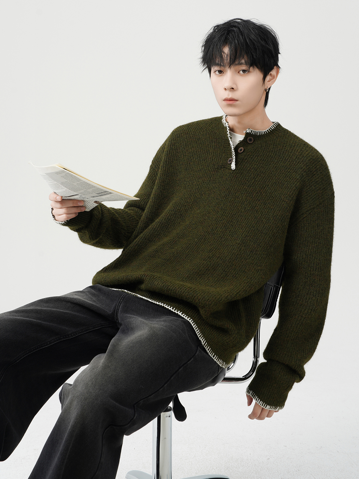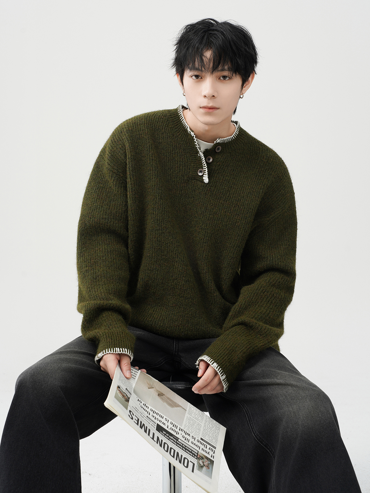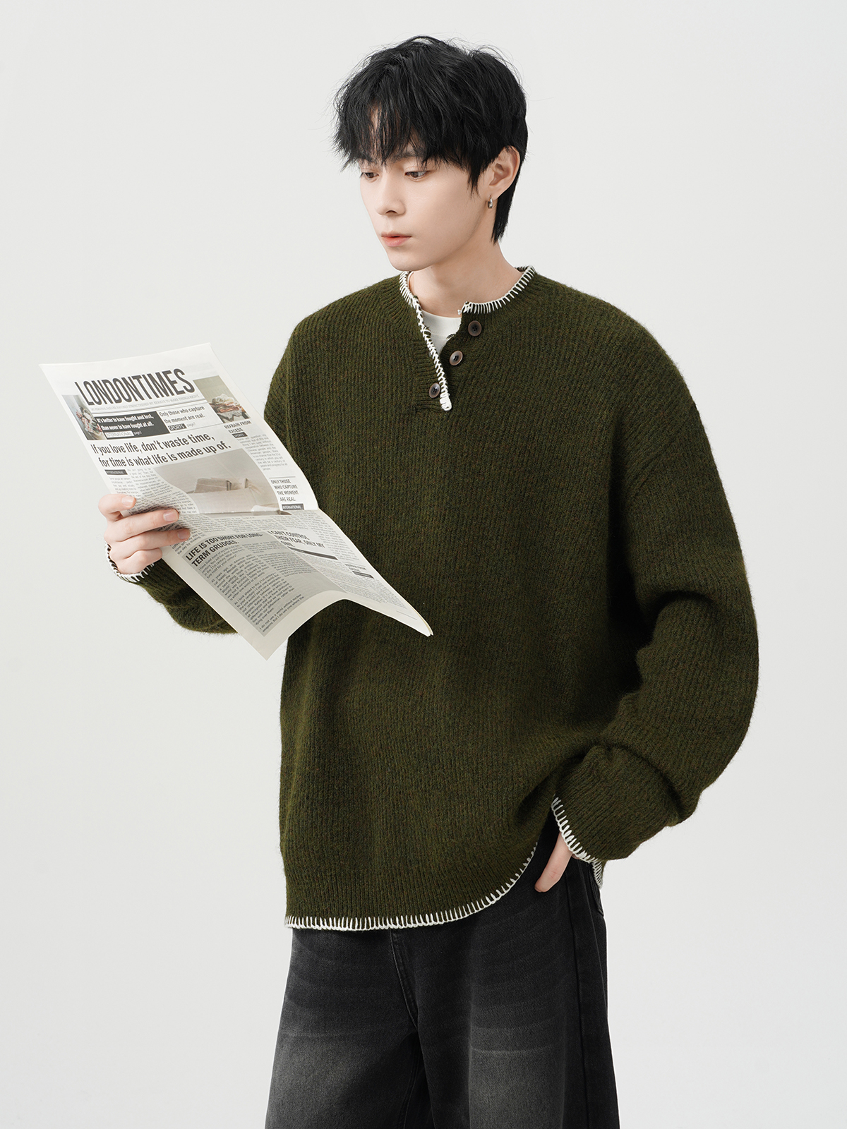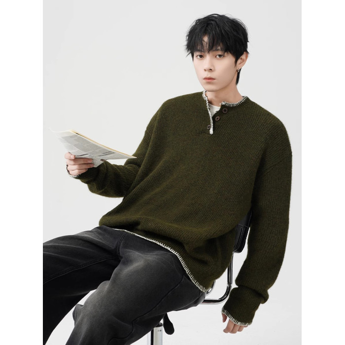 小衆設計感亨利領毛衣男秋冬復古氛圍感寬松針織衫慵懶風情侶外套