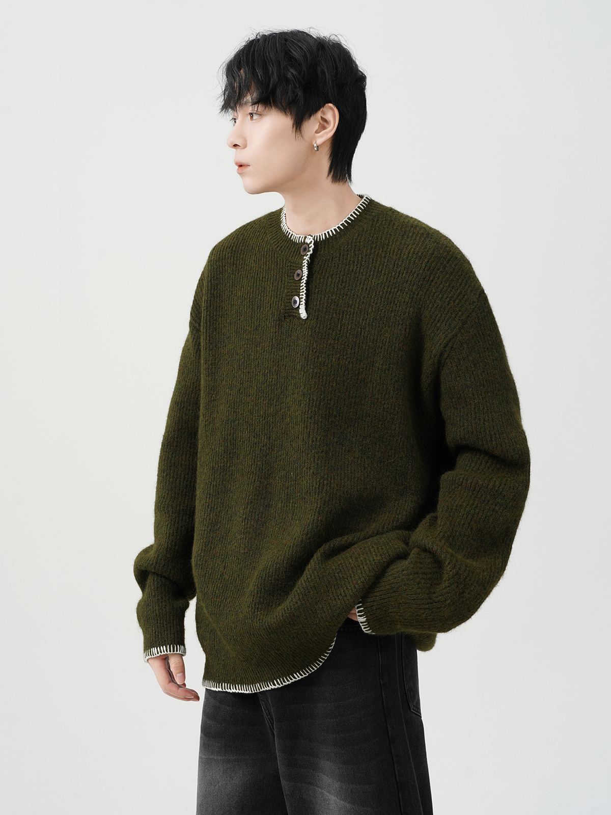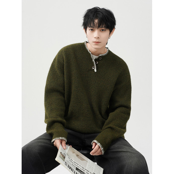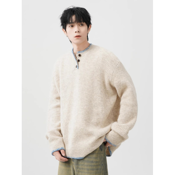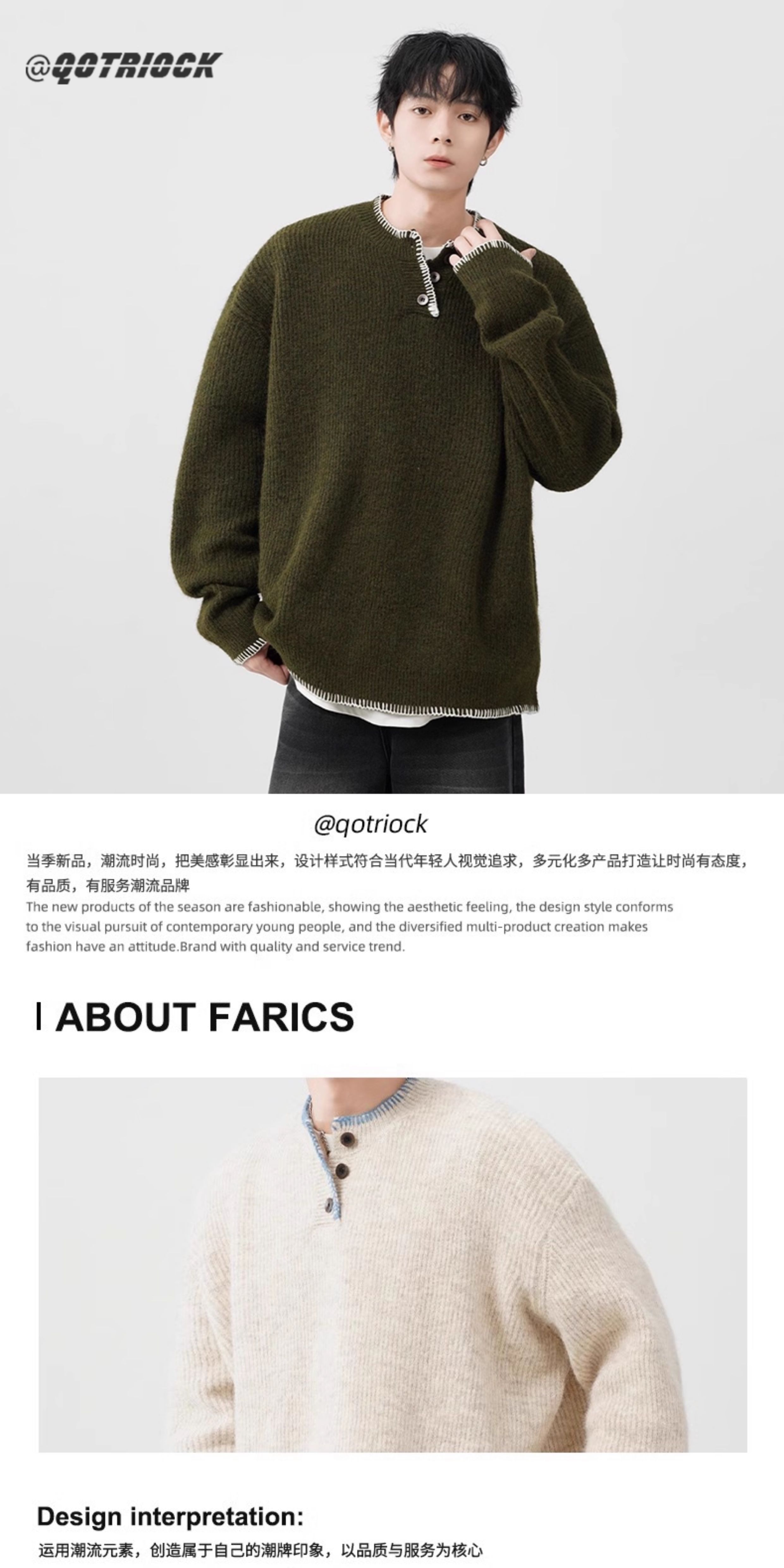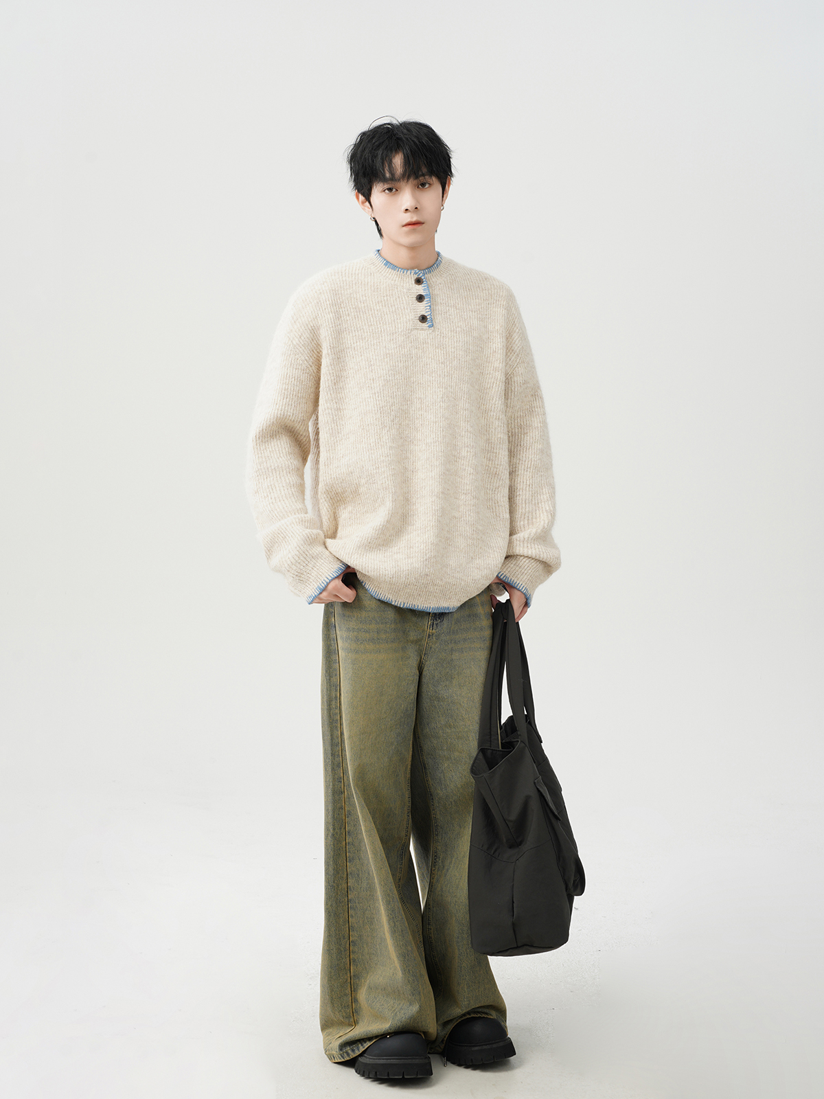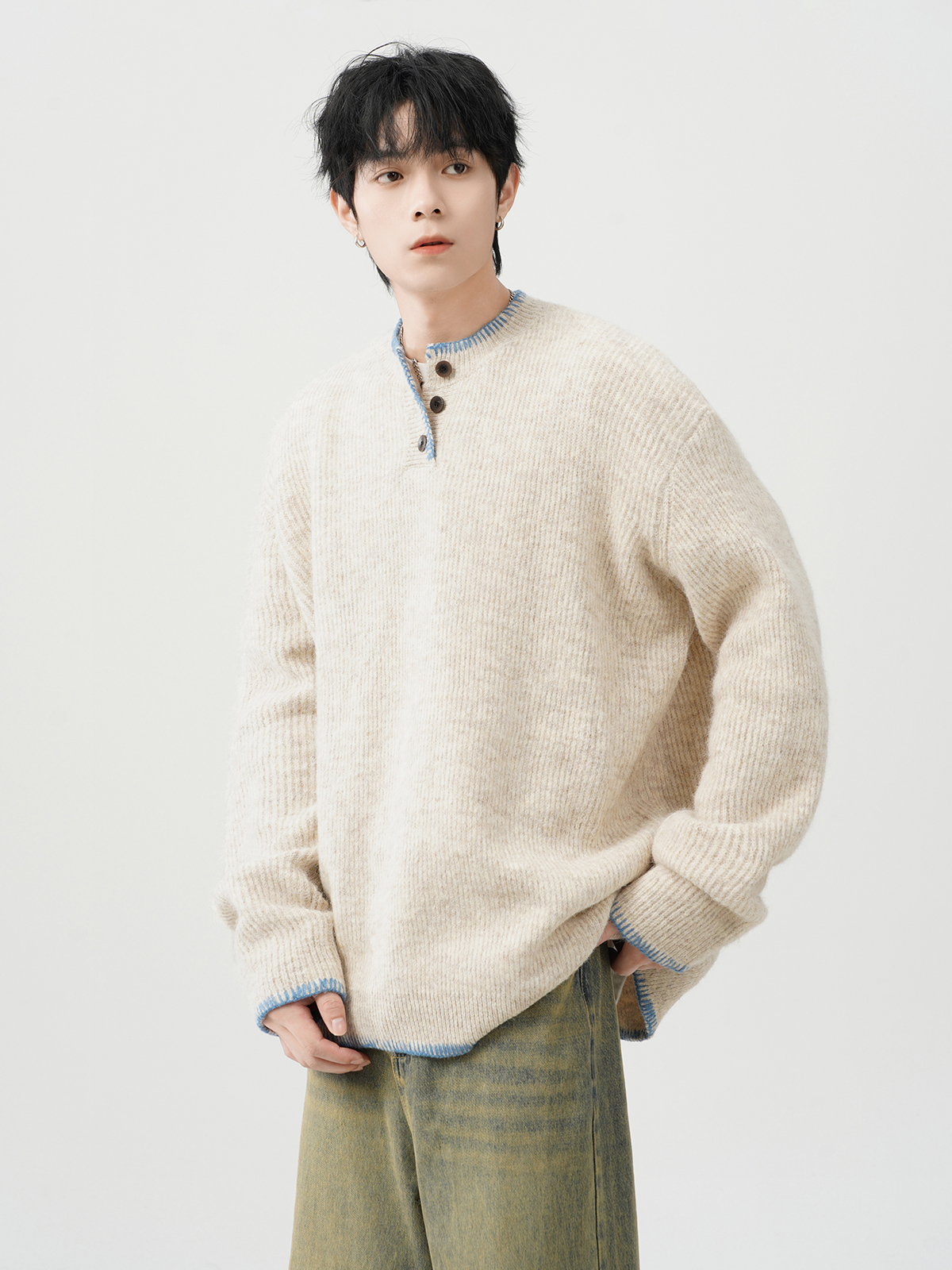 小衆設計感亨利領毛衣男秋冬復古氛圍感寬松針織衫慵懶風情侶外套
