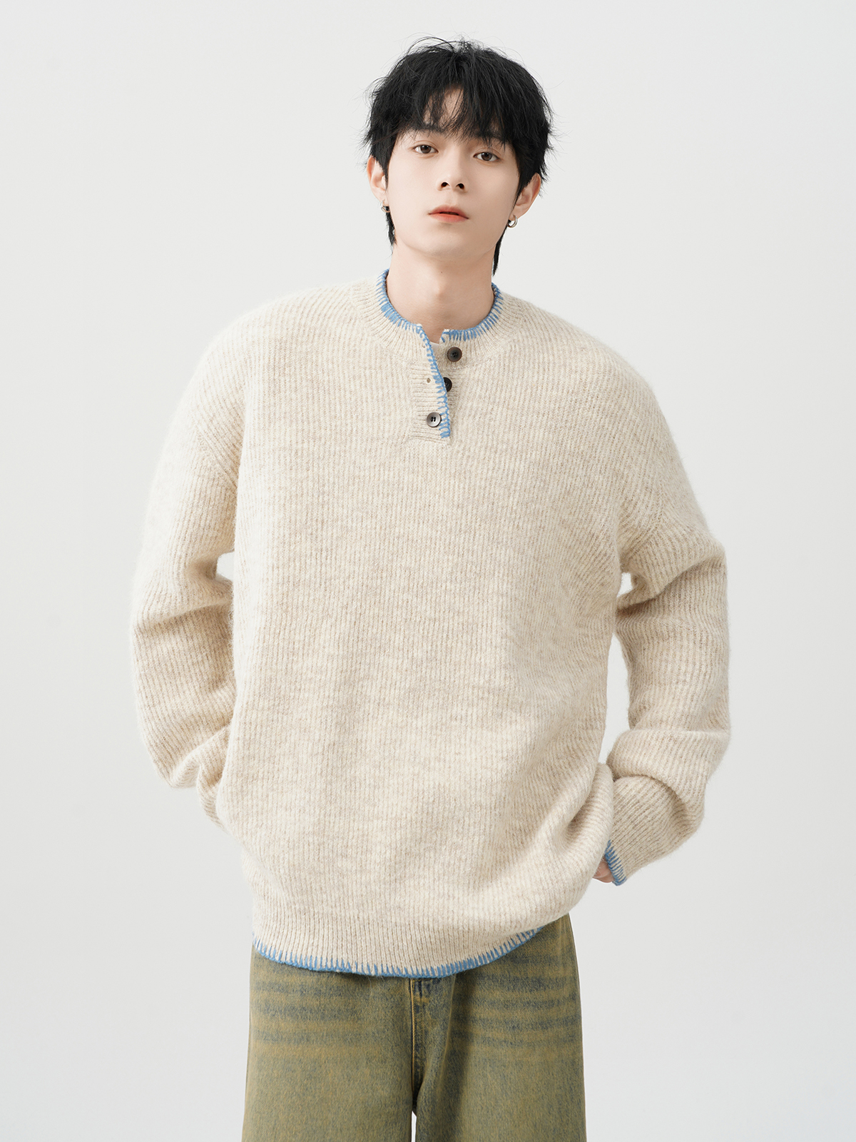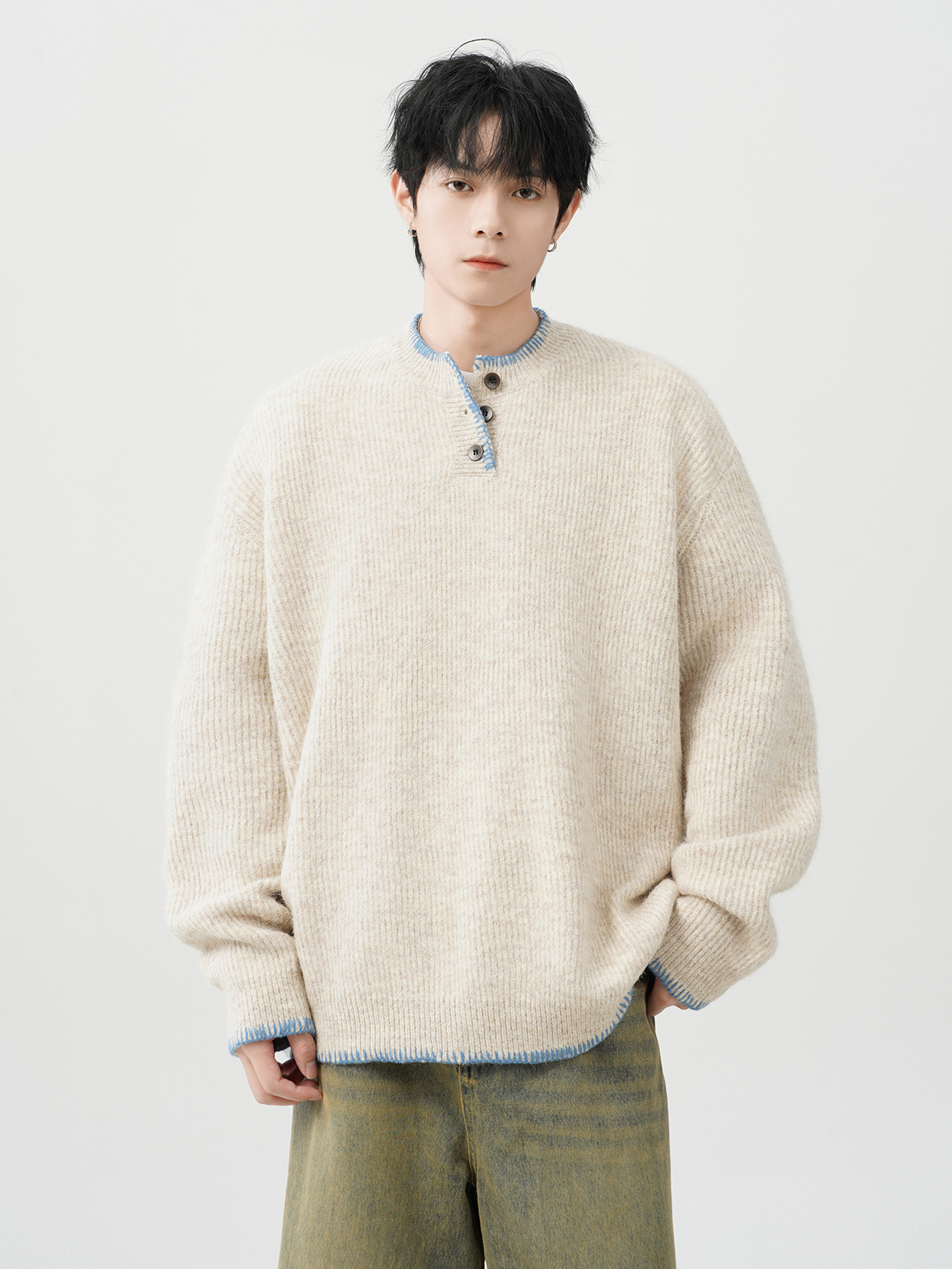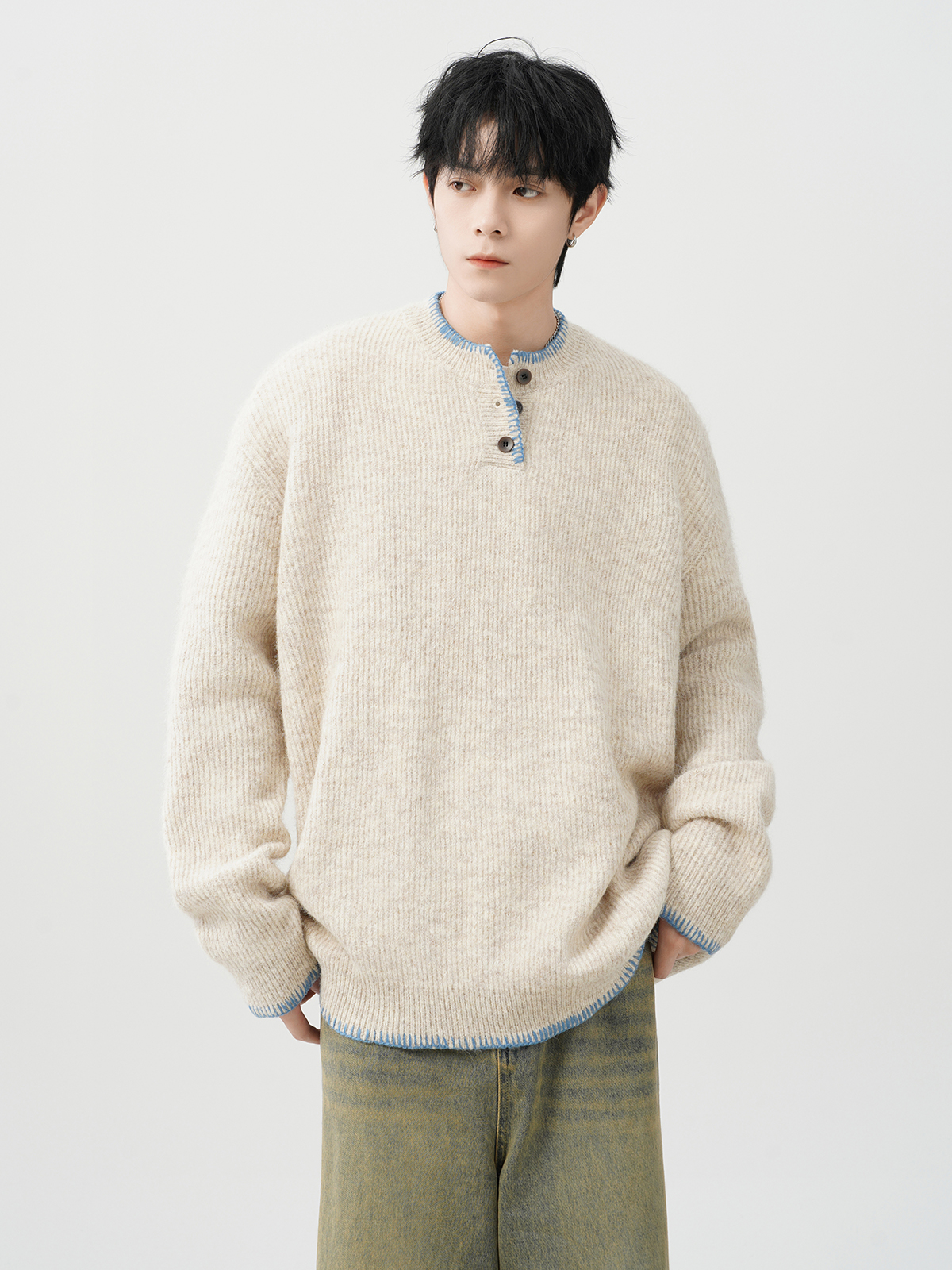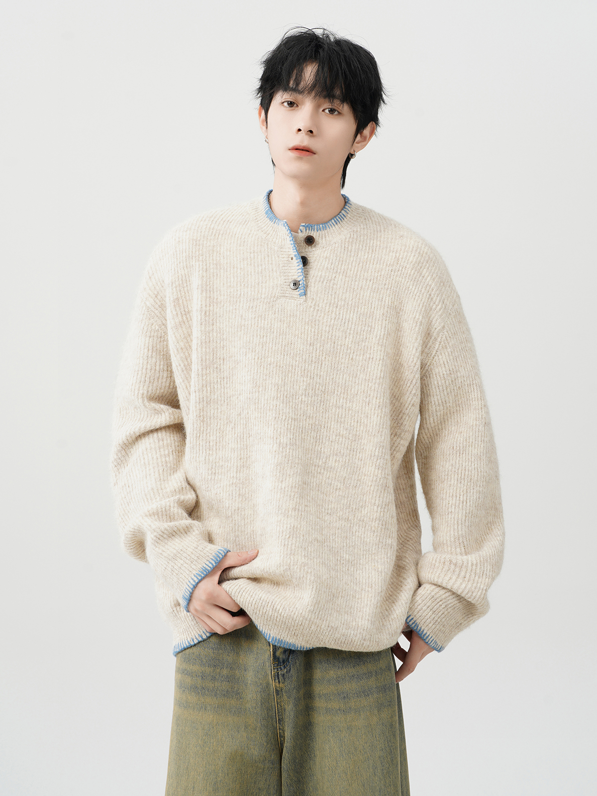 小衆設計感亨利領毛衣男秋冬復古氛圍感寬松針織衫慵懶風情侶外套