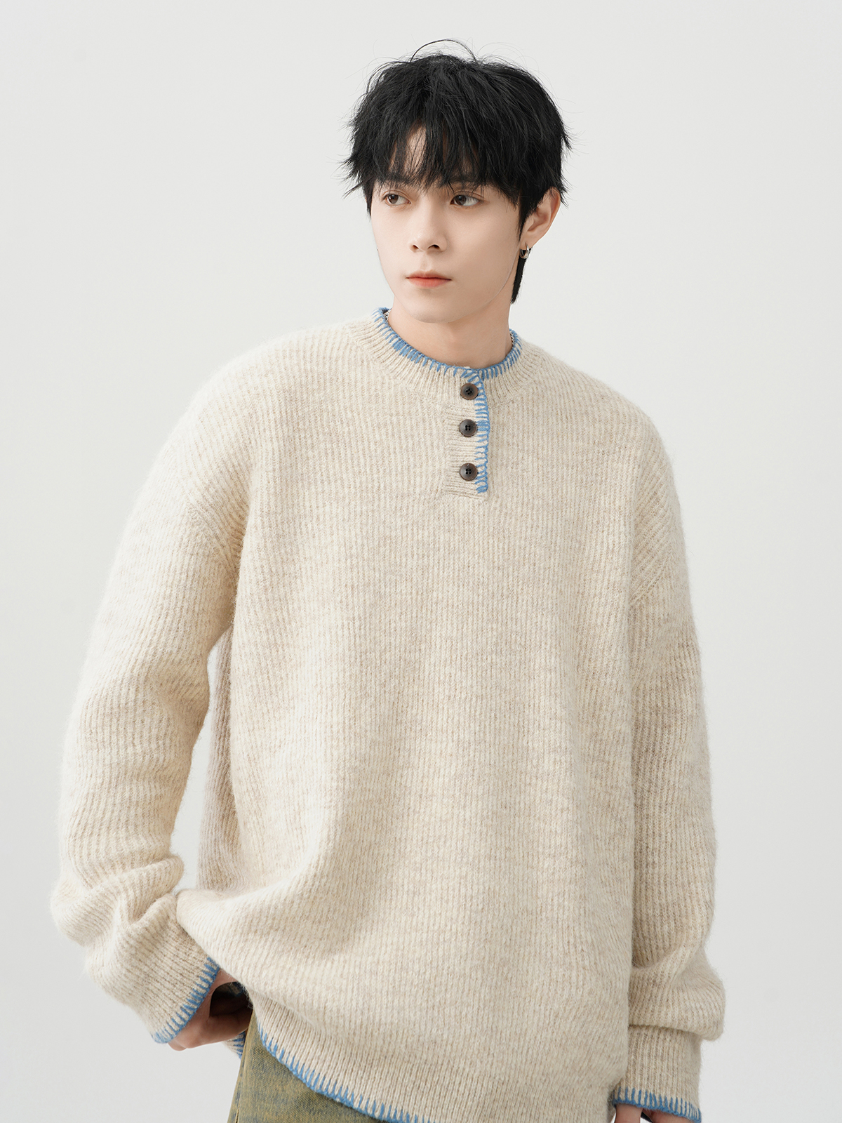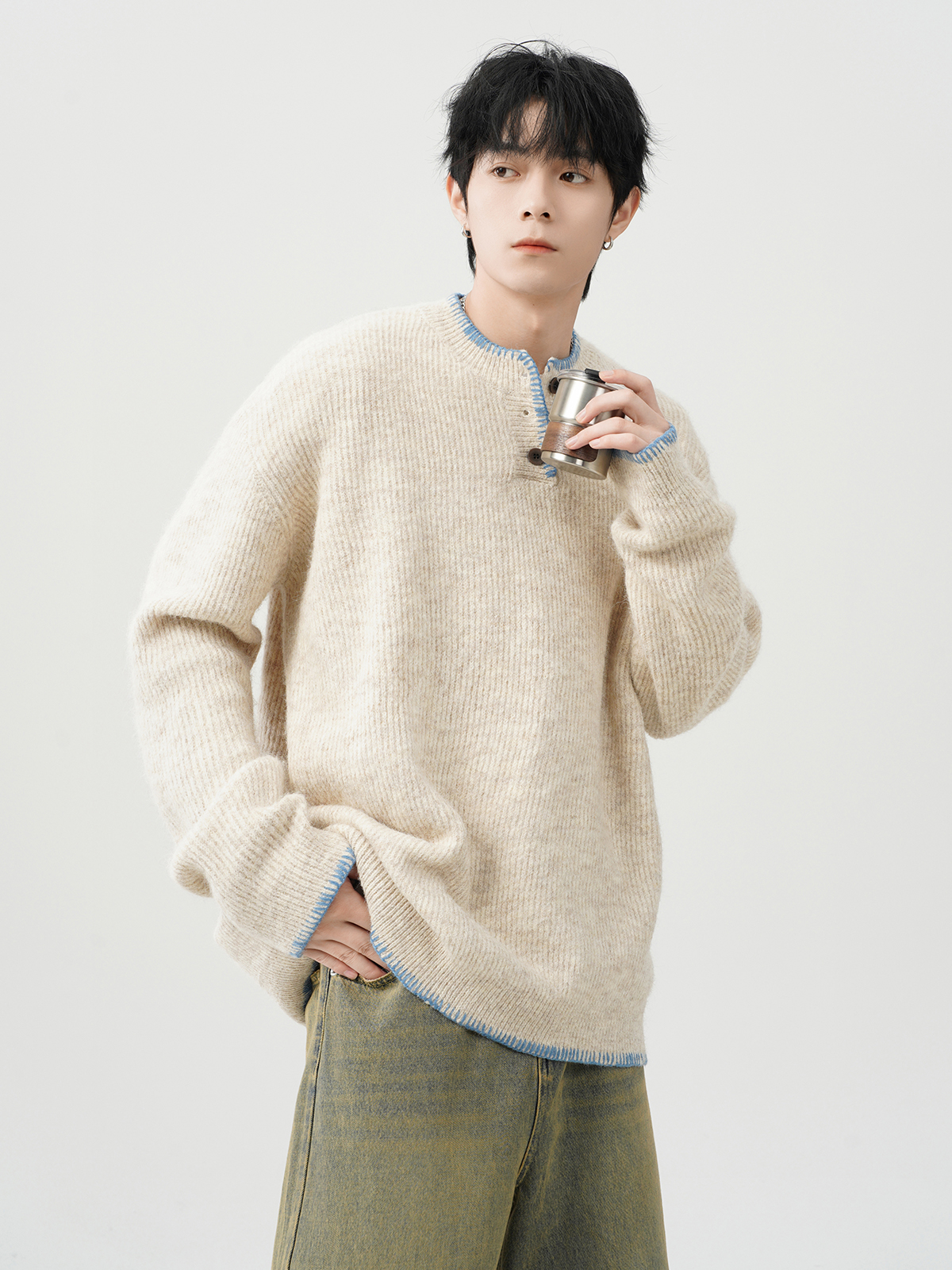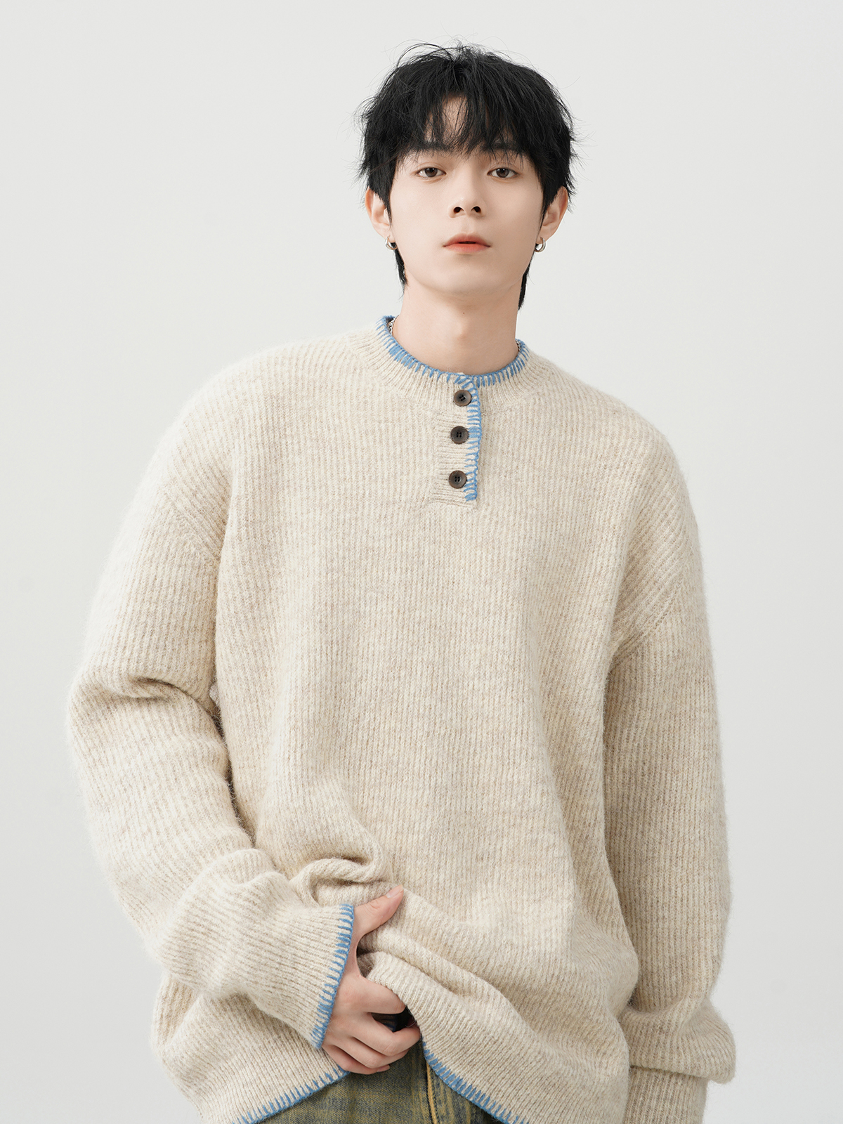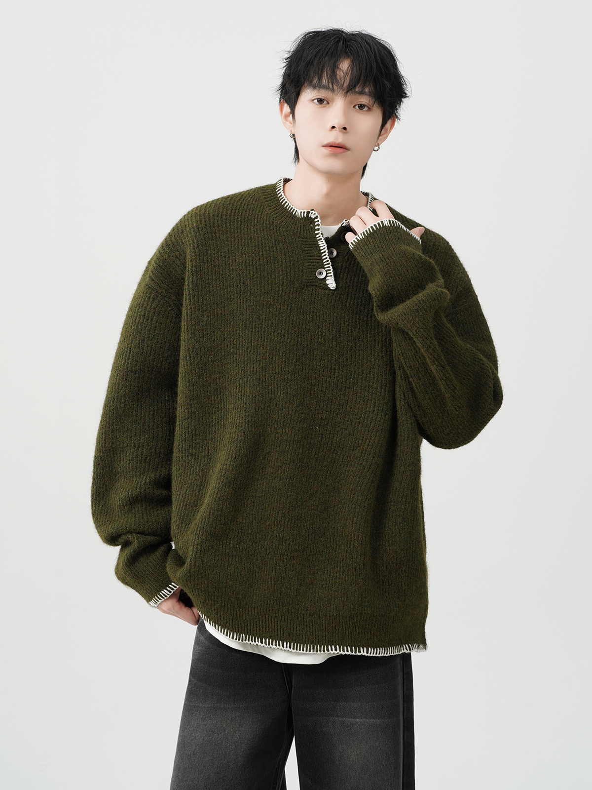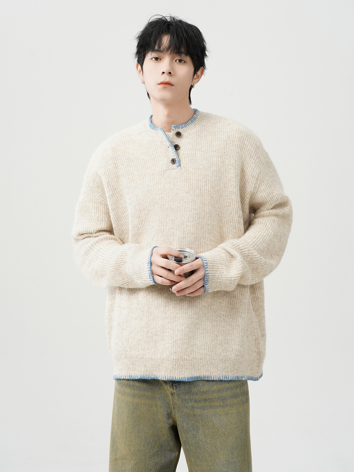 小衆設計感亨利領毛衣男秋冬復古氛圍感寬松針織衫慵懶風情侶外套