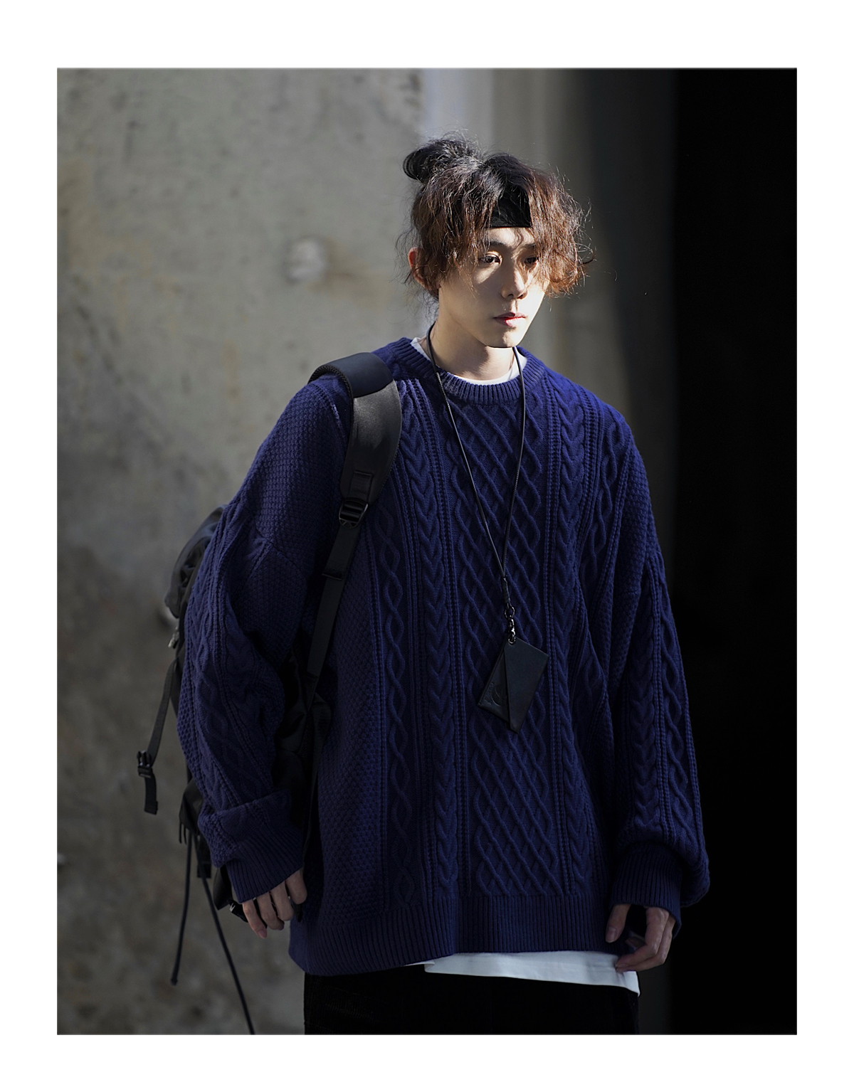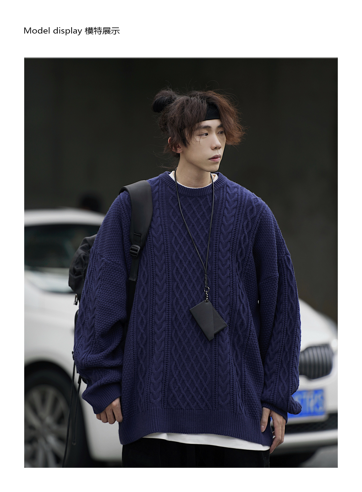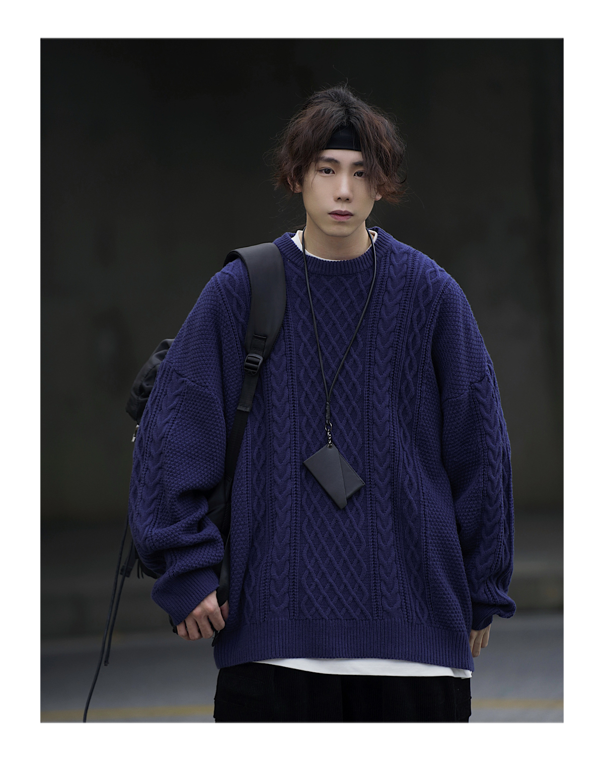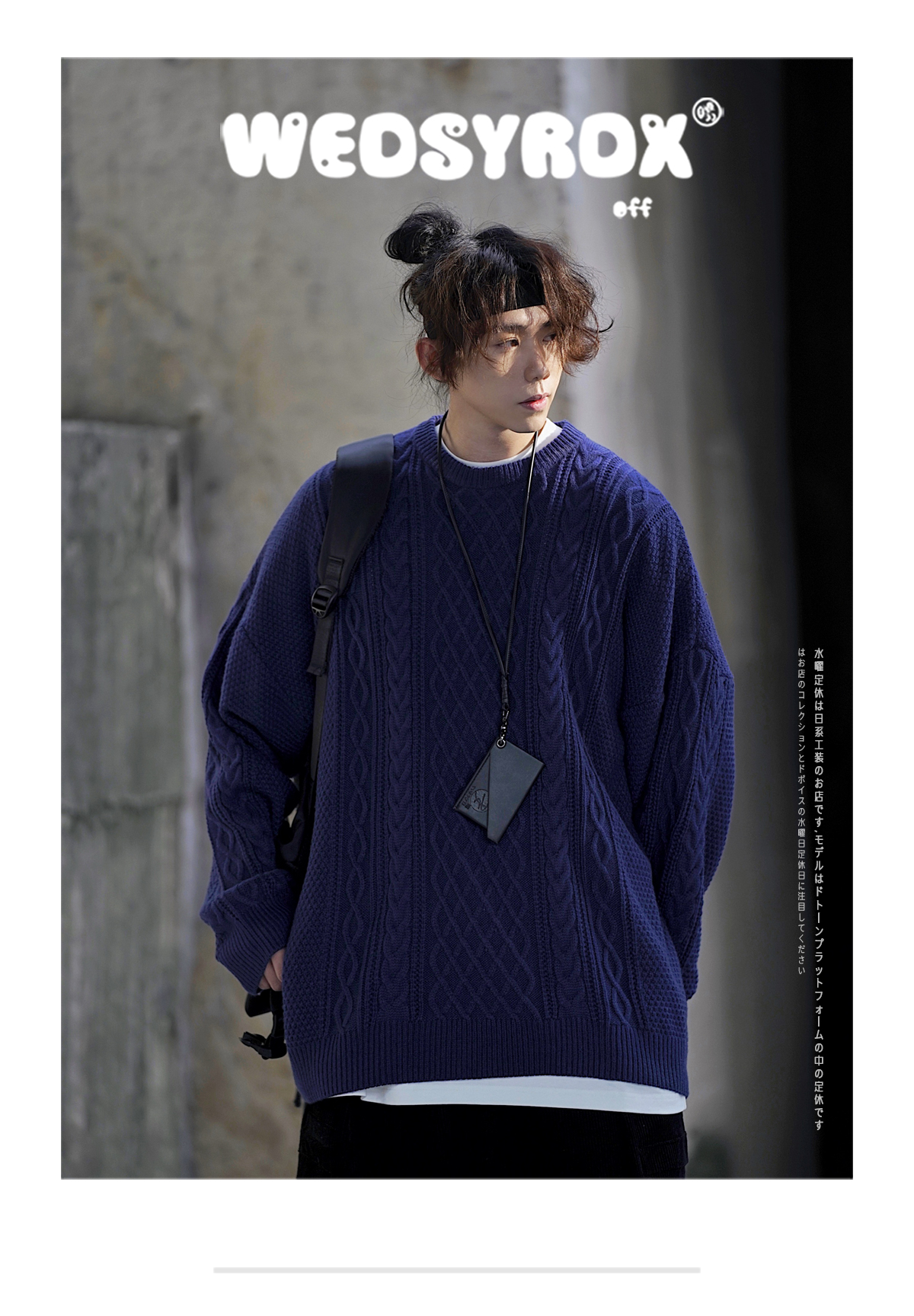 水曜日定休純色毛衣男冬季粗麻花慵懶風圓領復古針織打底衫上衣