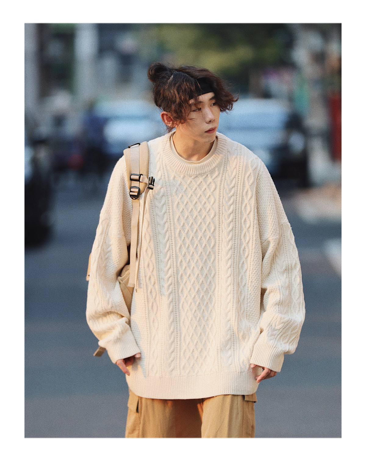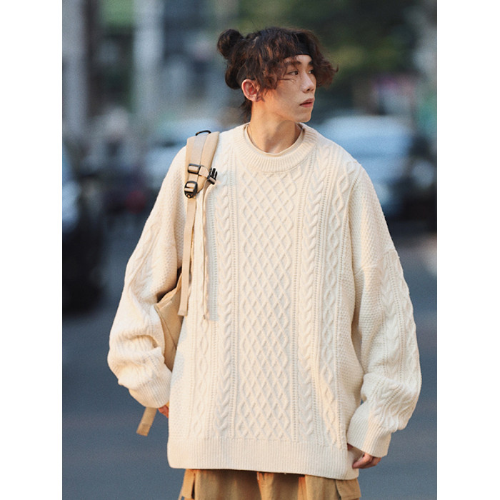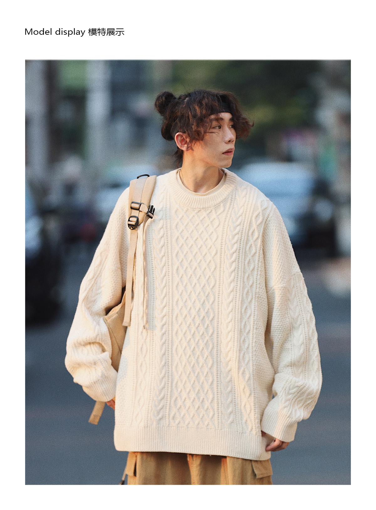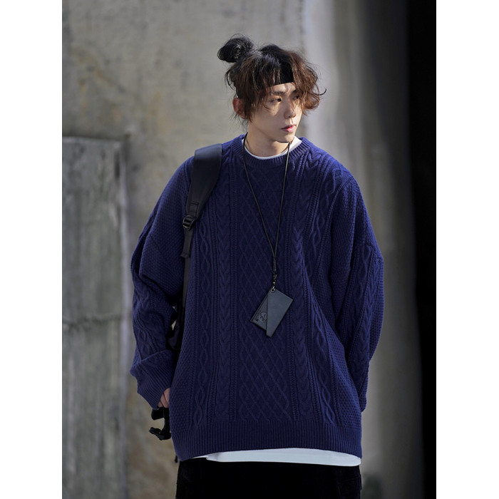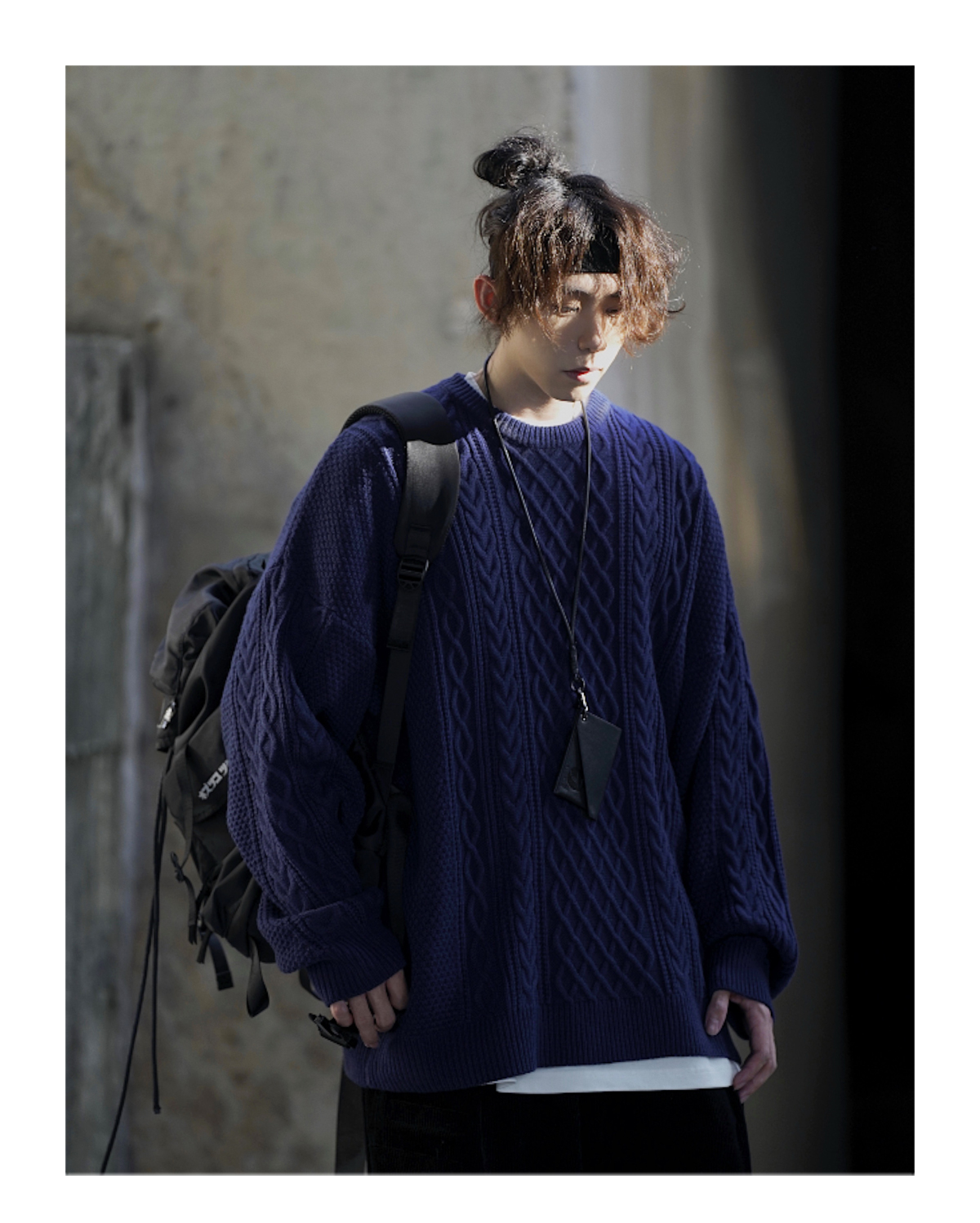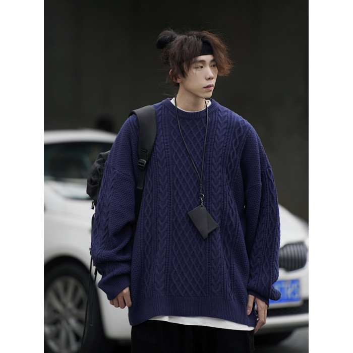 水曜日定休純色毛衣男冬季粗麻花慵懶風圓領復古針織打底衫上衣