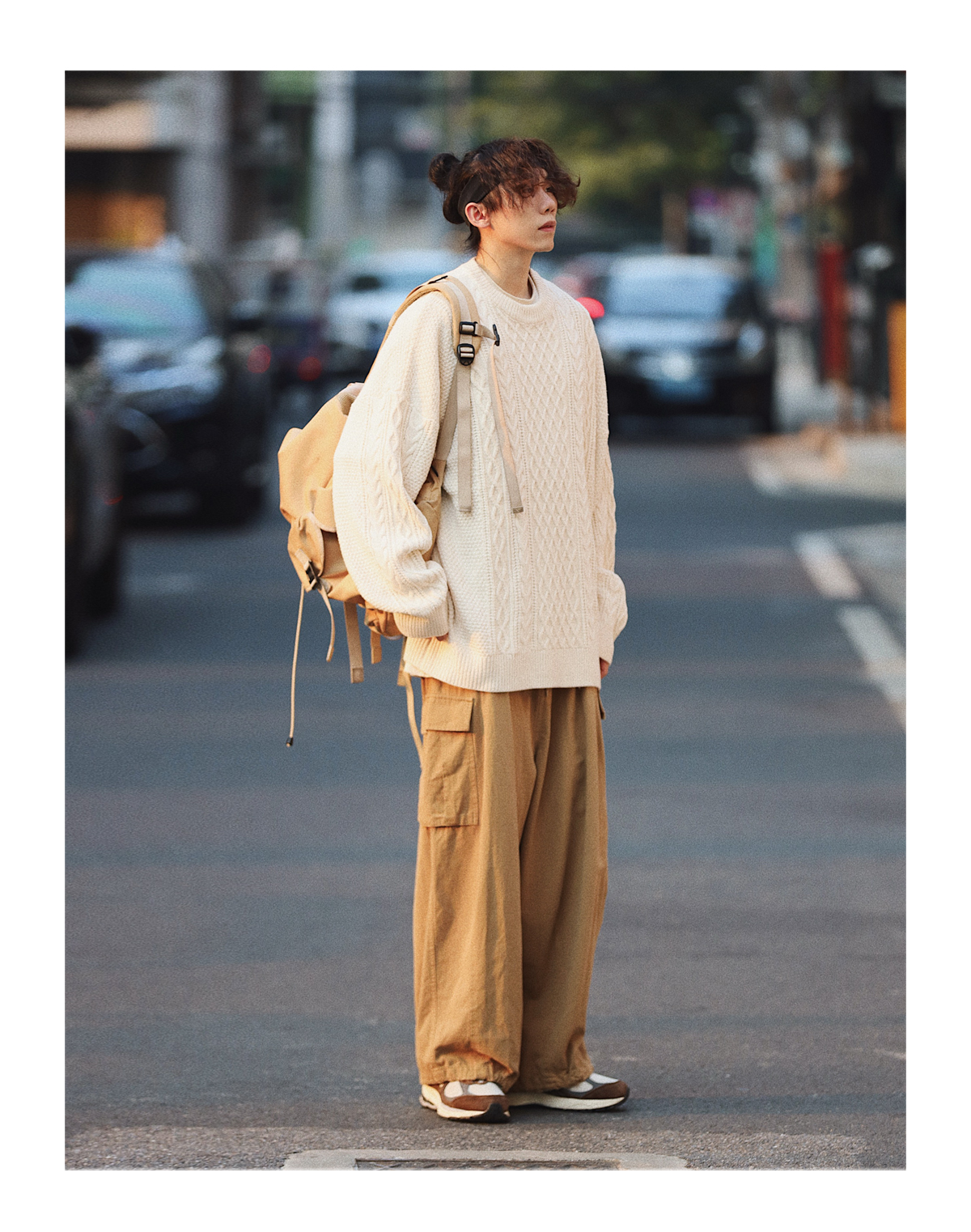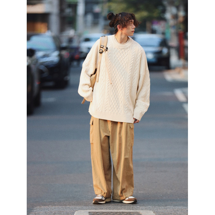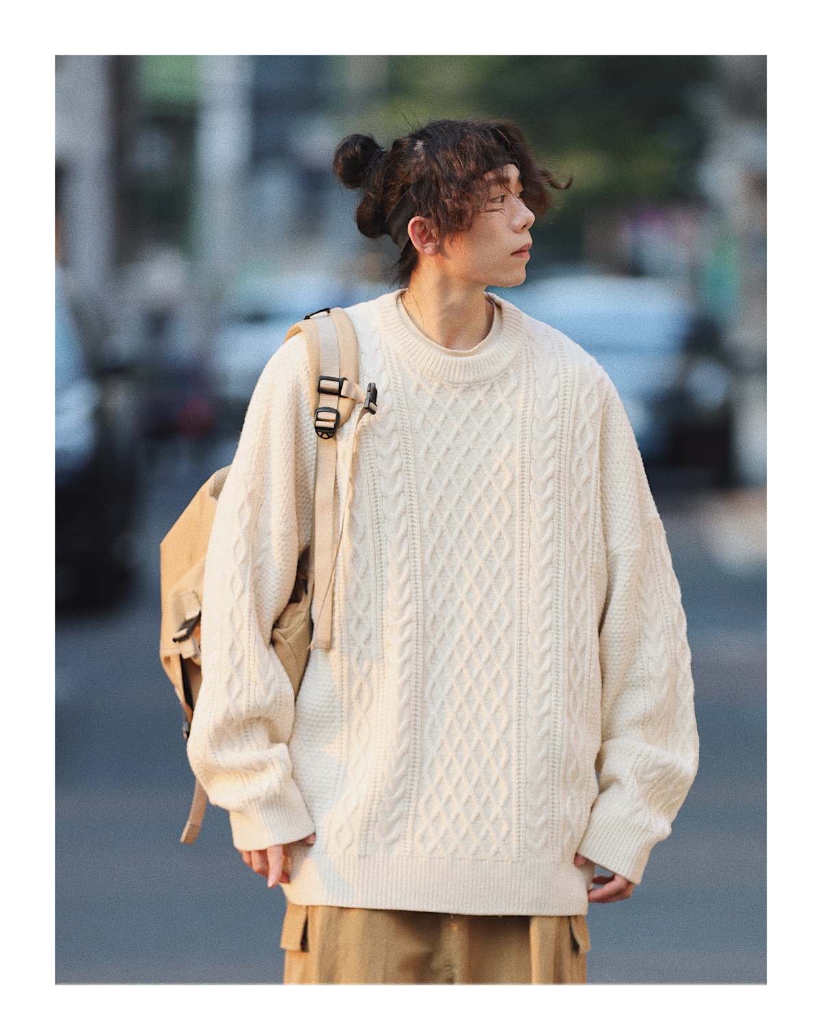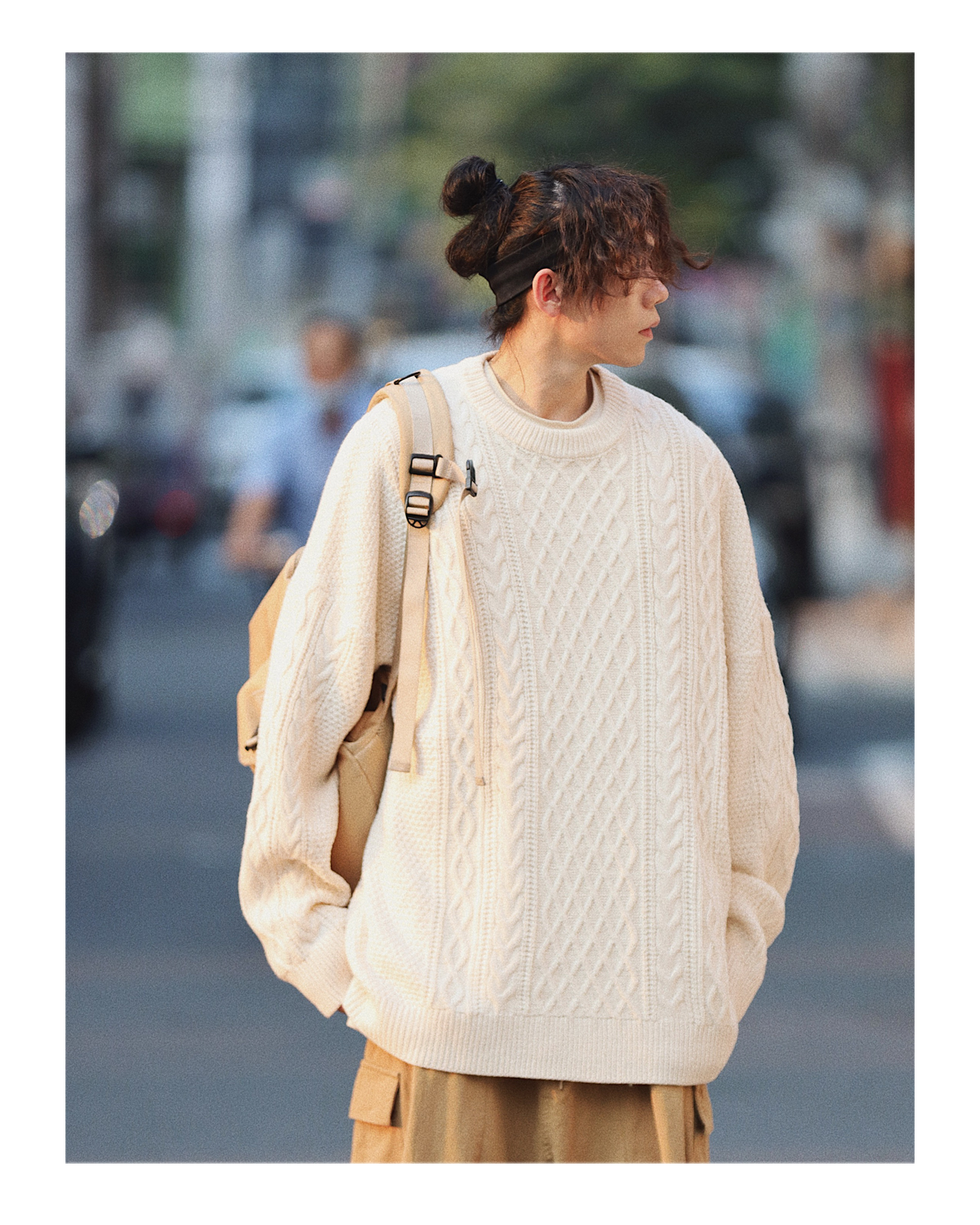 水曜日定休純色毛衣男冬季粗麻花慵懶風圓領復古針織打底衫上衣