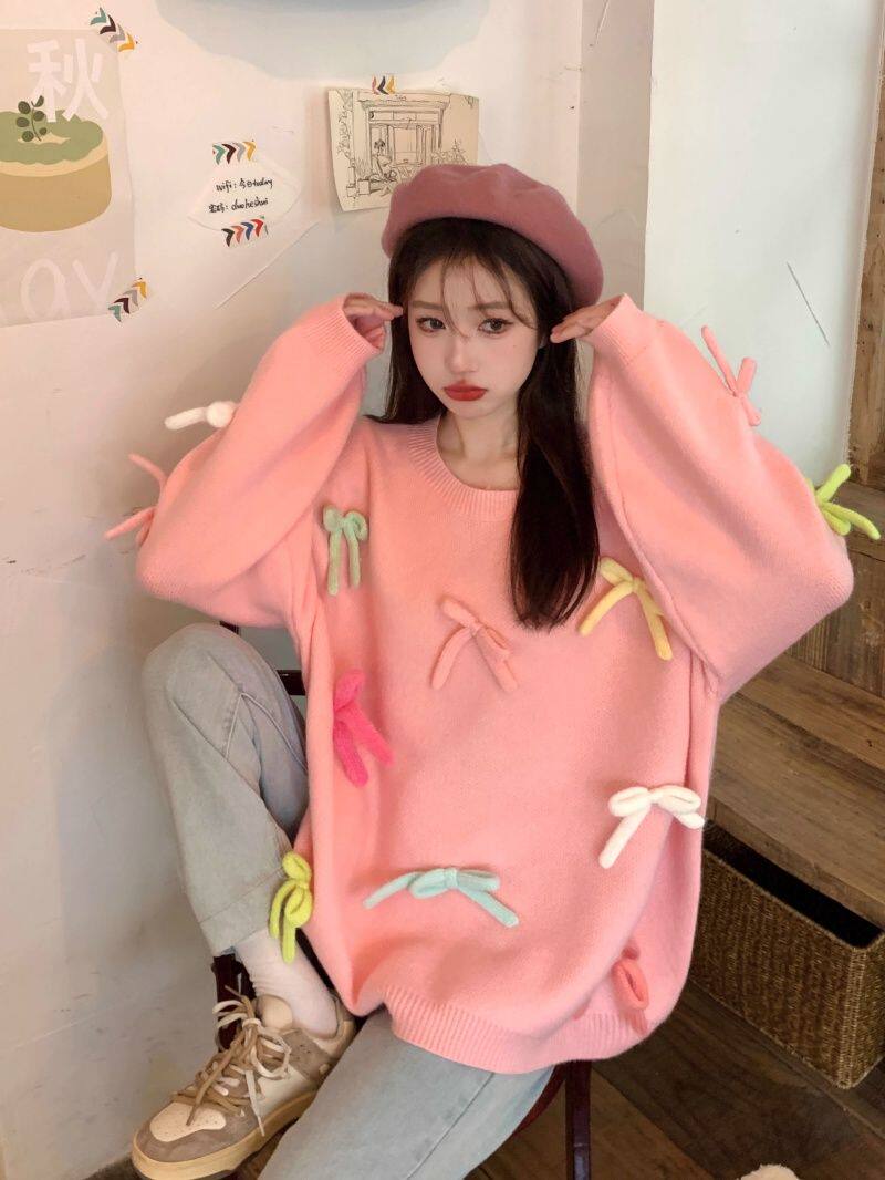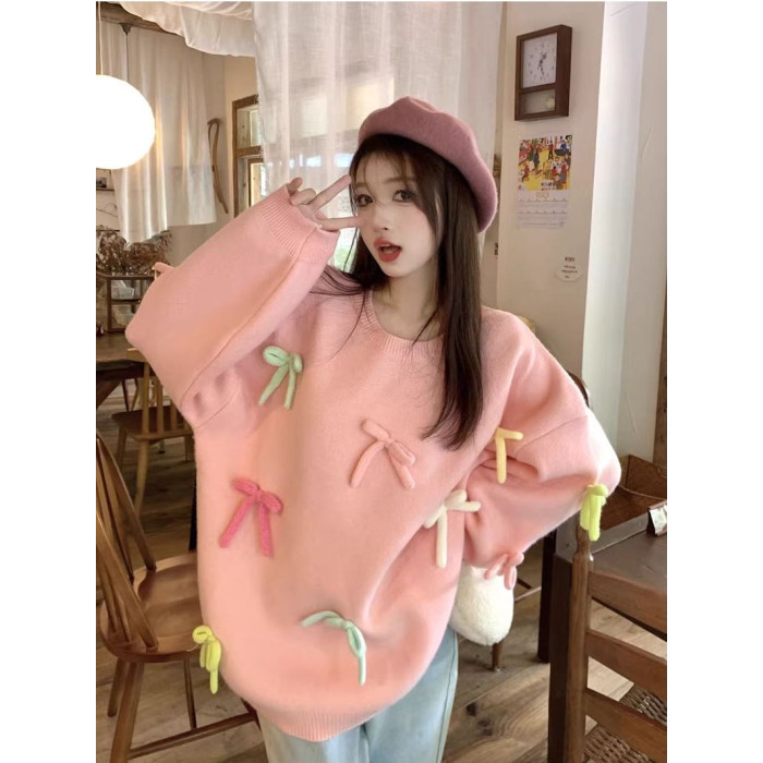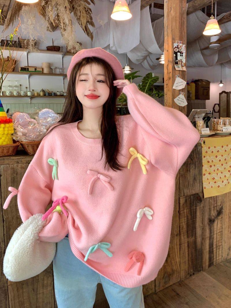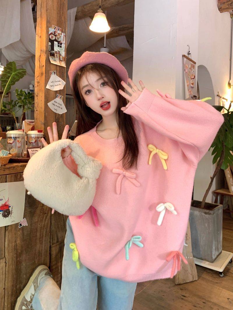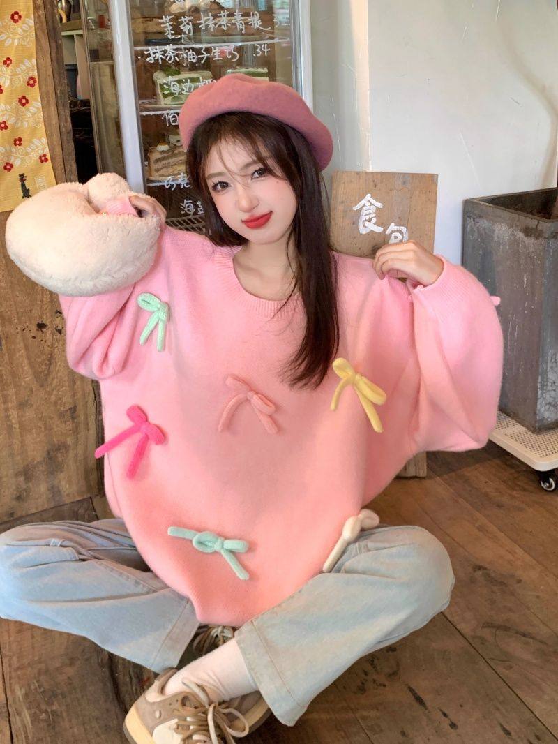 粉色甜美毛衣秋冬針織衫針織圓領新款立體寬松蝴蝶結慵懶設計上衣