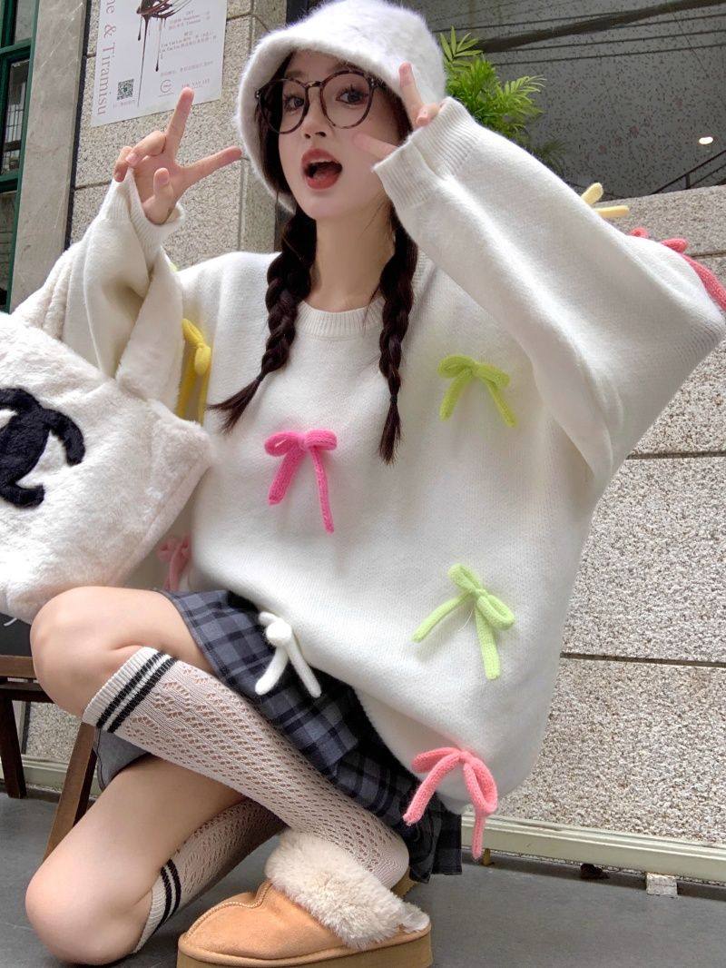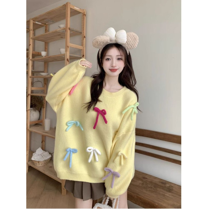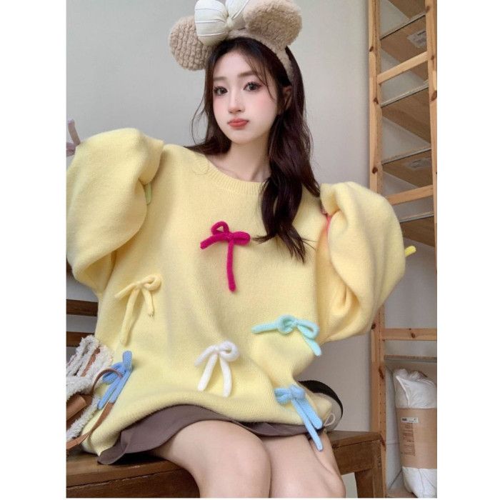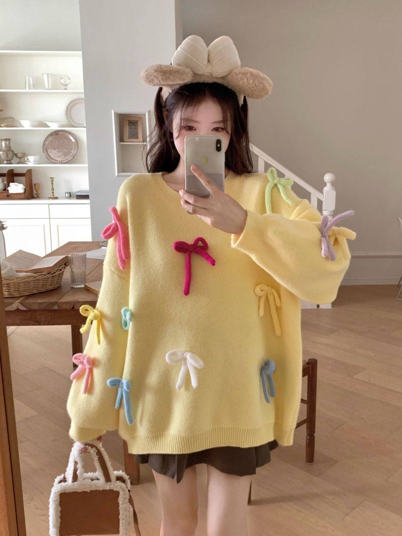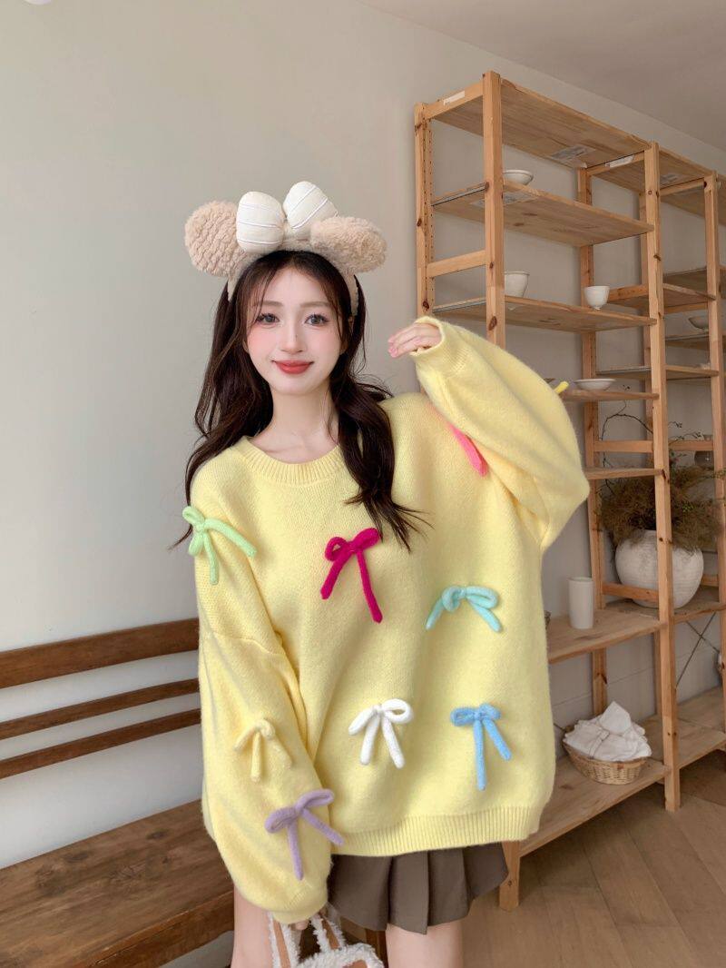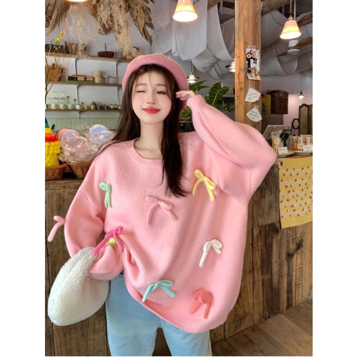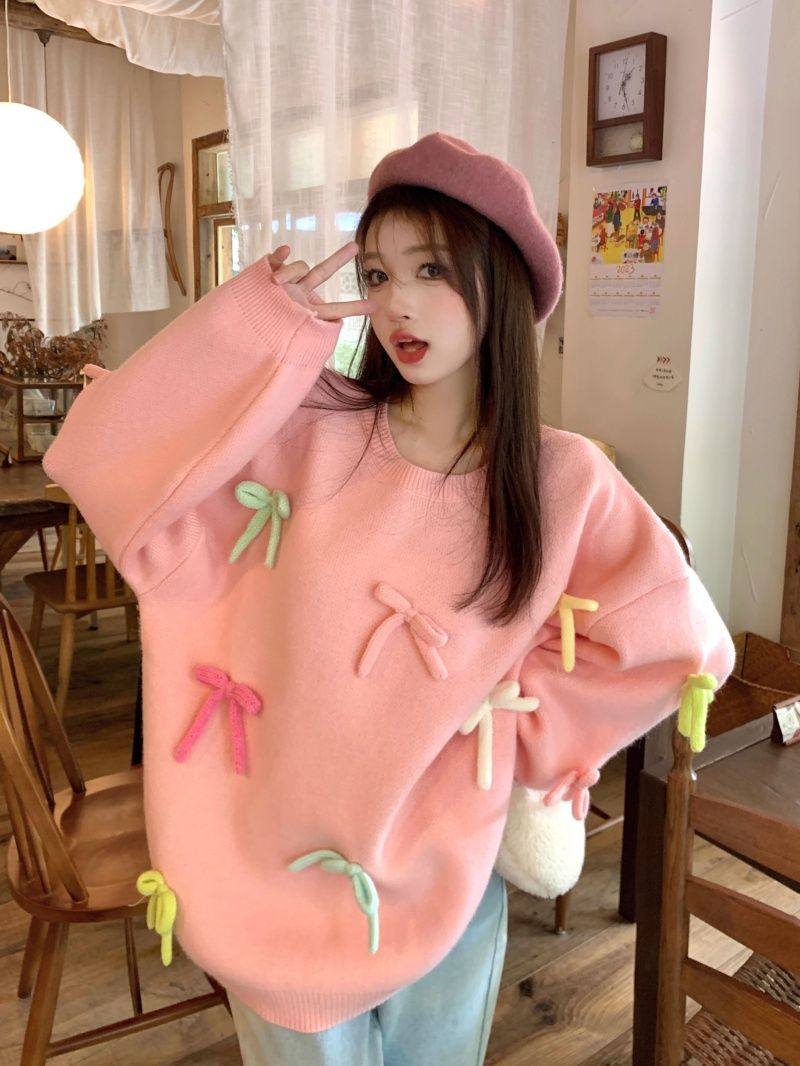 粉色甜美毛衣秋冬針織衫針織圓領新款立體寬松蝴蝶結慵懶設計上衣
