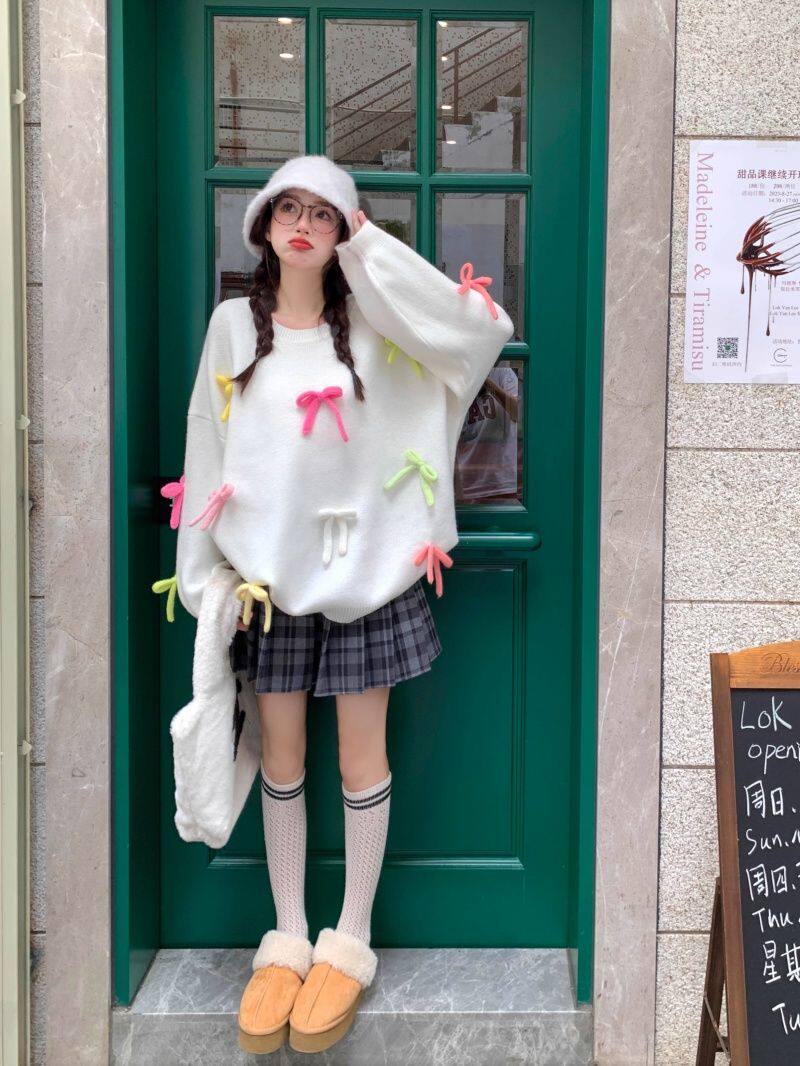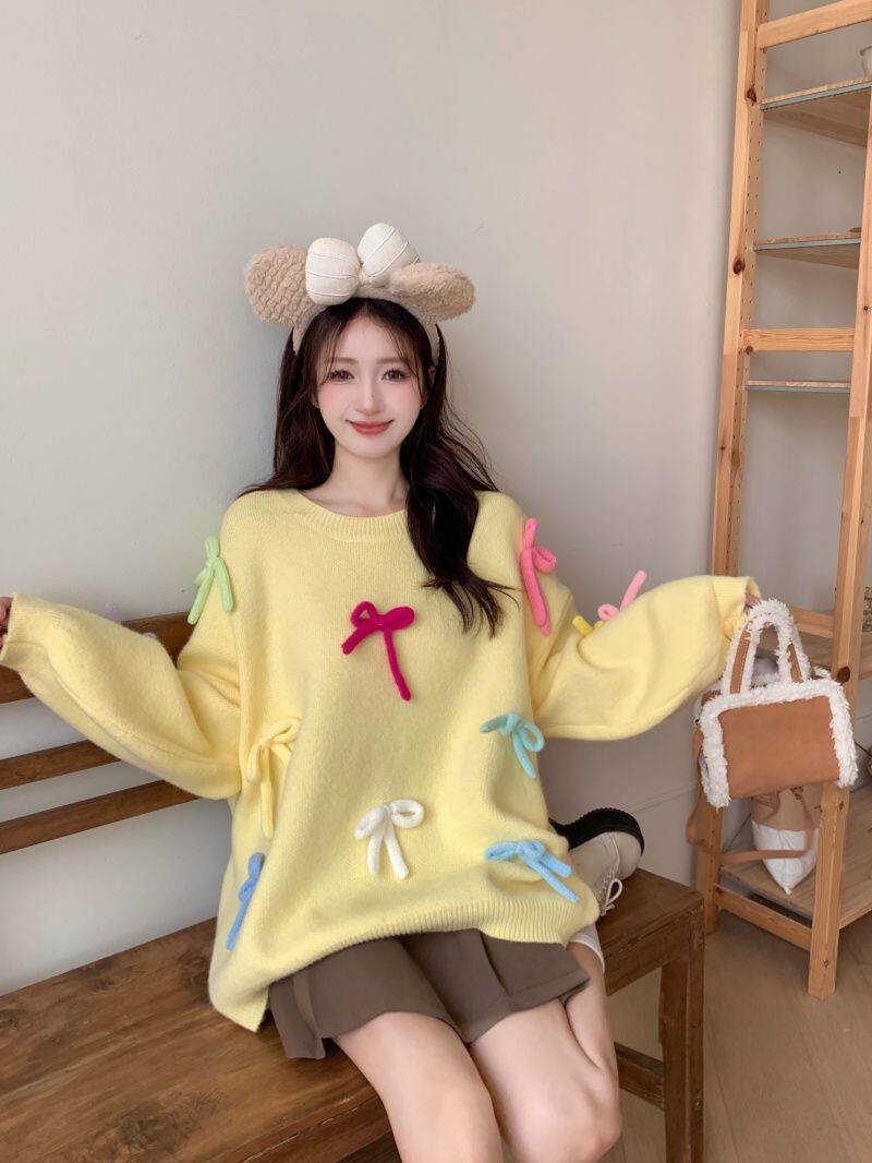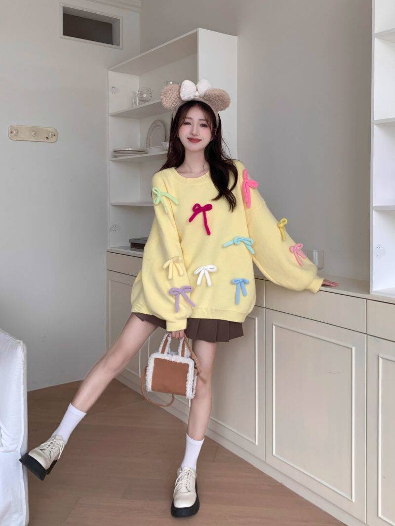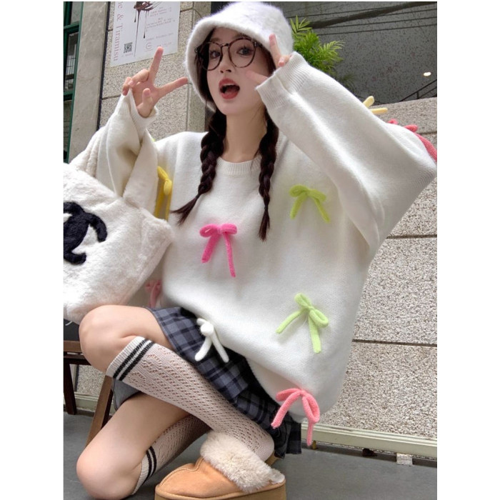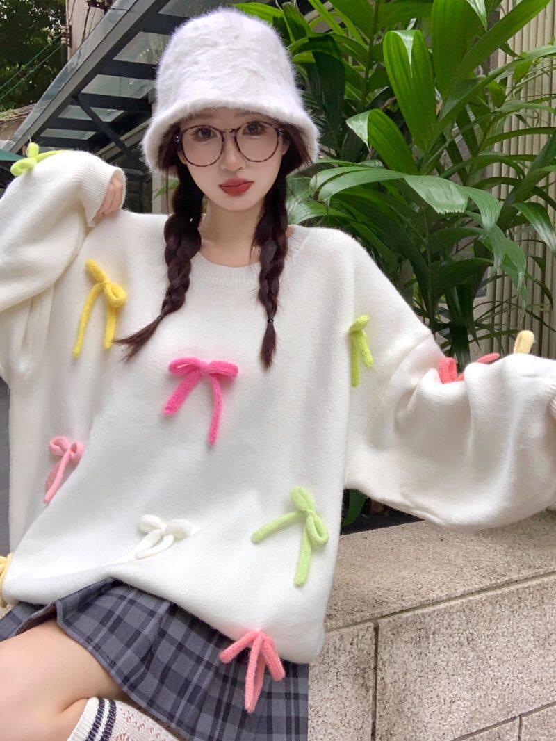 粉色甜美毛衣秋冬針織衫針織圓領新款立體寬松蝴蝶結慵懶設計上衣