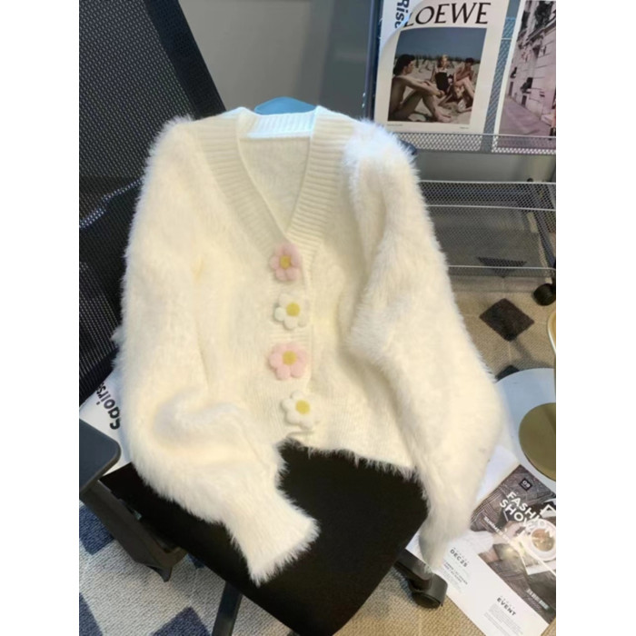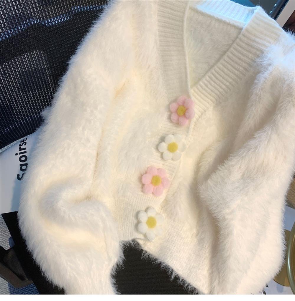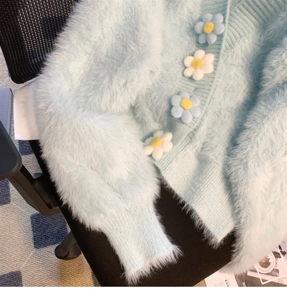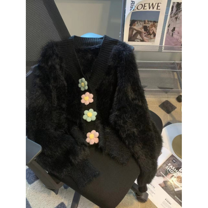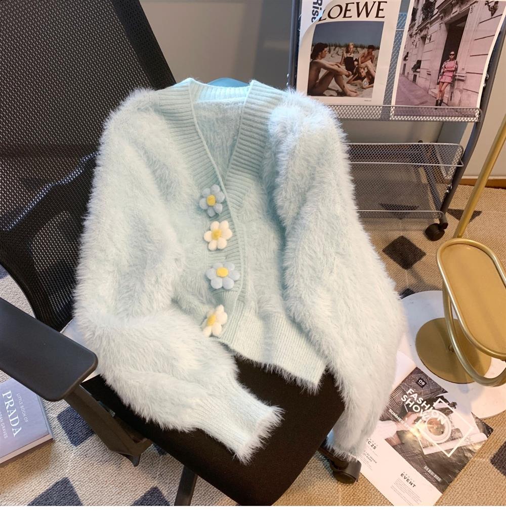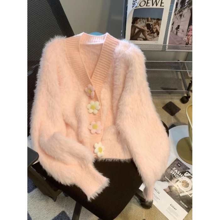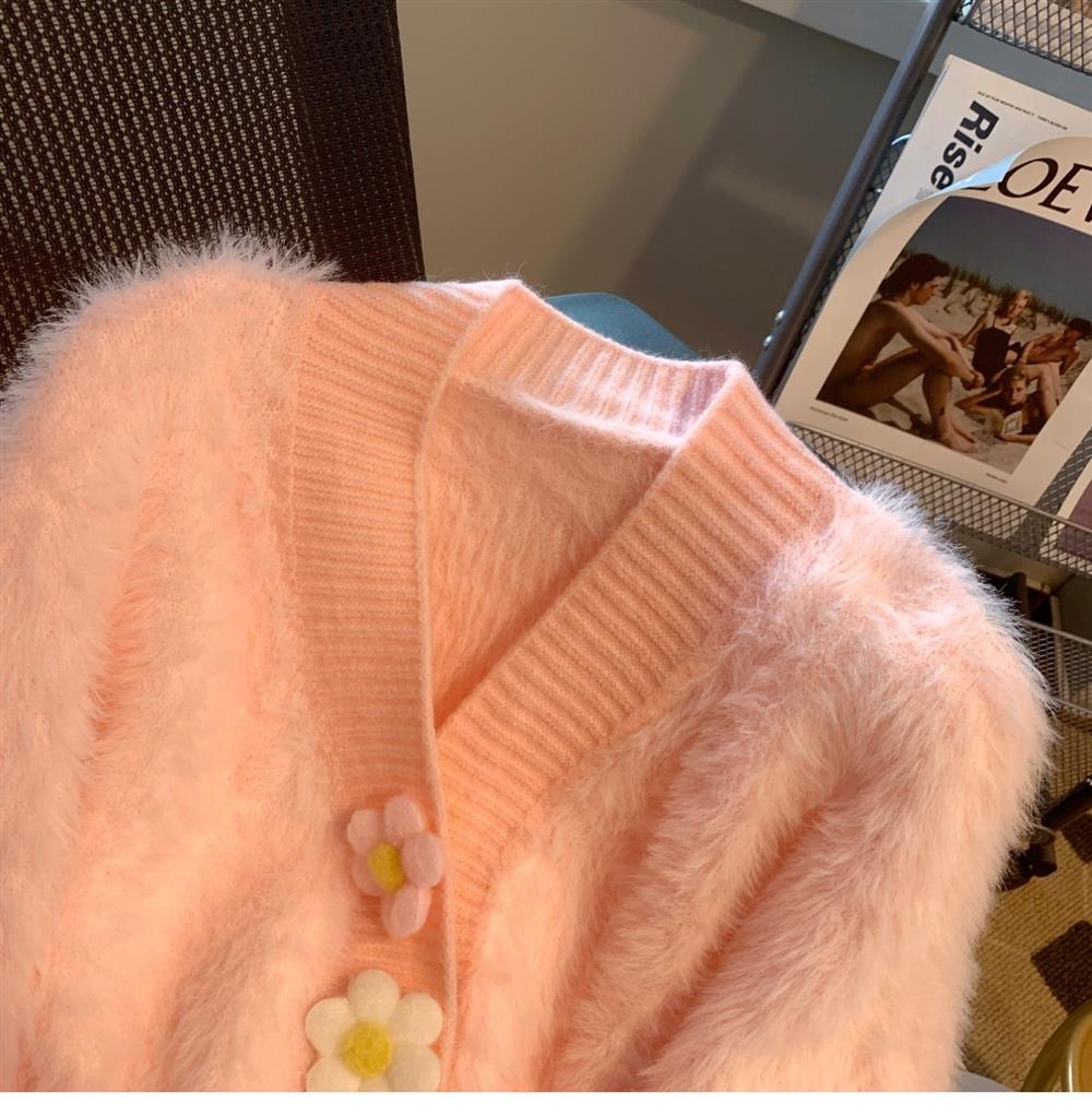 秋冬季軟糯水貂絨針織開衫女慵懶溫柔風立體花朵釦v領毛衣外套