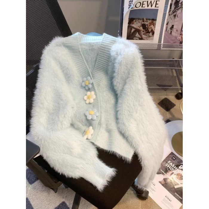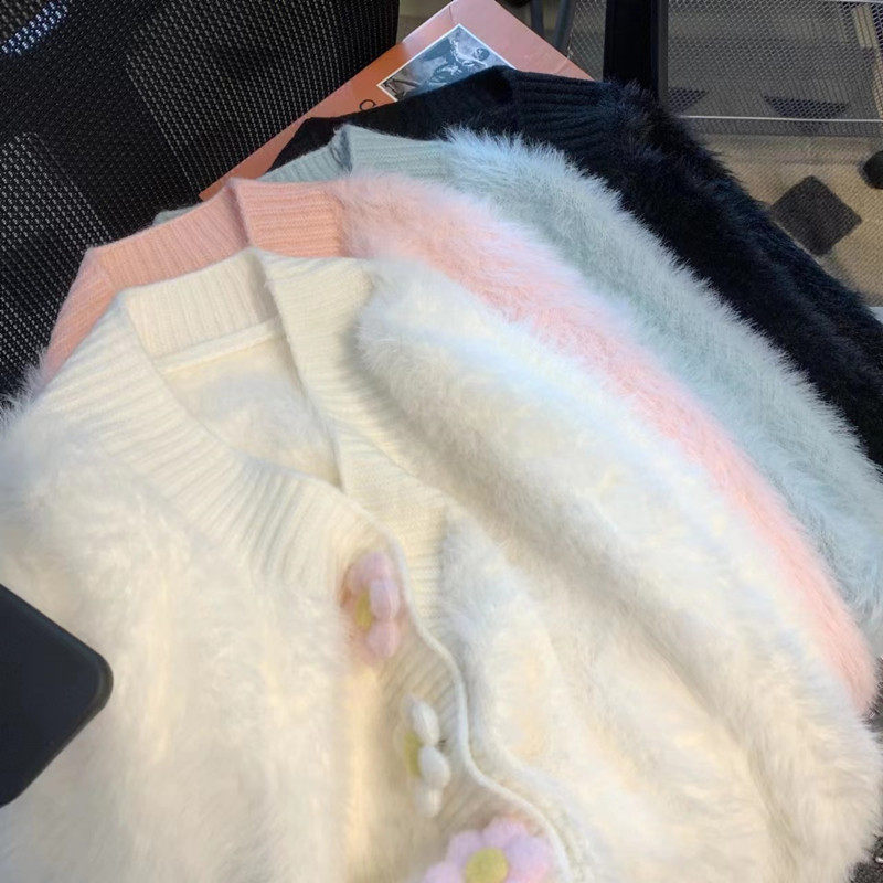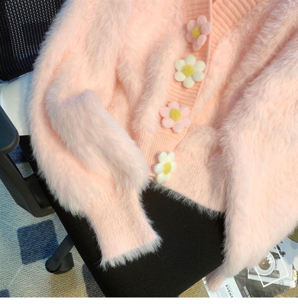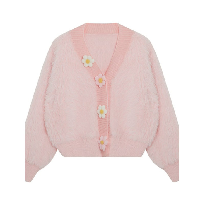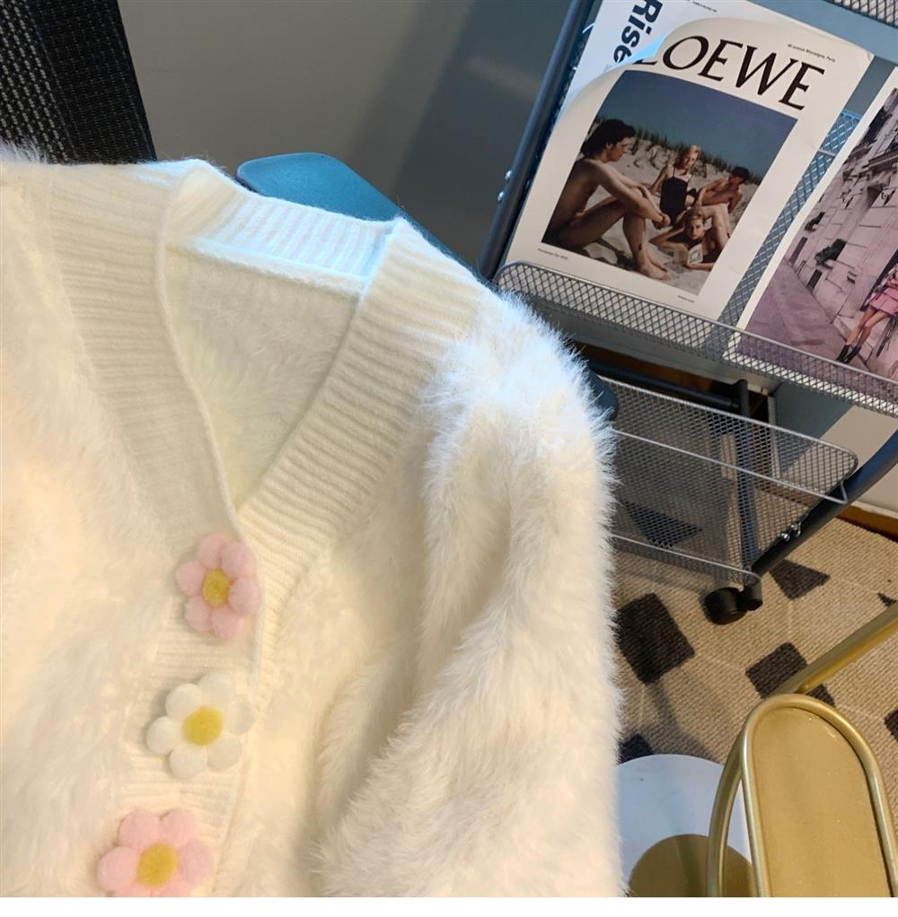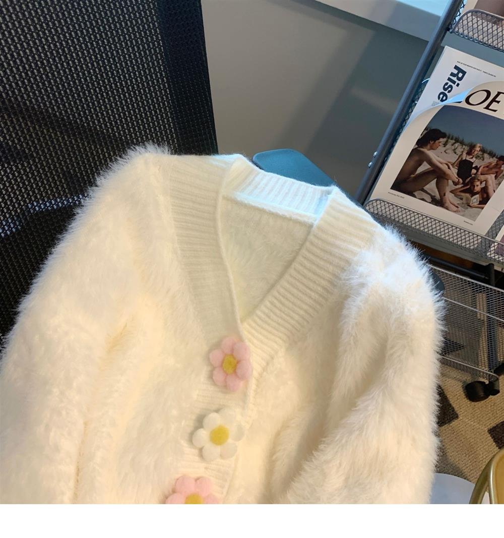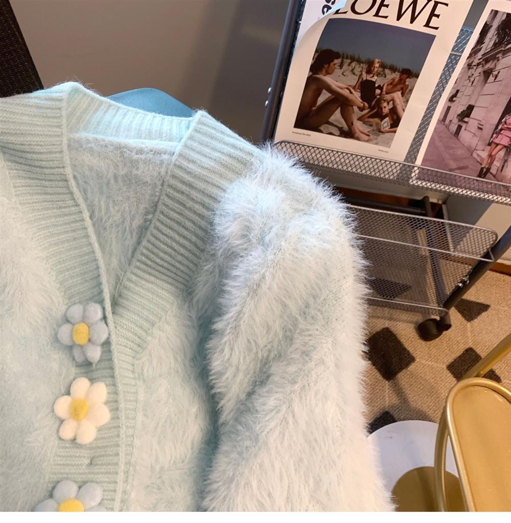 秋冬季軟糯水貂絨針織開衫女慵懶溫柔風立體花朵釦v領毛衣外套
