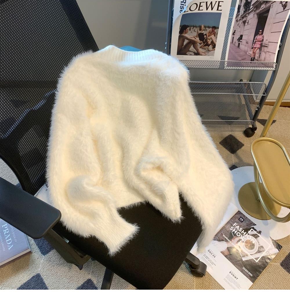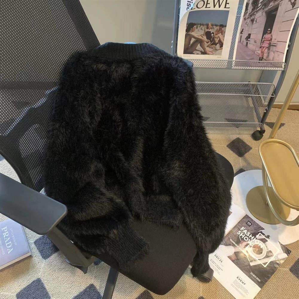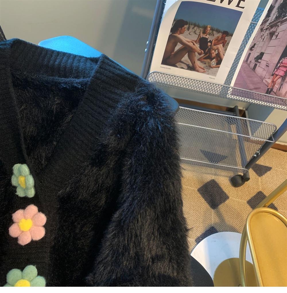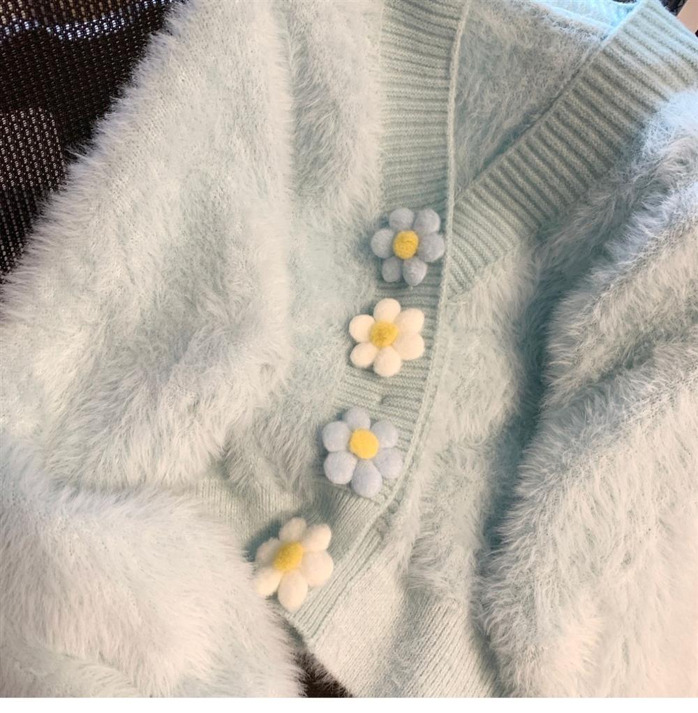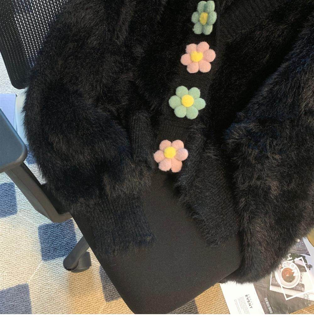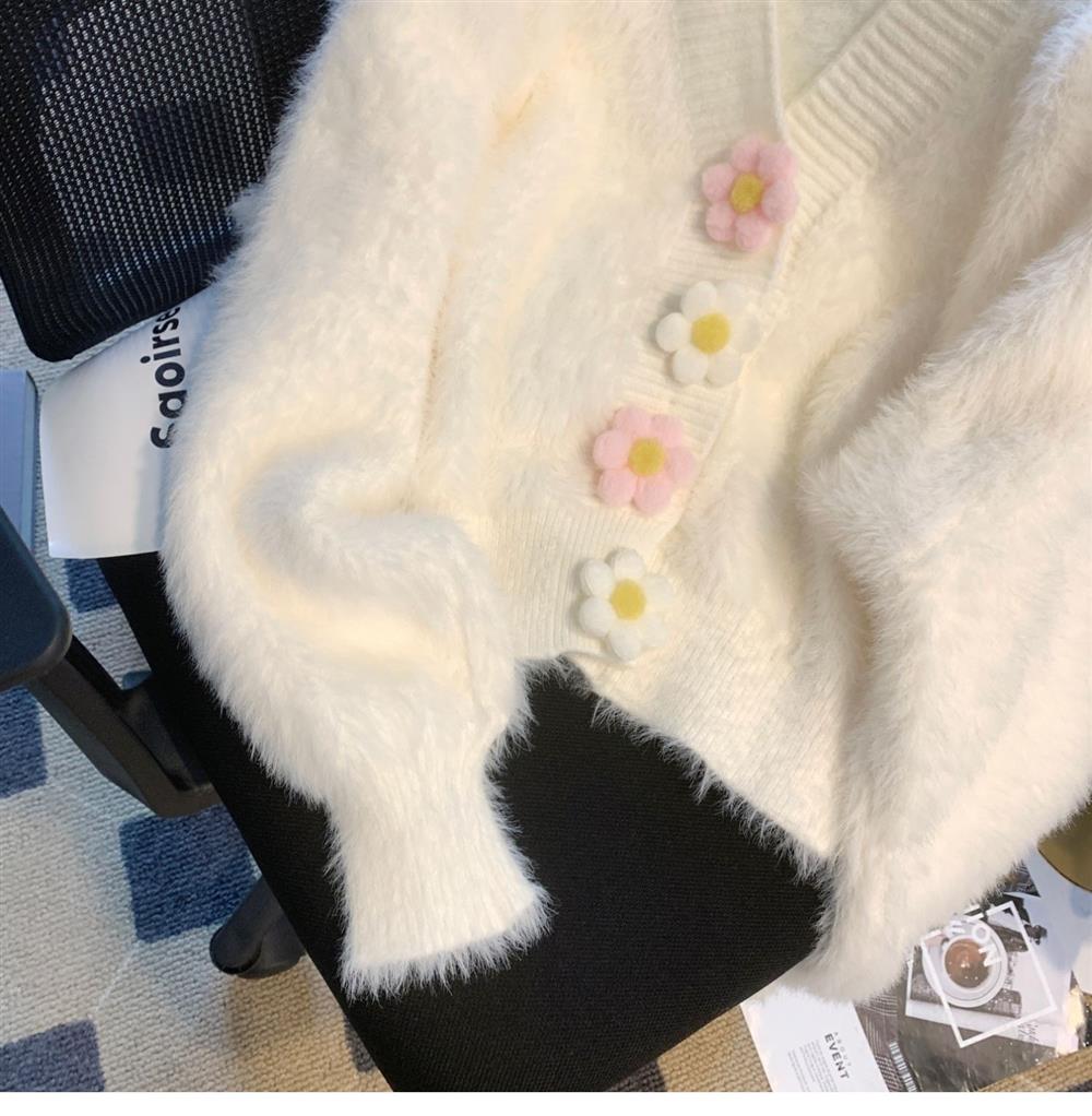 秋冬季軟糯水貂絨針織開衫女慵懶溫柔風立體花朵釦v領毛衣外套