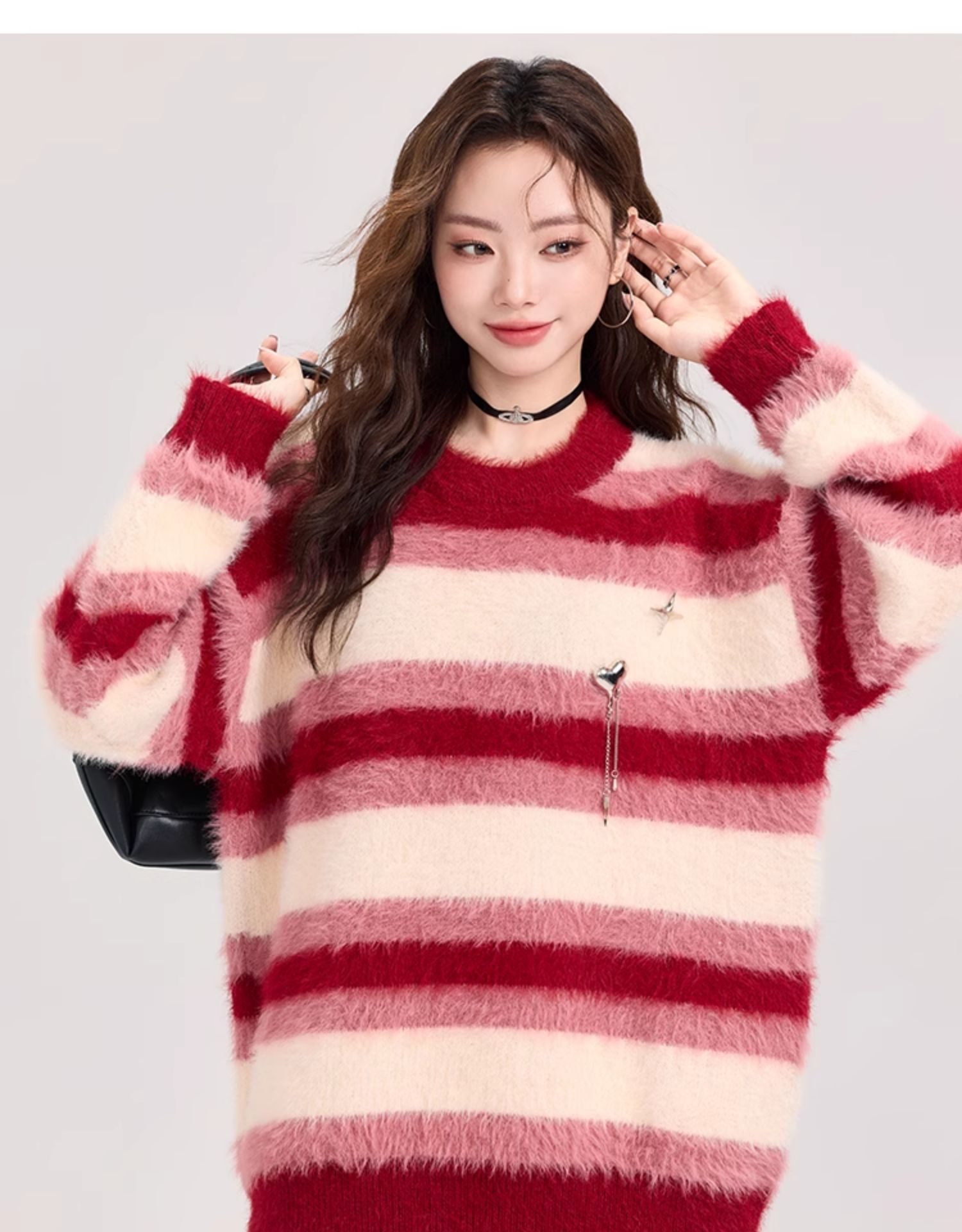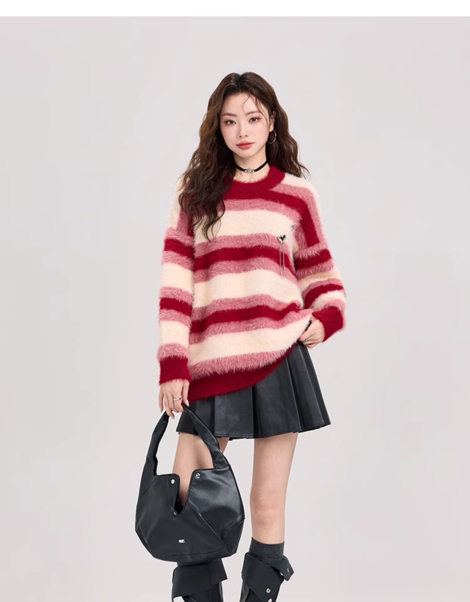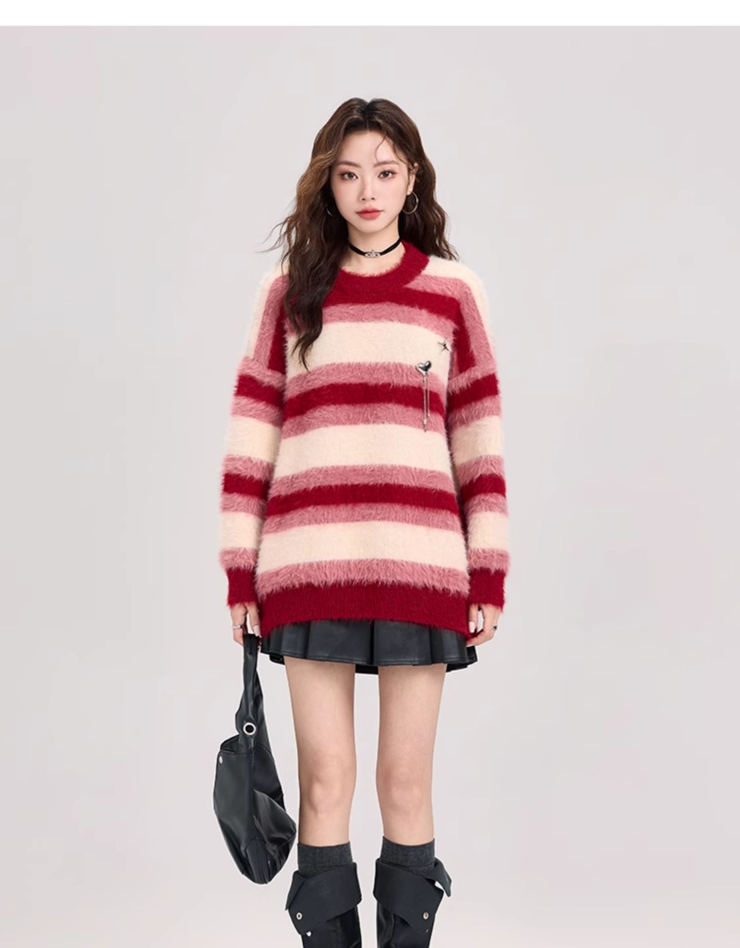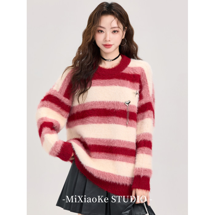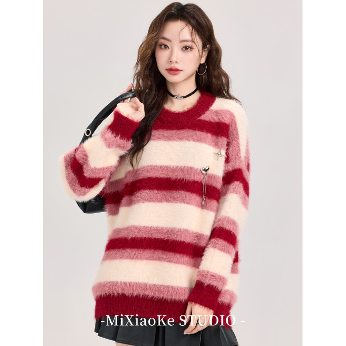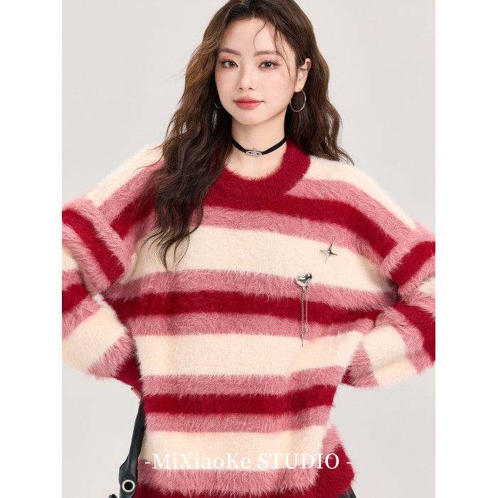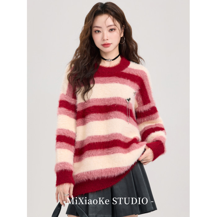 羋小可聖誕穿搭紅色條紋仿貂毛毛衣女秋冬季慵懶風針織衫寬松上衣