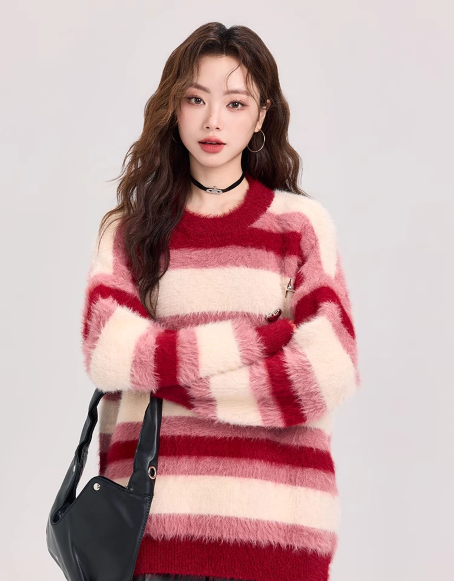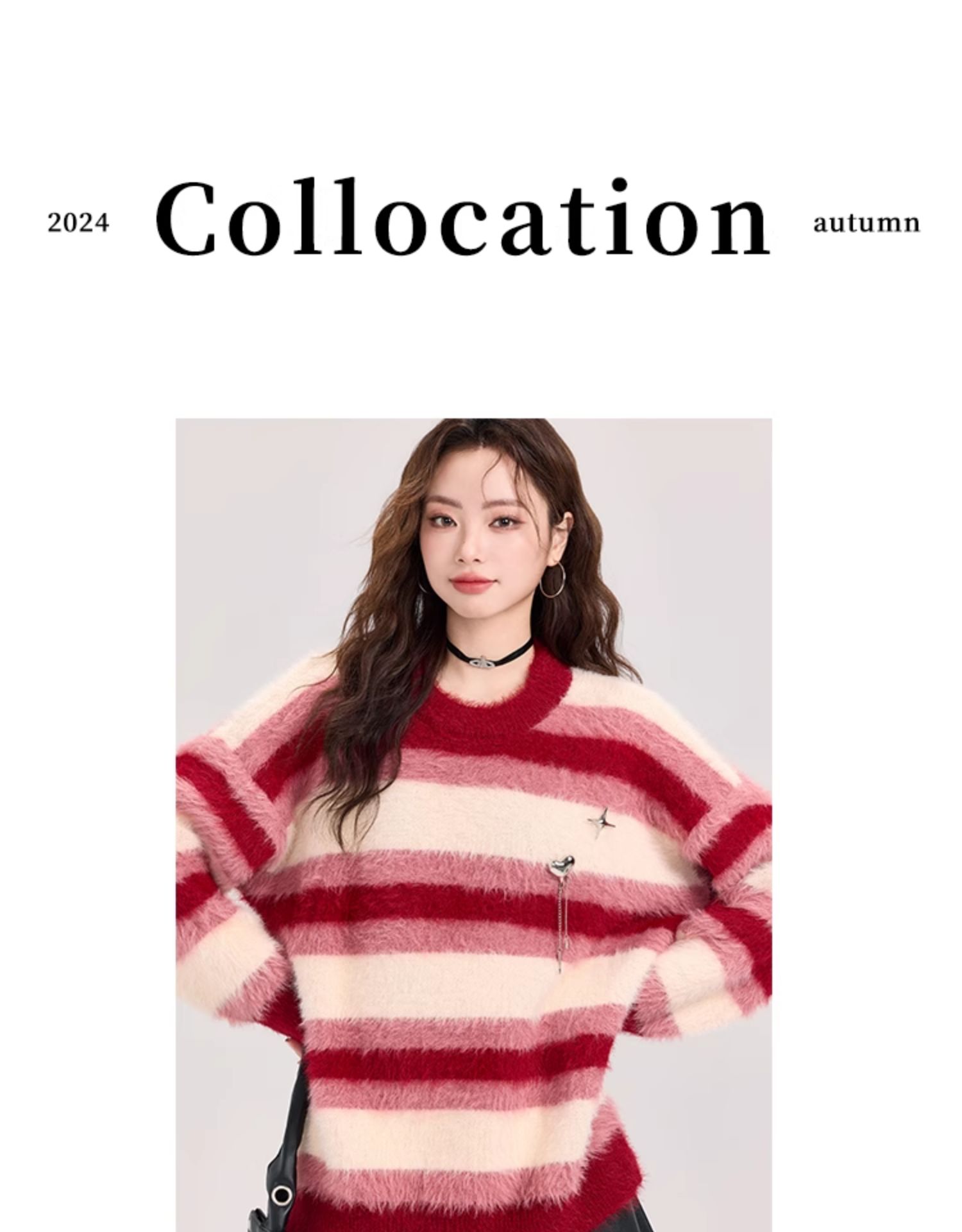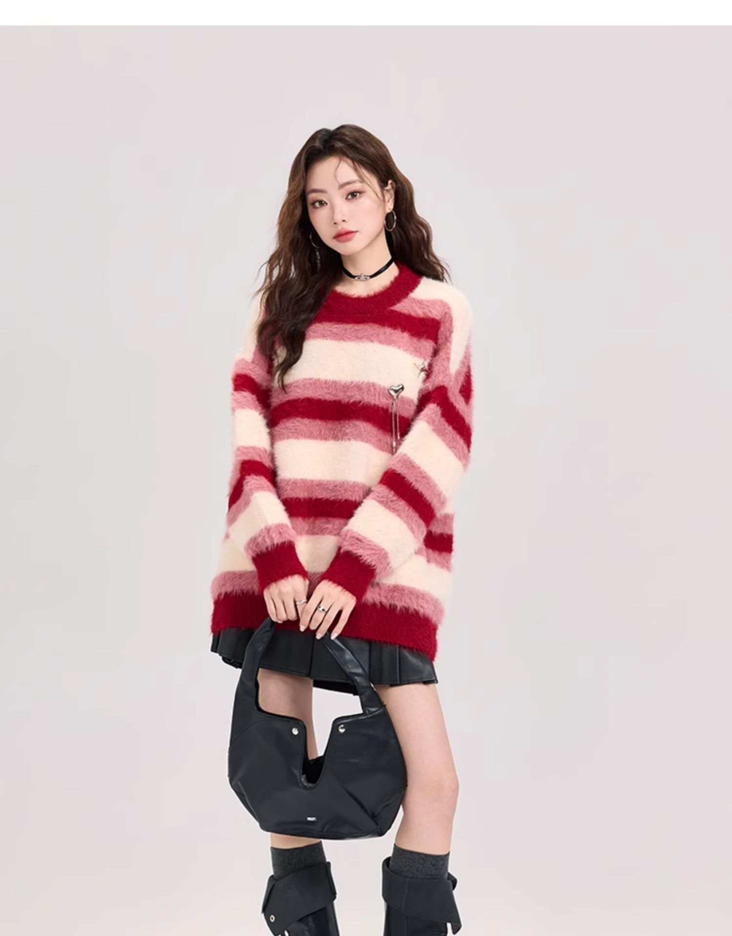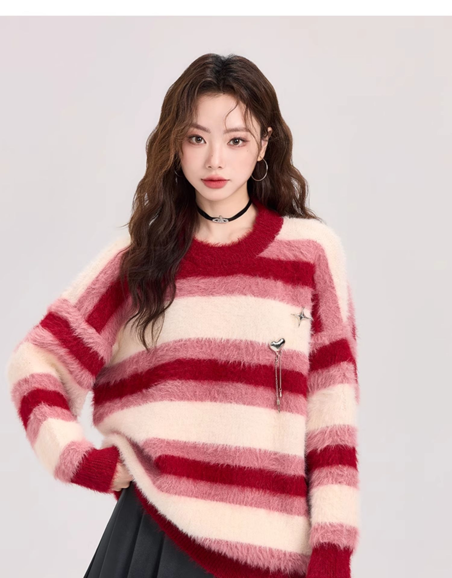 羋小可聖誕穿搭紅色條紋仿貂毛毛衣女秋冬季慵懶風針織衫寬松上衣