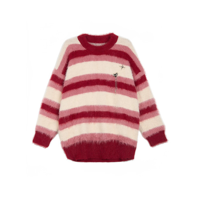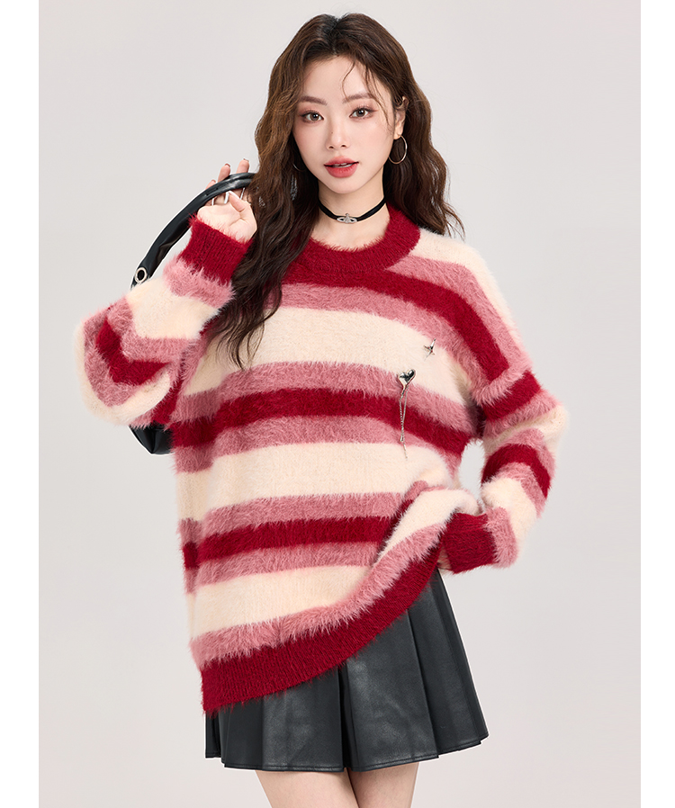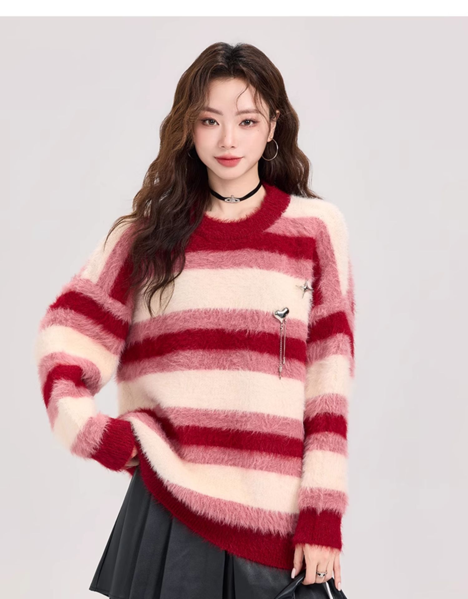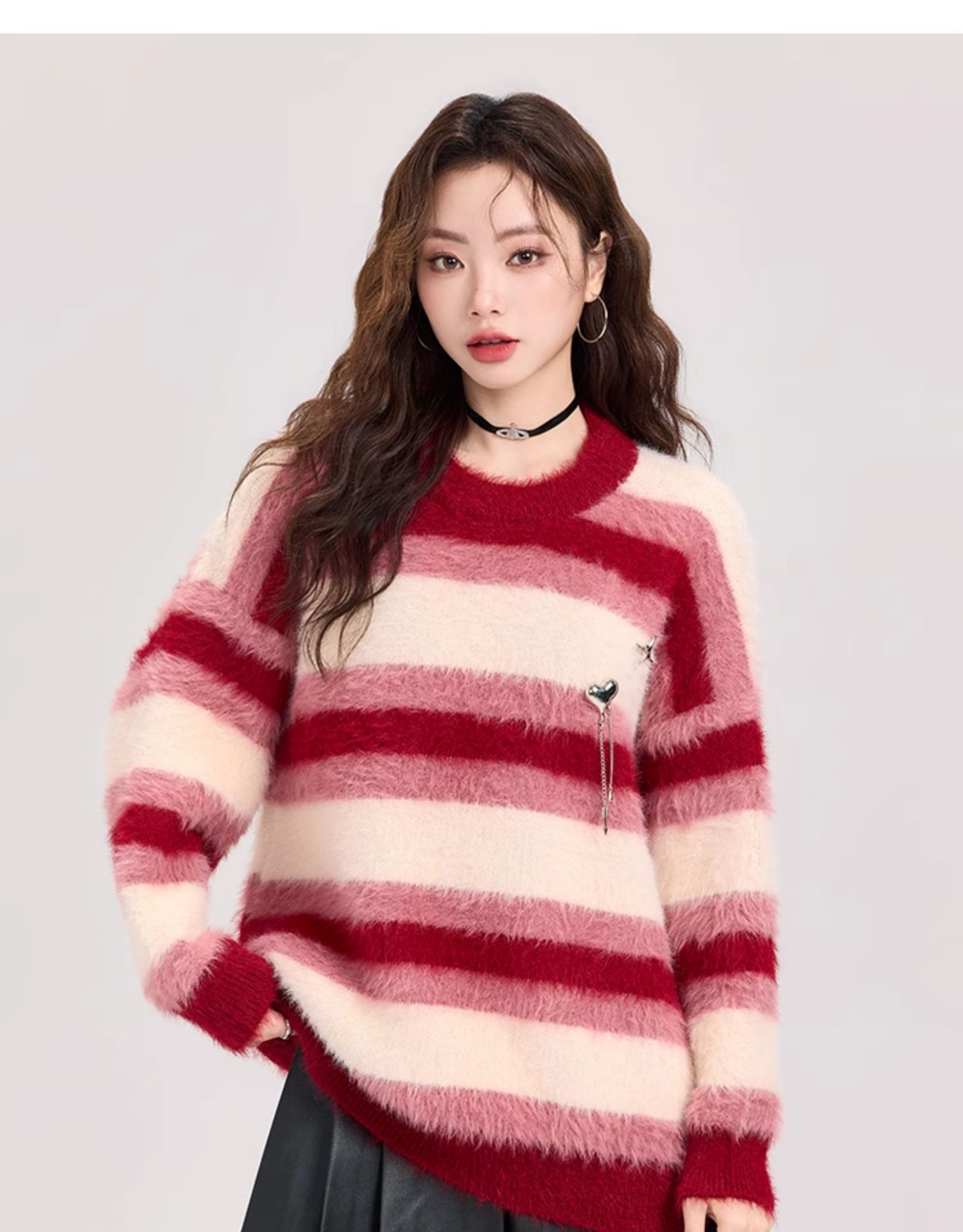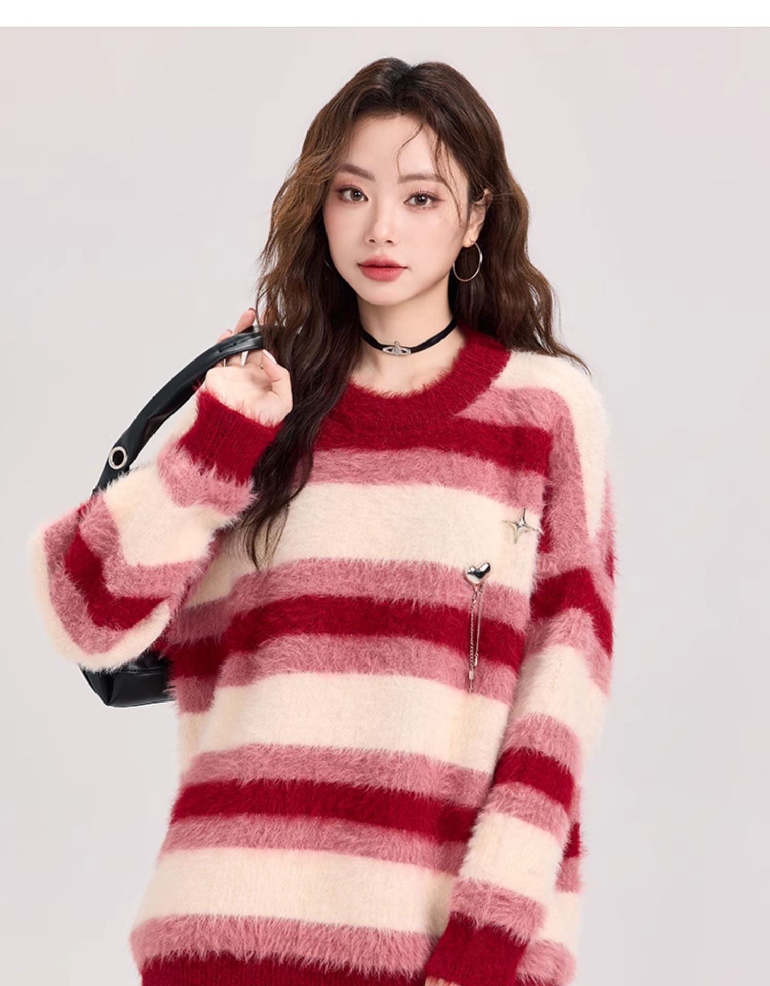 羋小可聖誕穿搭紅色條紋仿貂毛毛衣女秋冬季慵懶風針織衫寬松上衣