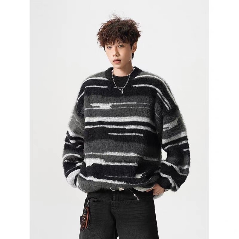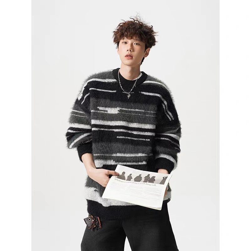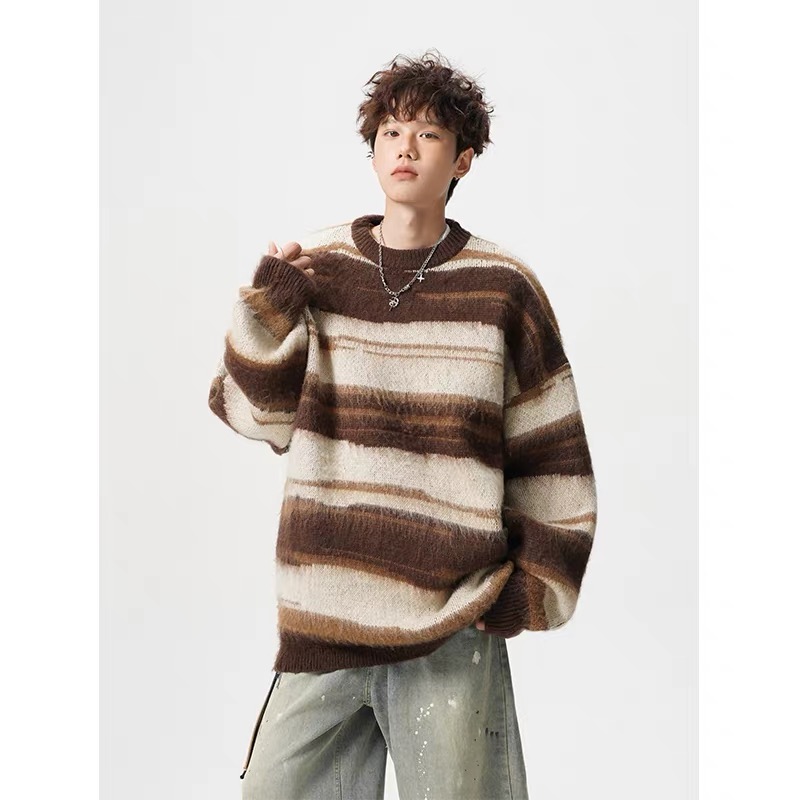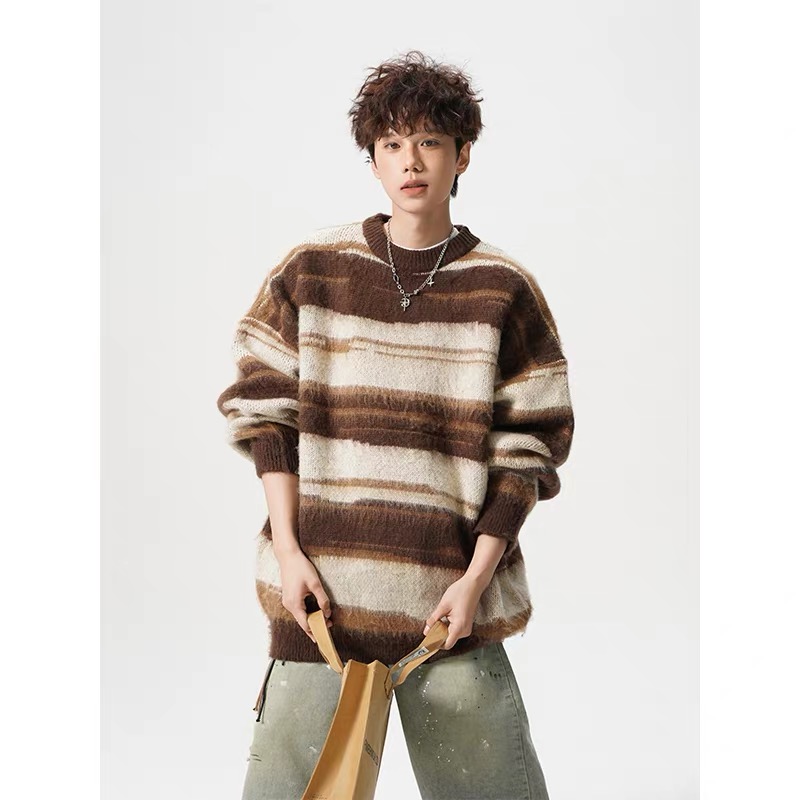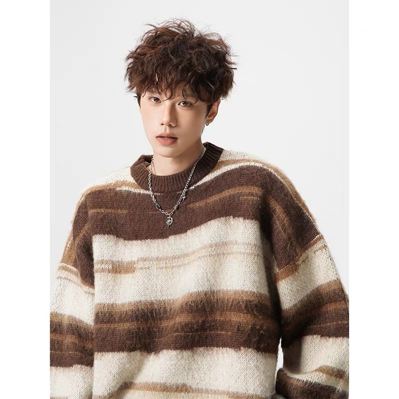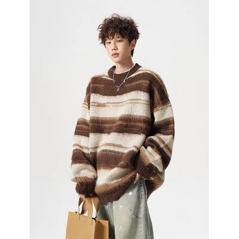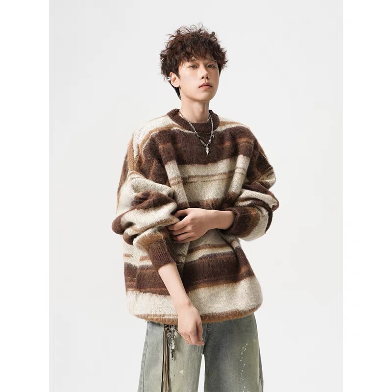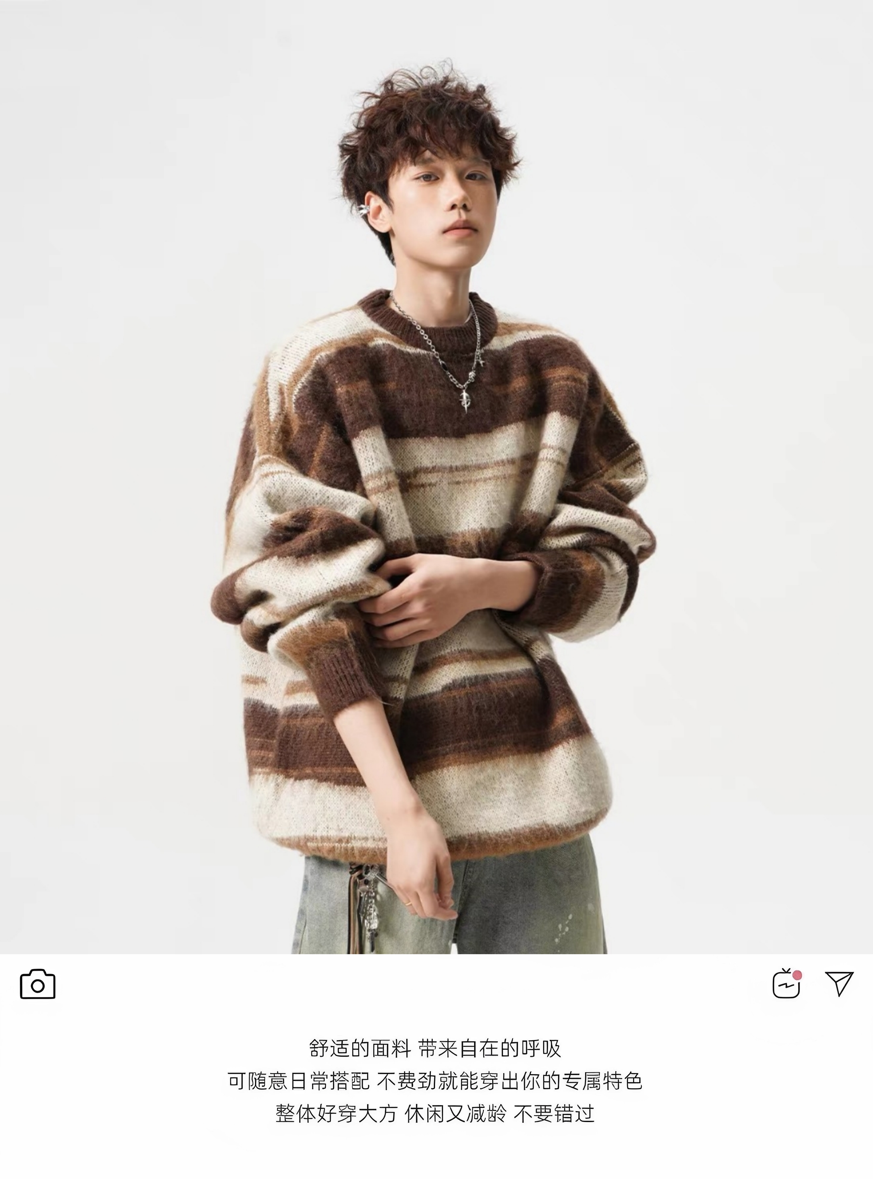馬海毛圓領毛衣男女秋冬休閒撞色條紋針織衫寬松松弛感情侶打底衫