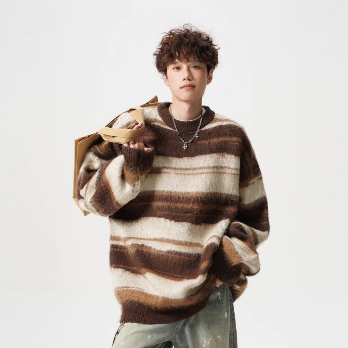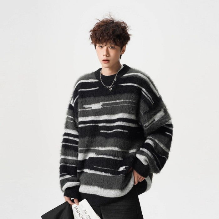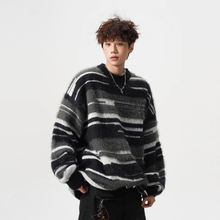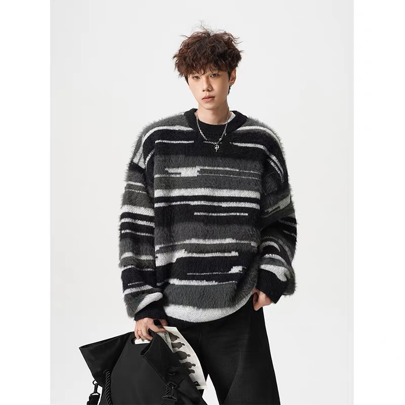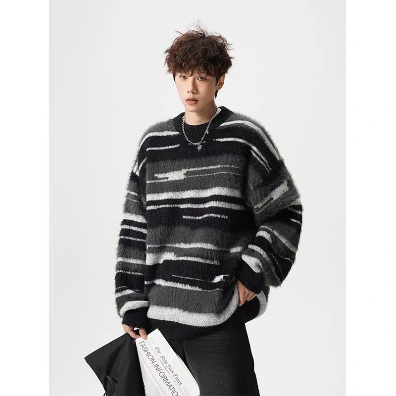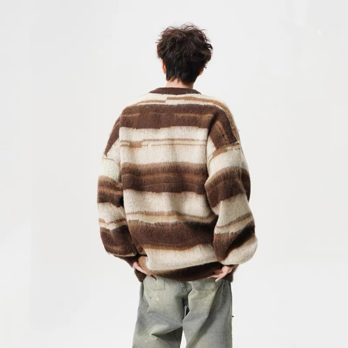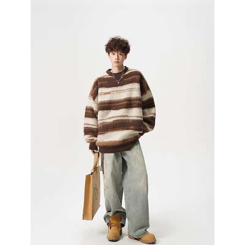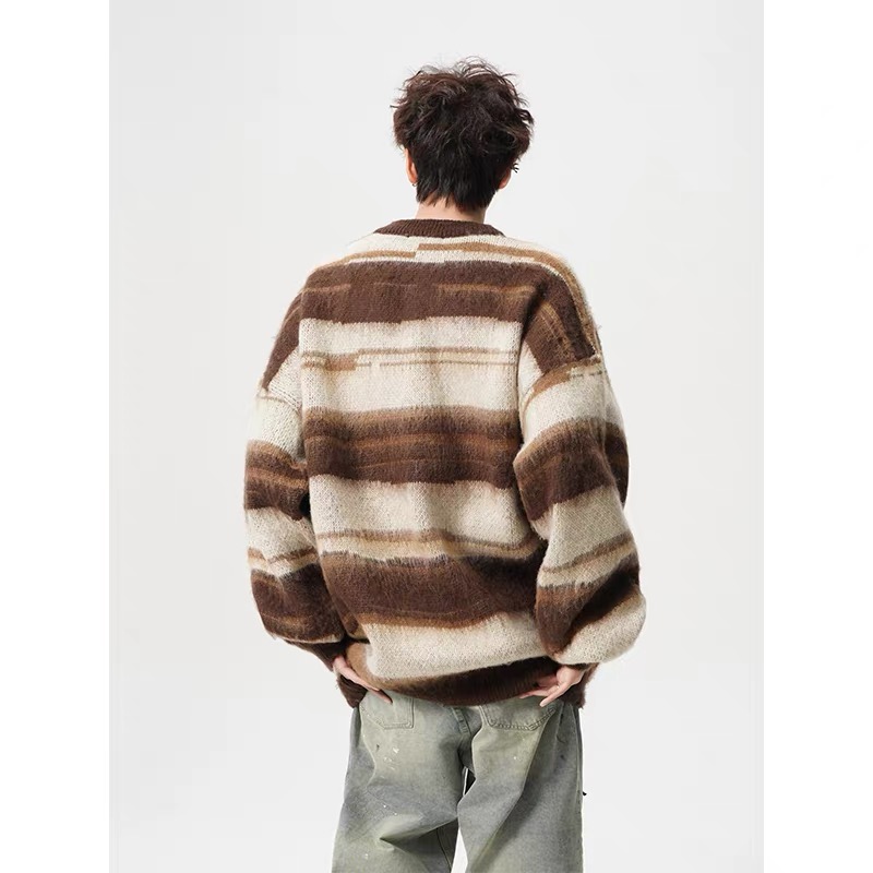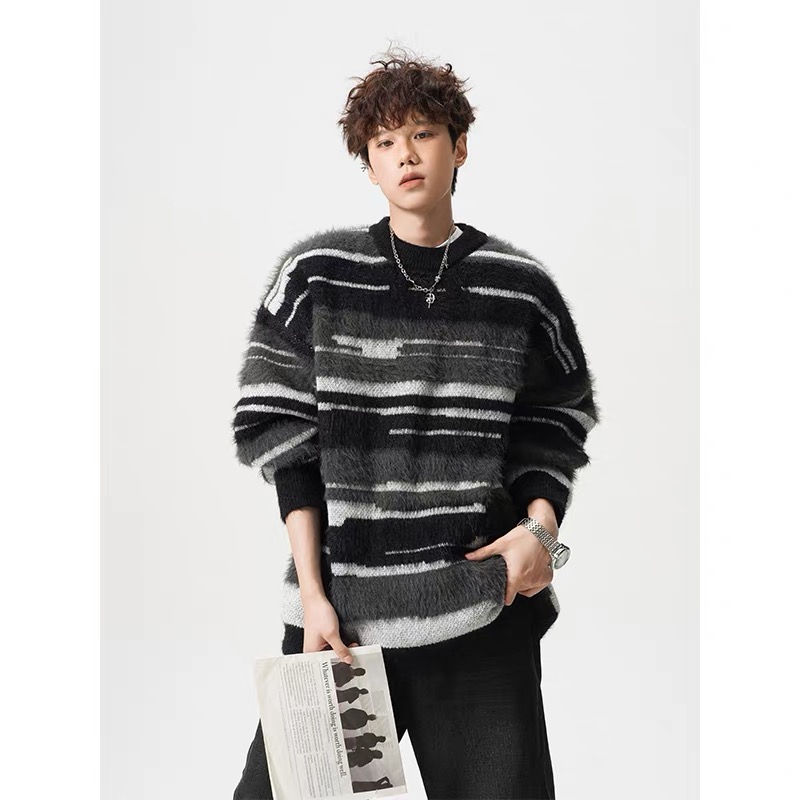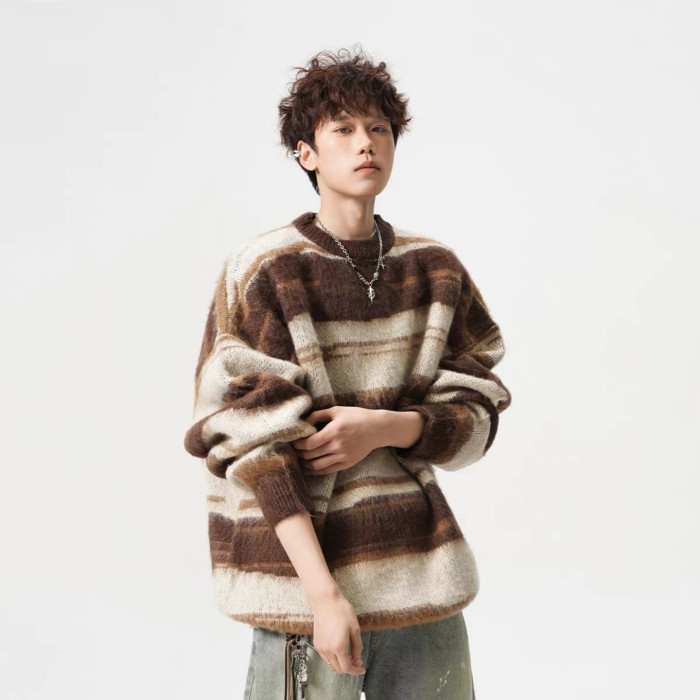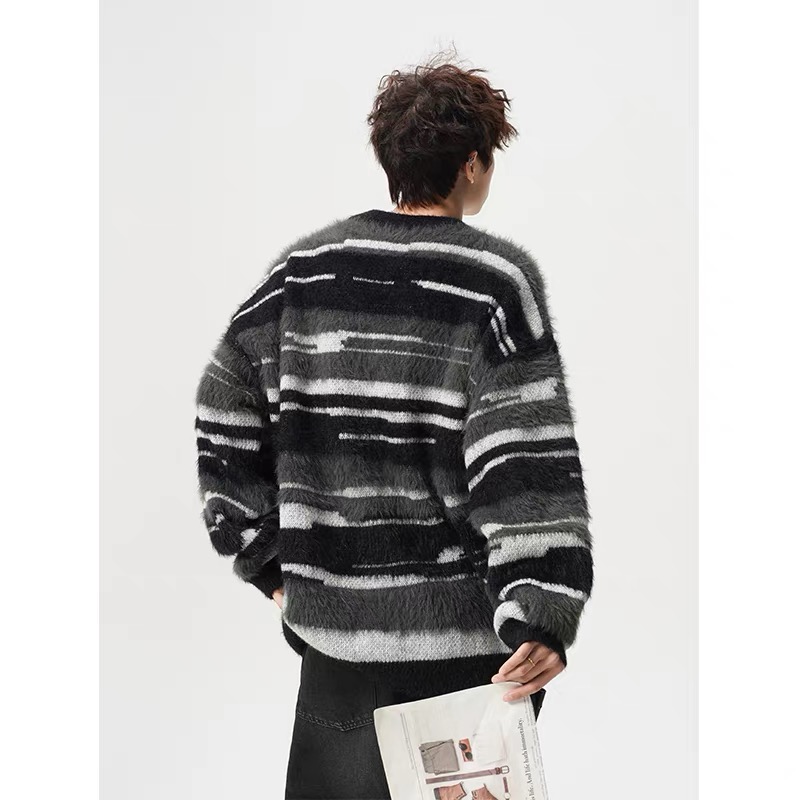 馬海毛圓領毛衣男女秋冬休閒撞色條紋針織衫寬松松弛感情侶打底衫
