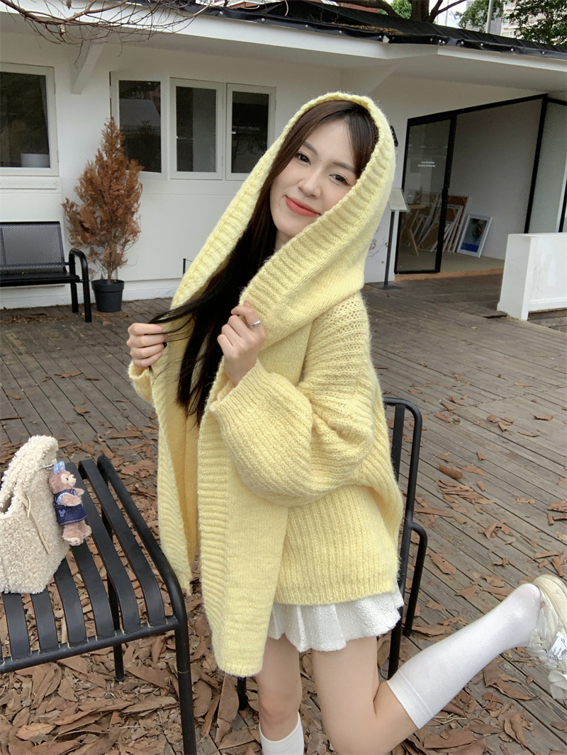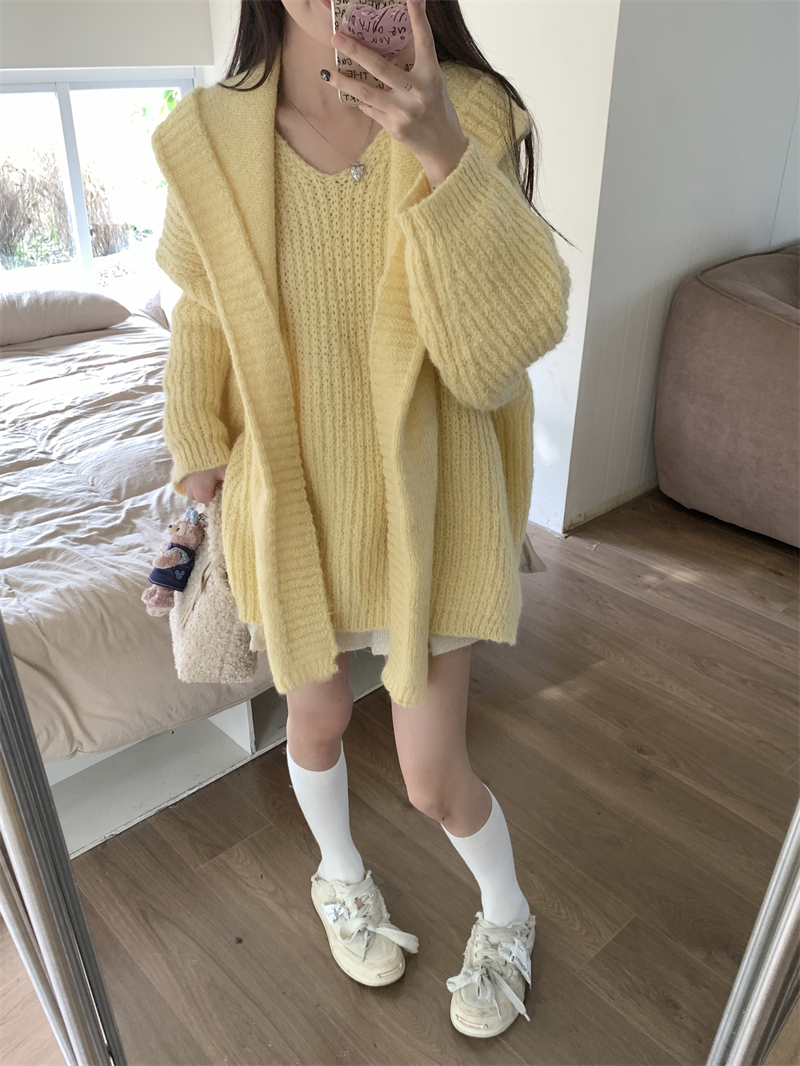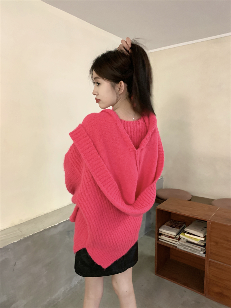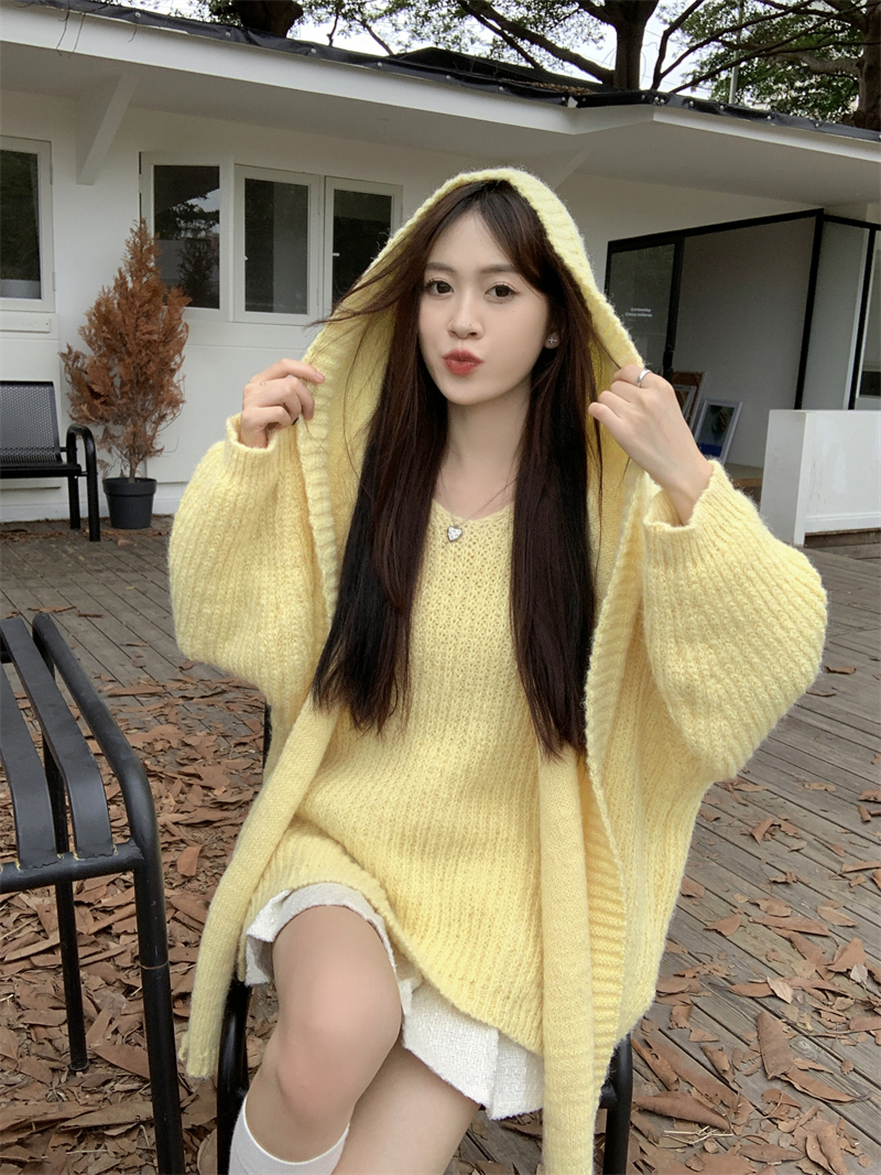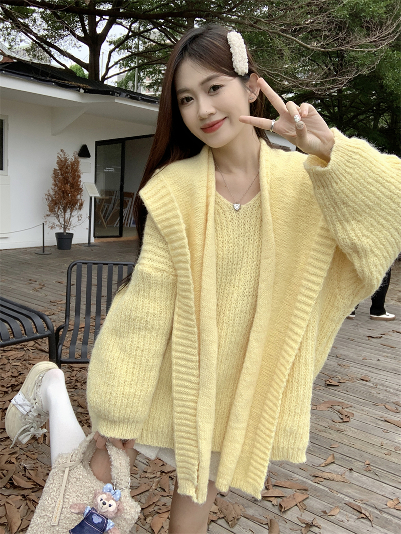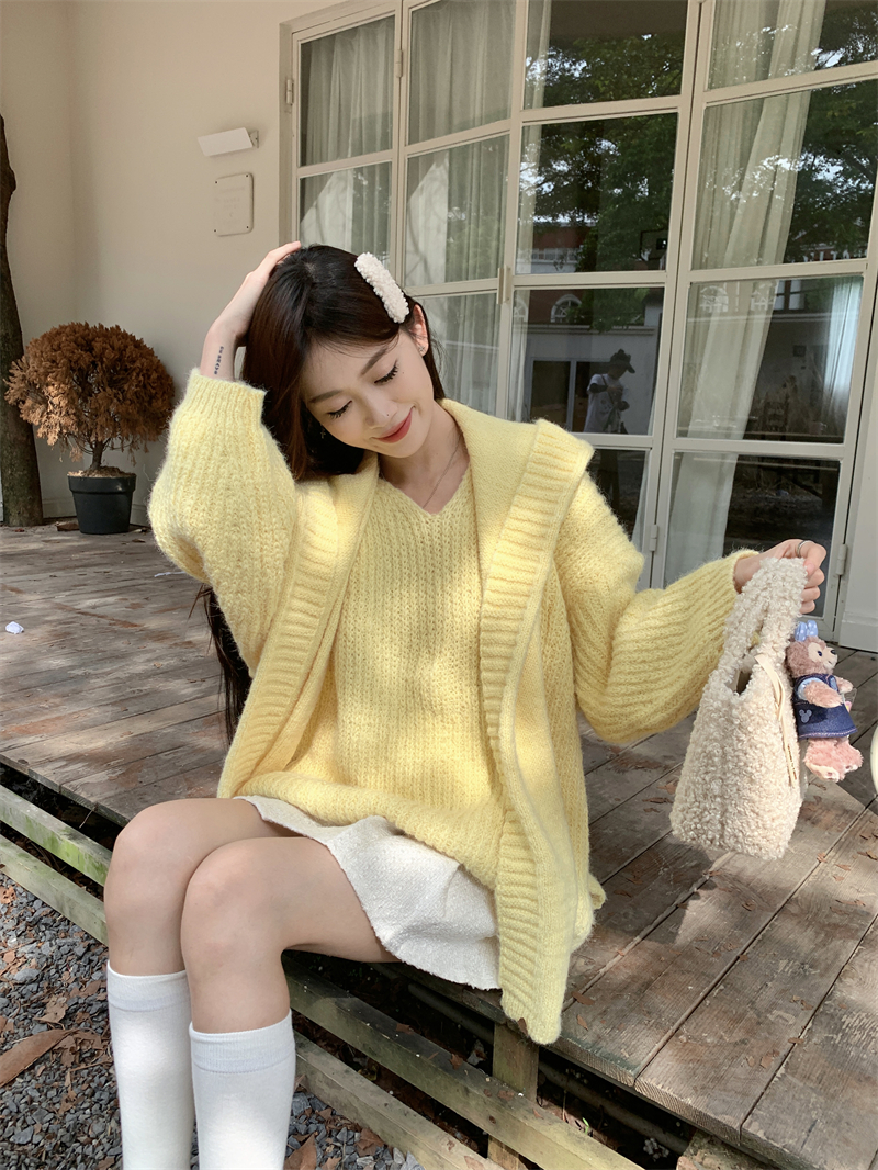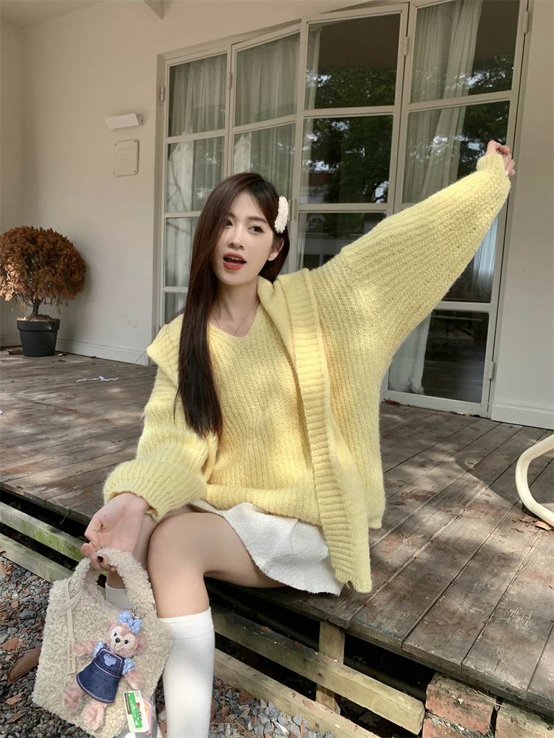 慵懶風寬松長袖連帽毛衣女初秋穿搭韓系爆款通勤針織衫兩件套上衣