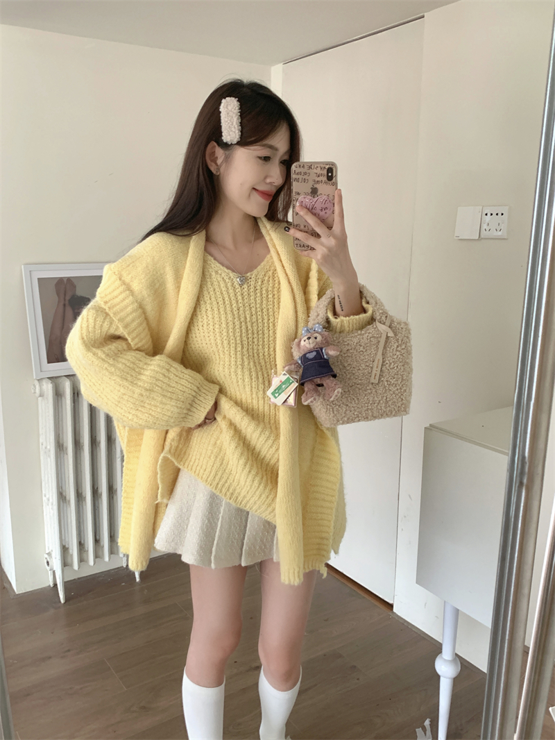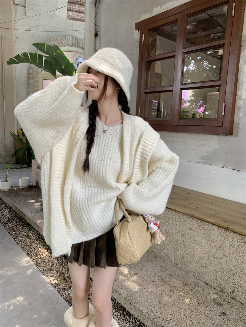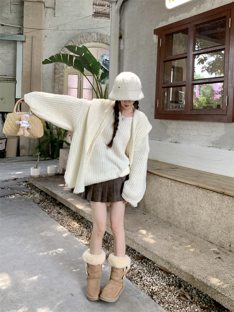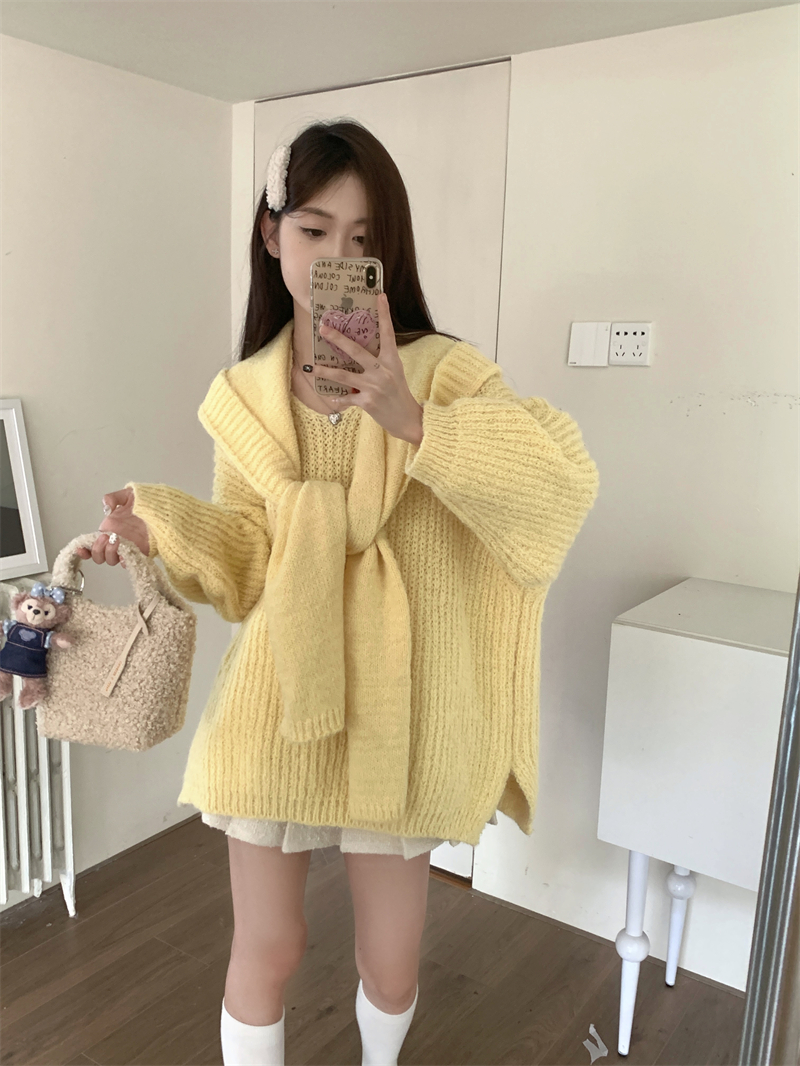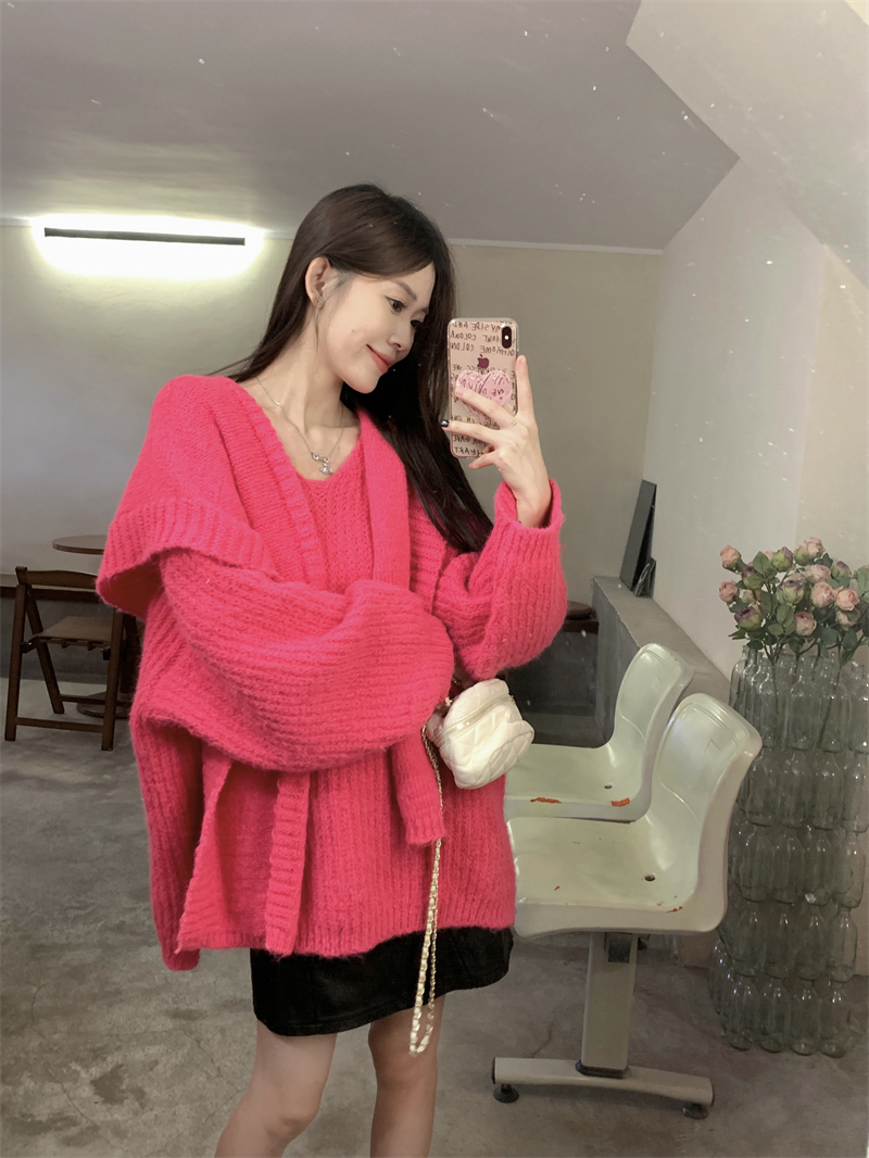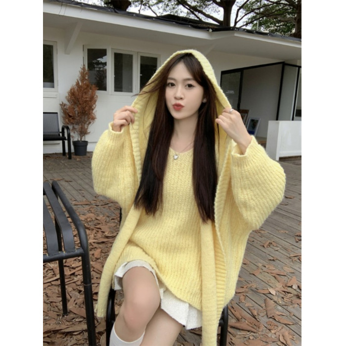 慵懶風寬松長袖連帽毛衣女初秋穿搭韓系爆款通勤針織衫兩件套上衣