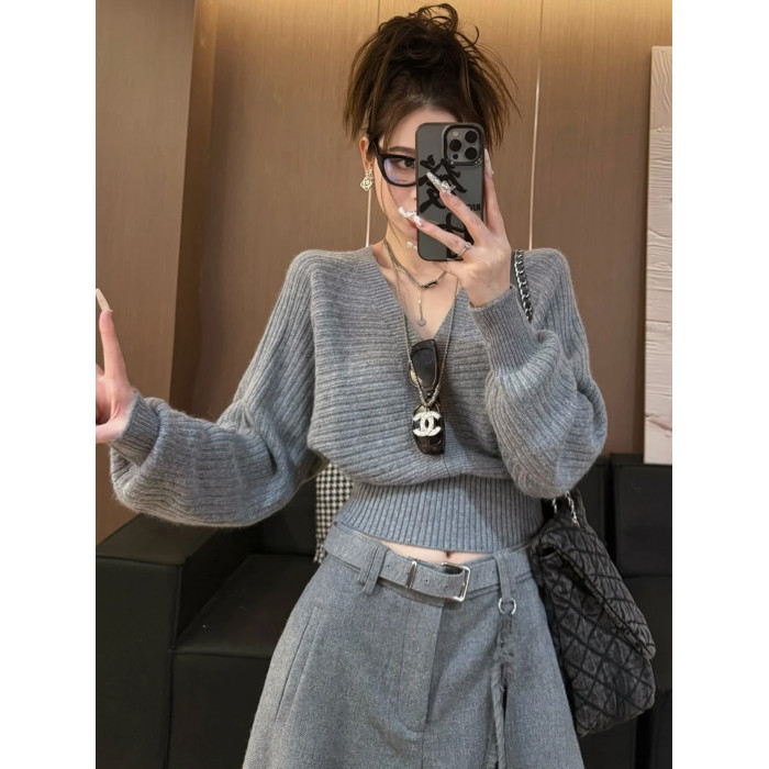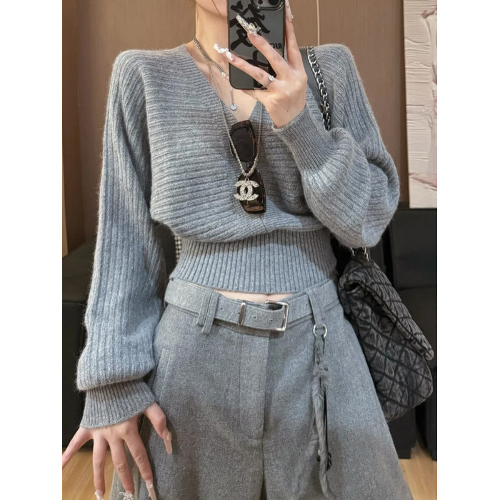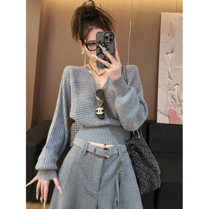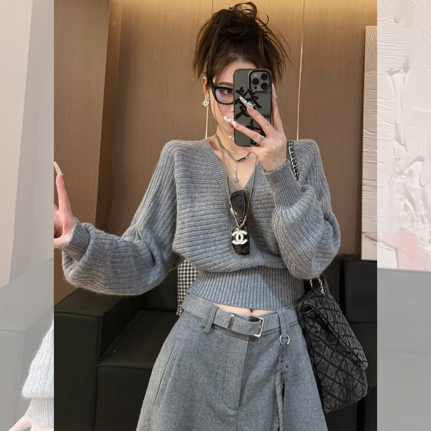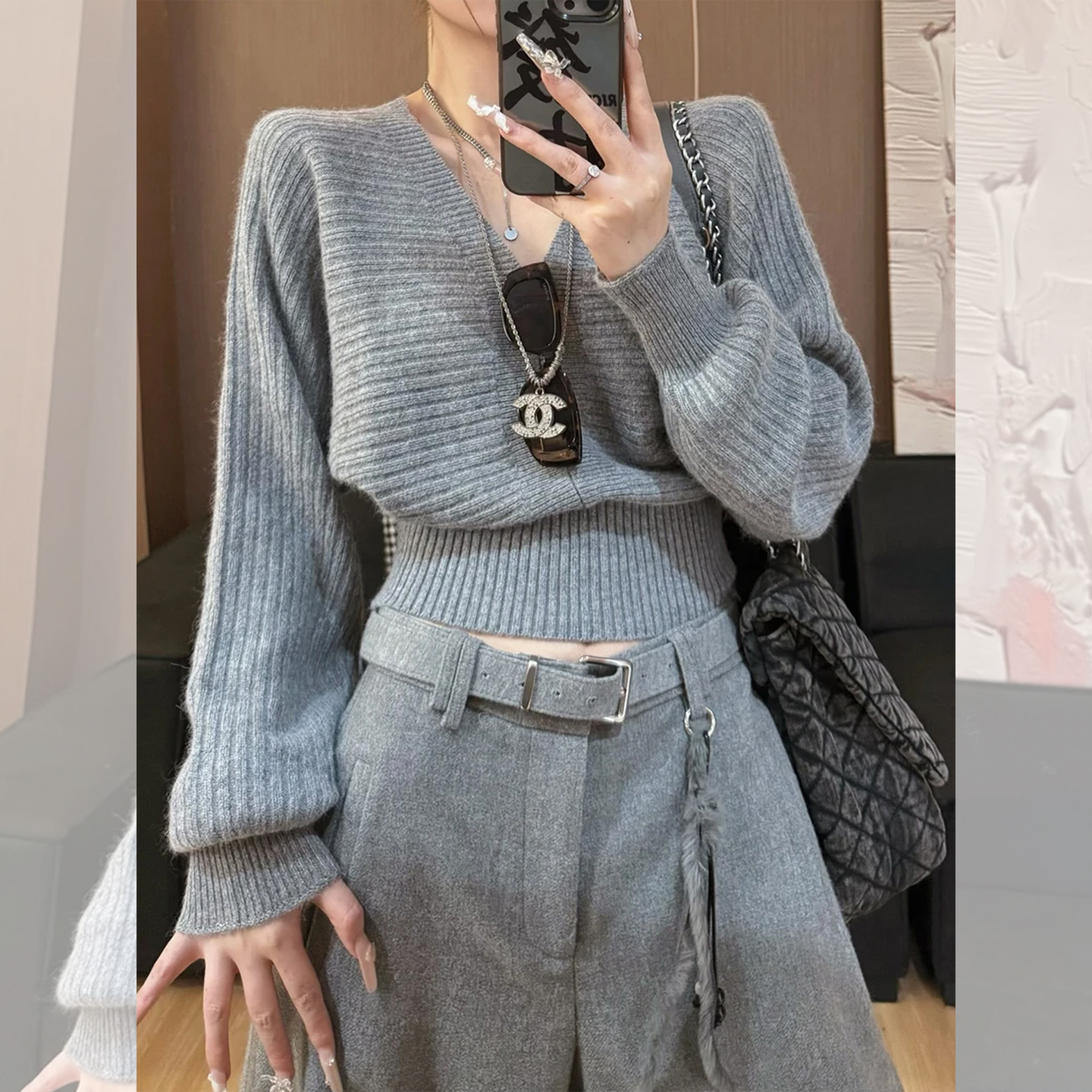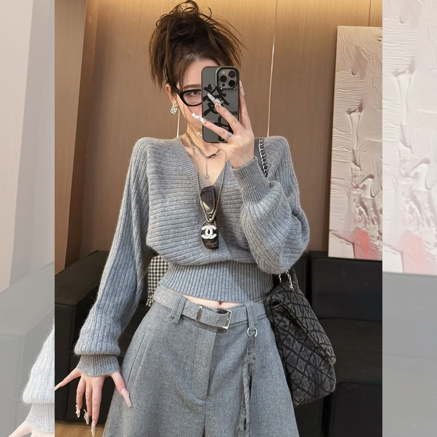 時尚獨特蝙蝠袖V領毛衣女秋冬慵懶寬松顯瘦內搭外穿短款針織上衣