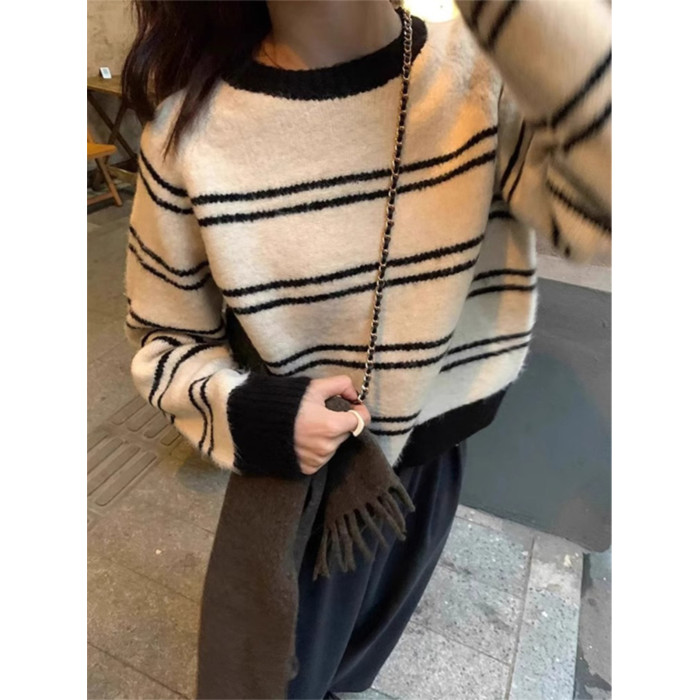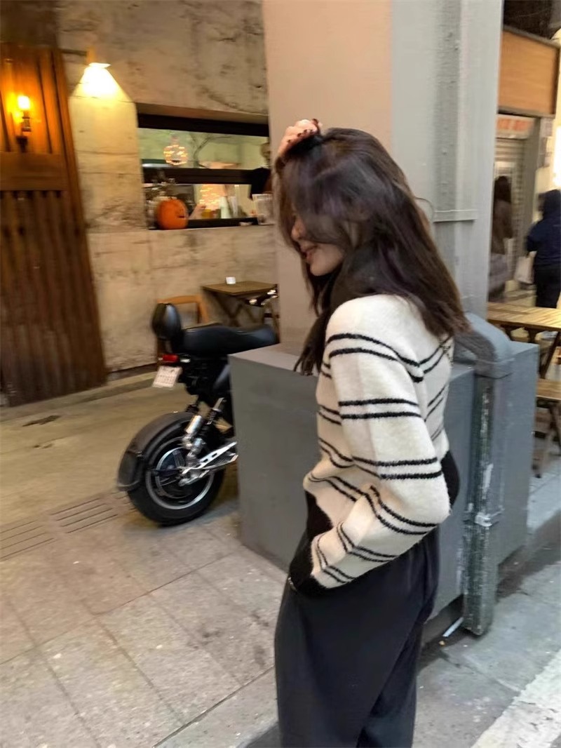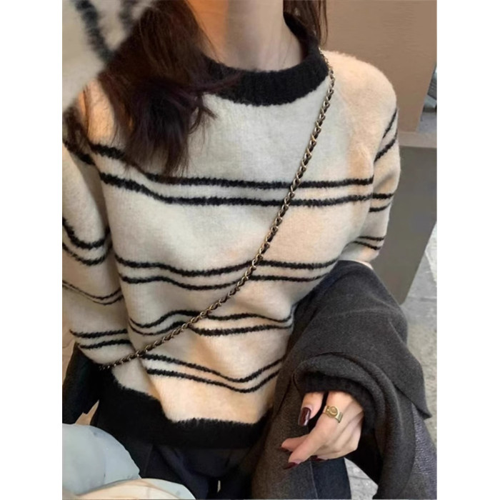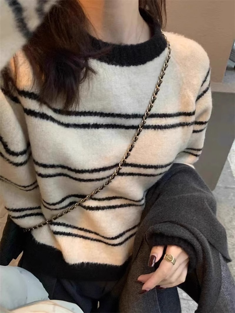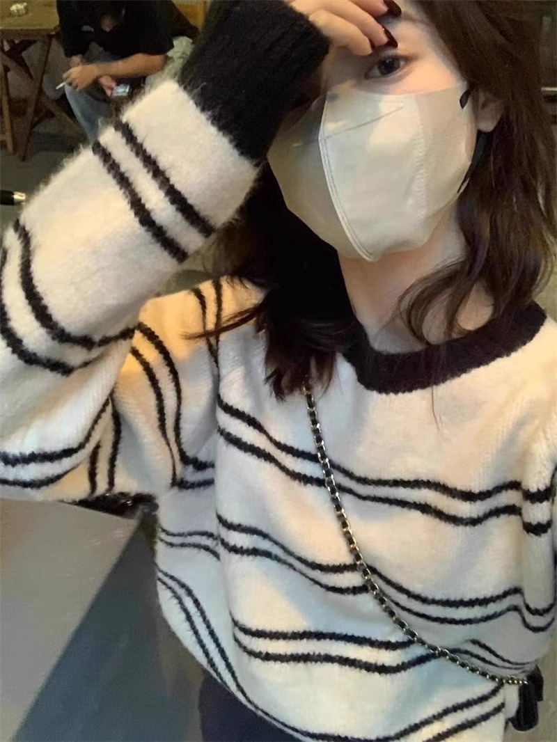 浣熊絨軟糯套頭短款條紋毛衣女秋冬冬季加厚內搭小個子打底針織衫