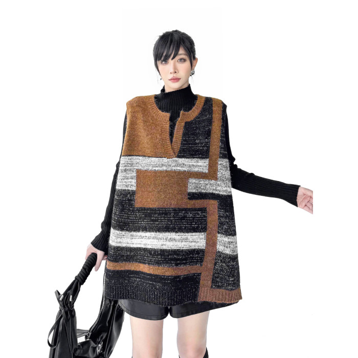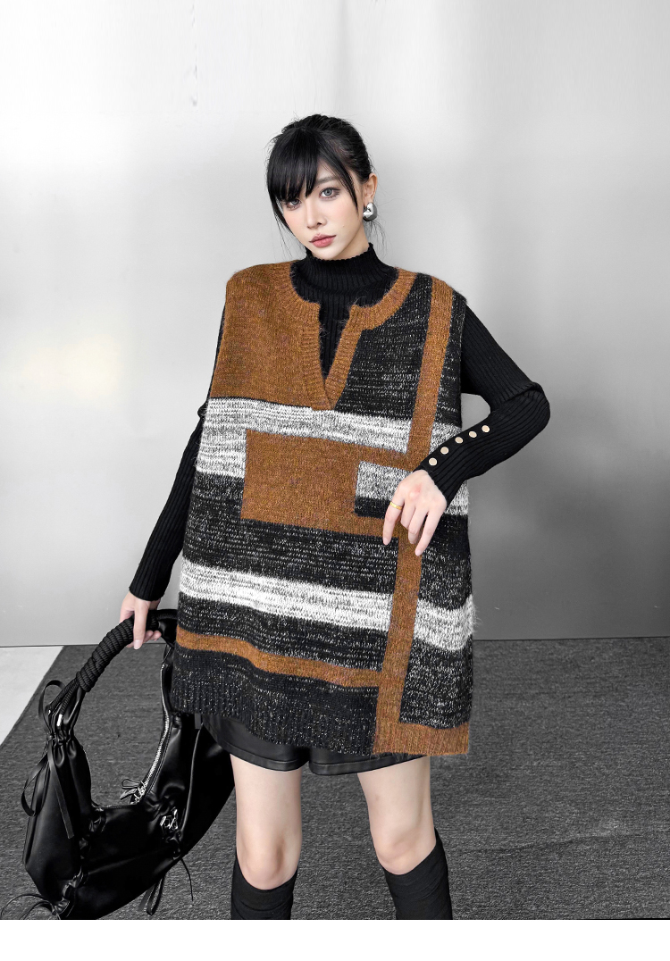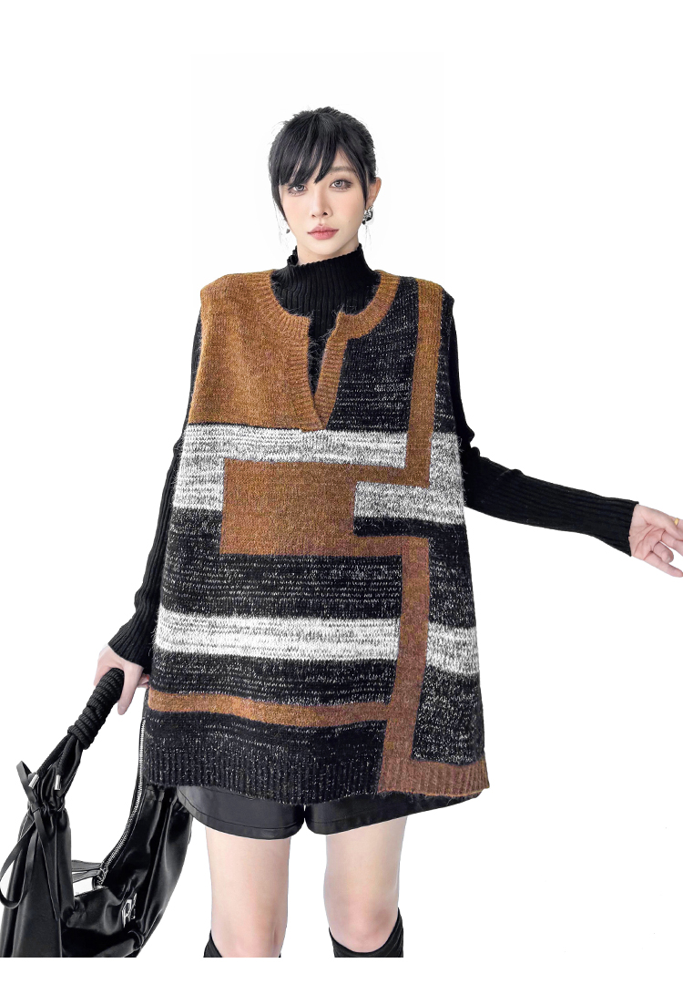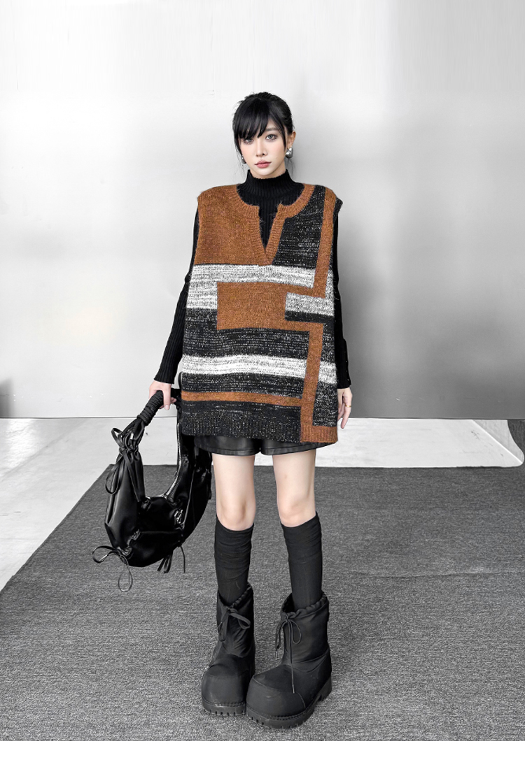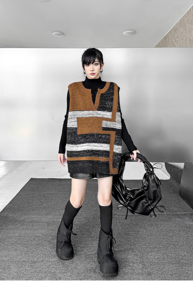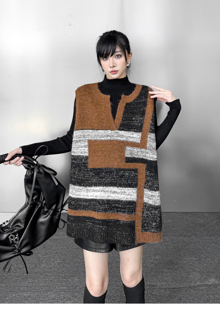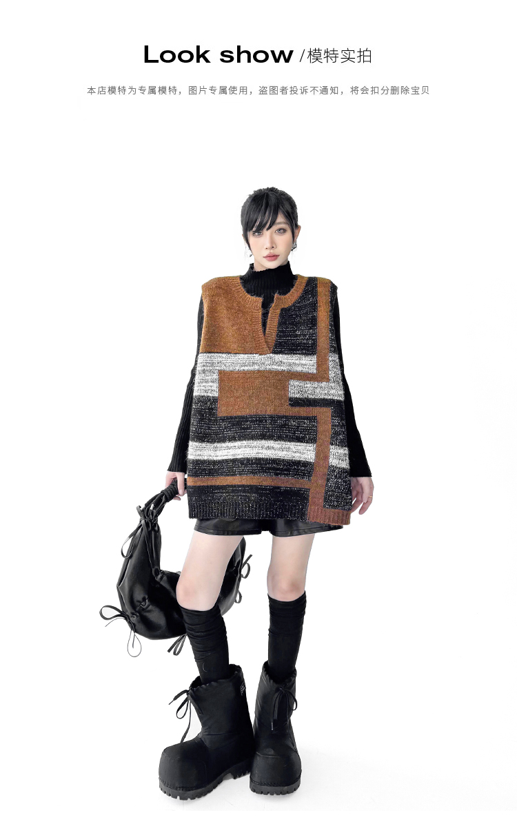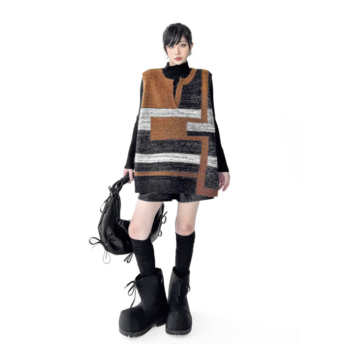 美拉德復古風撞色拼接毛衣馬甲女2025冬新款時尚寬松無袖針織背心