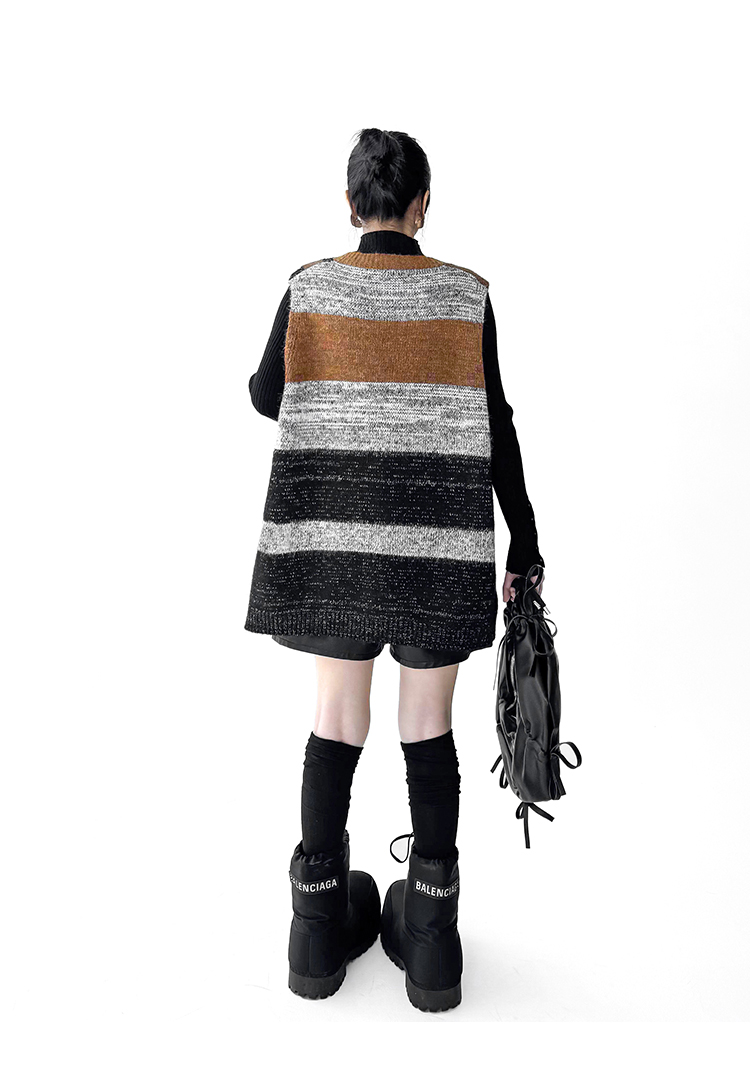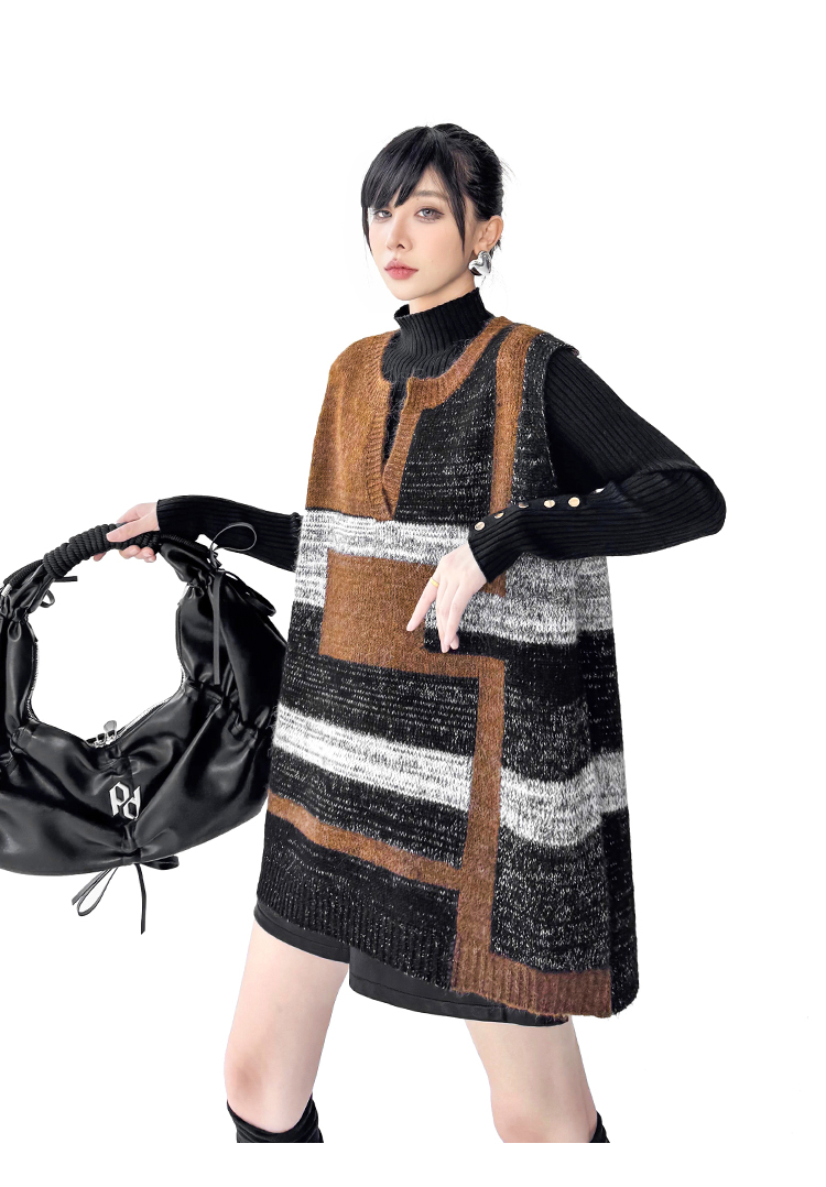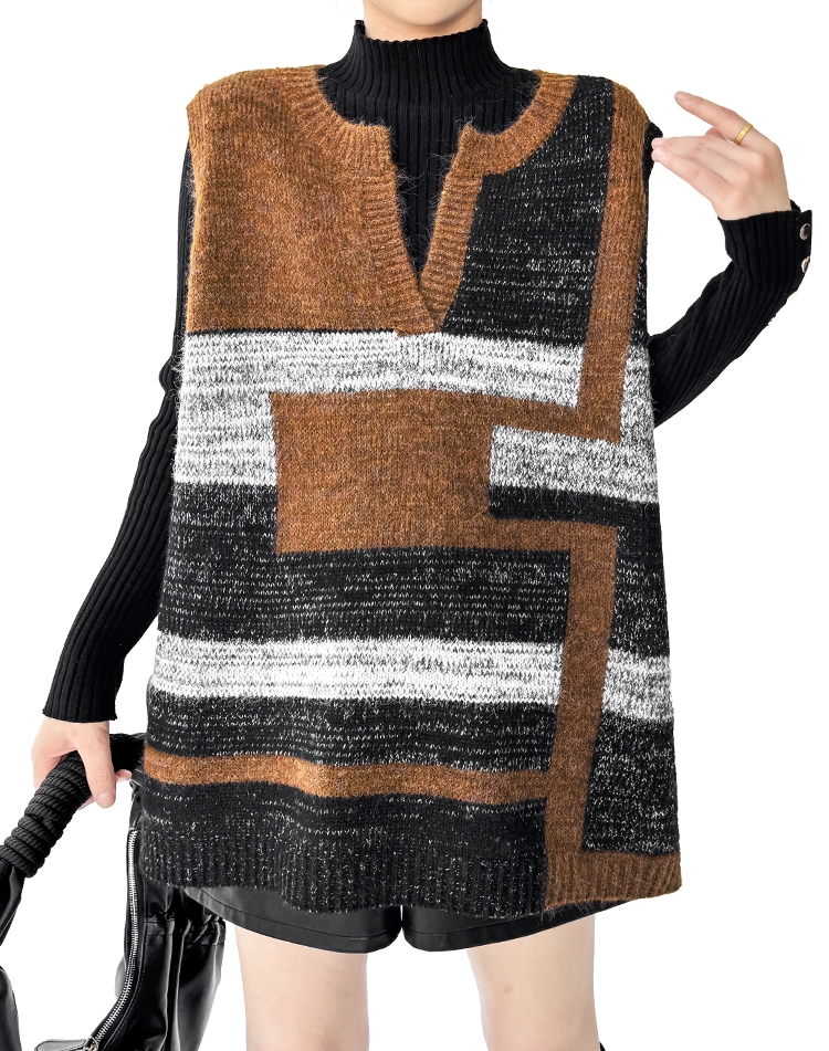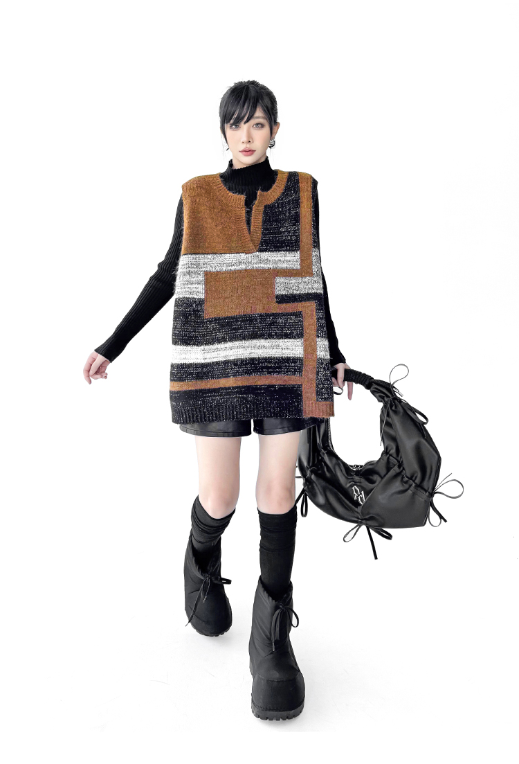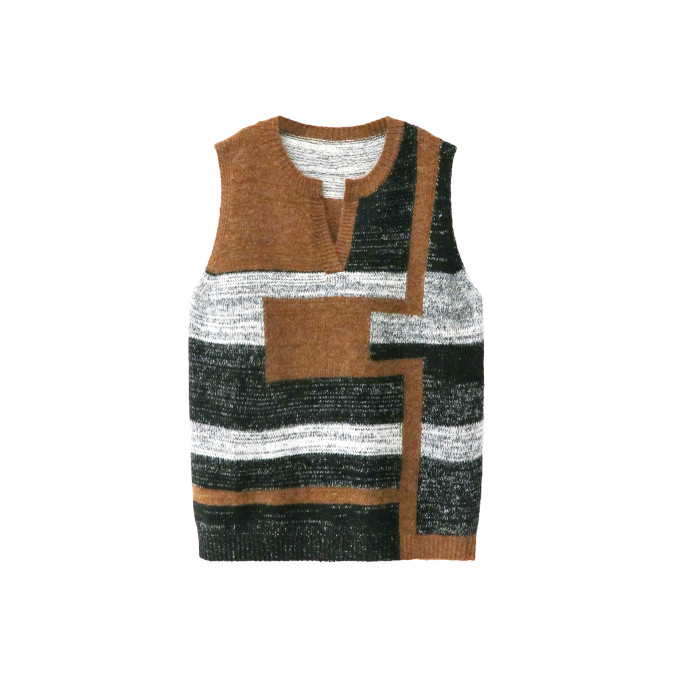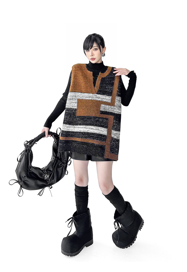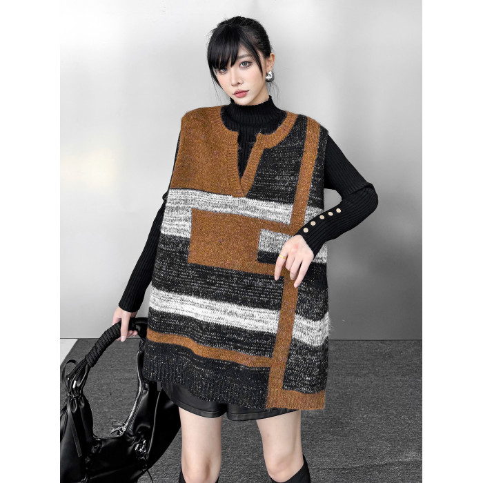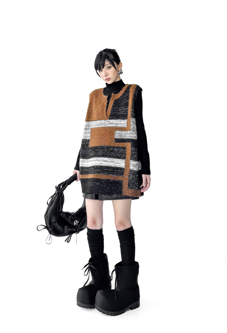 美拉德復古風撞色拼接毛衣馬甲女2025冬新款時尚寬松無袖針織背心