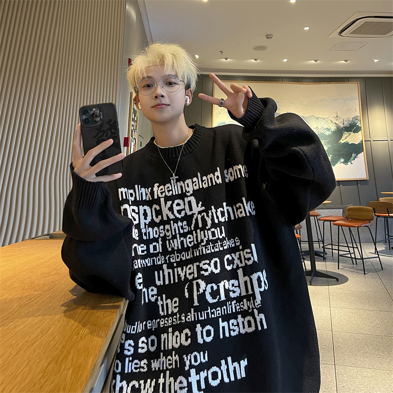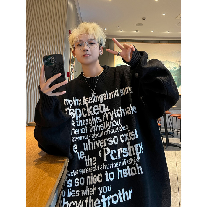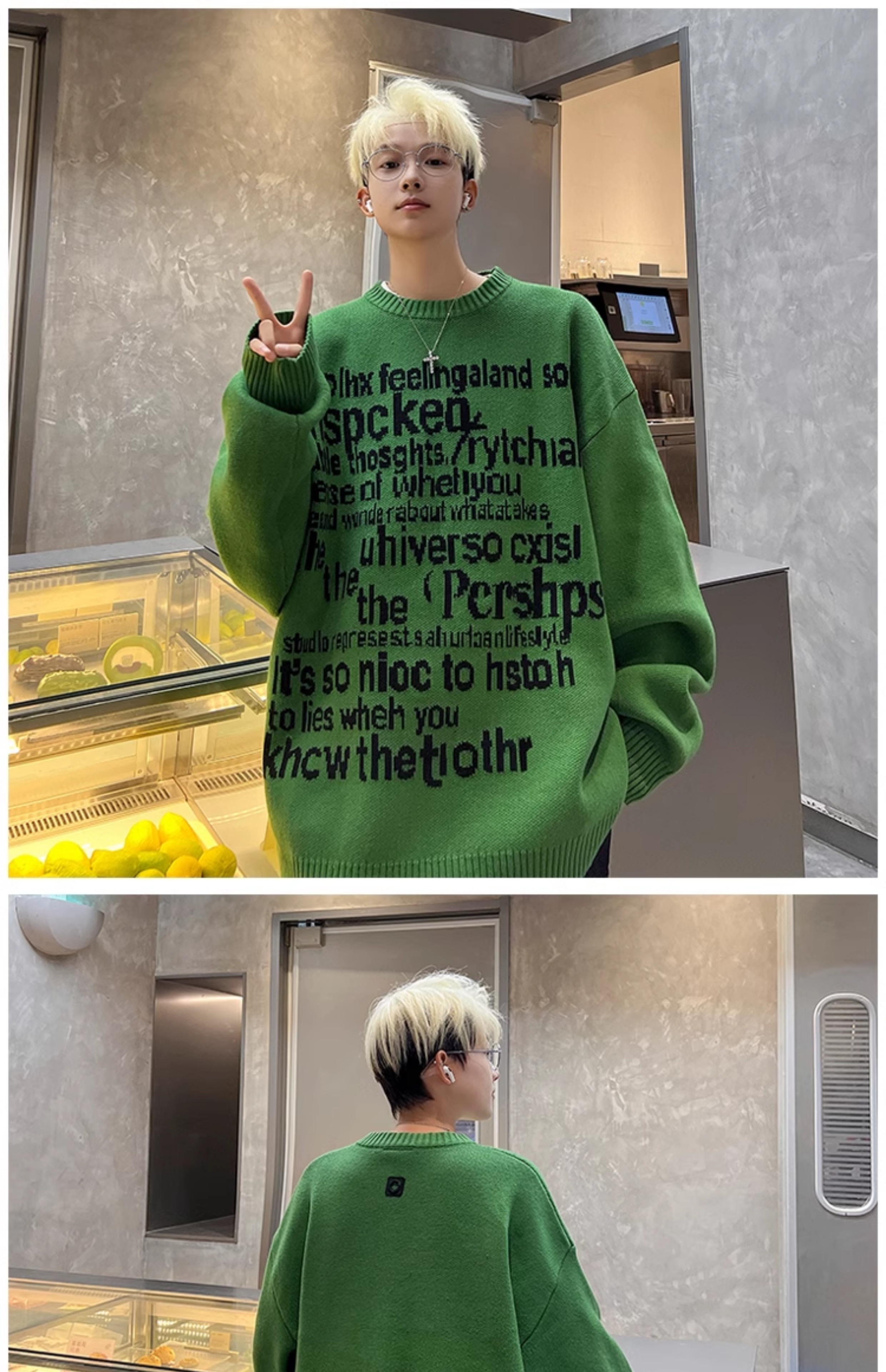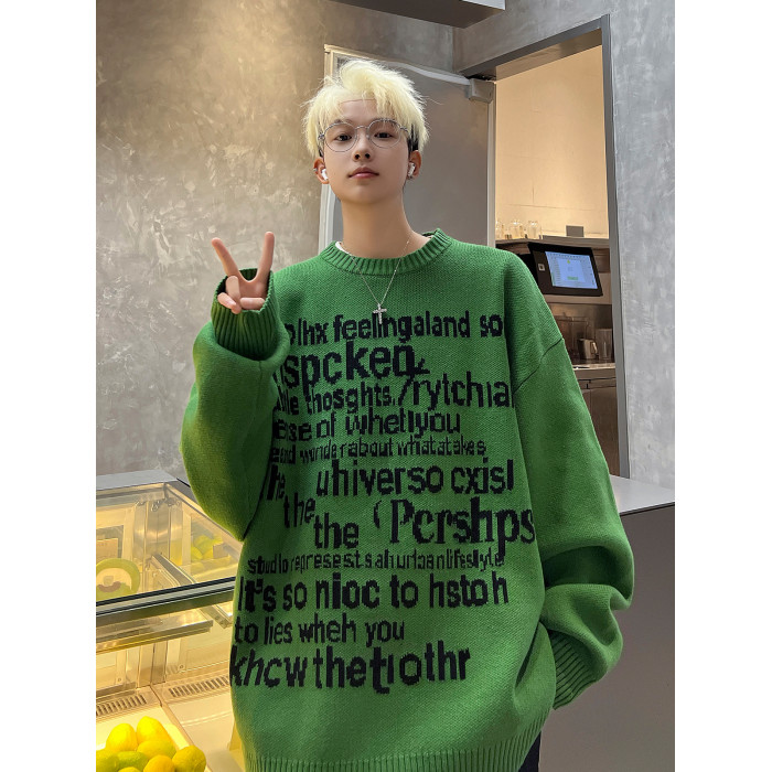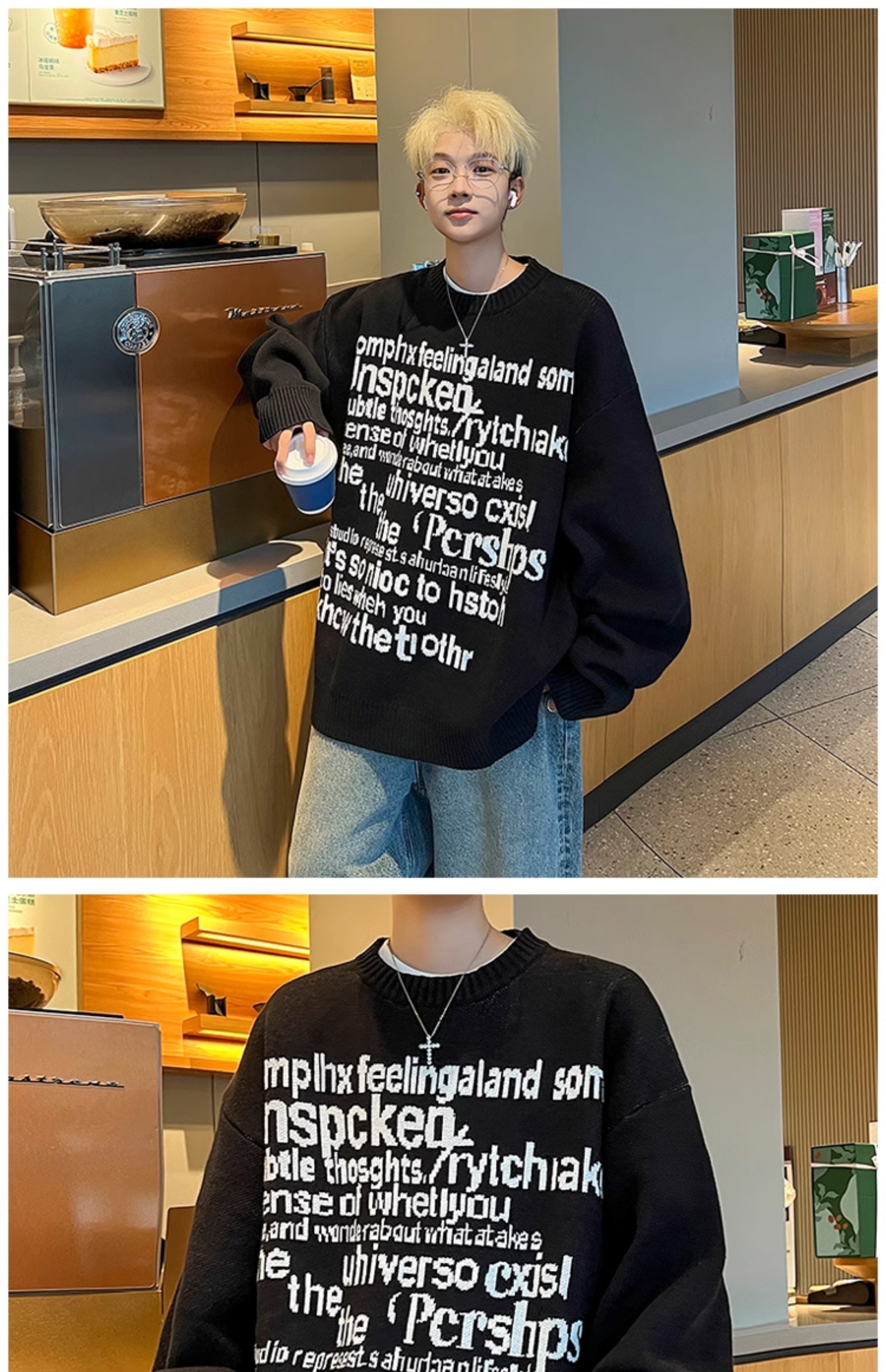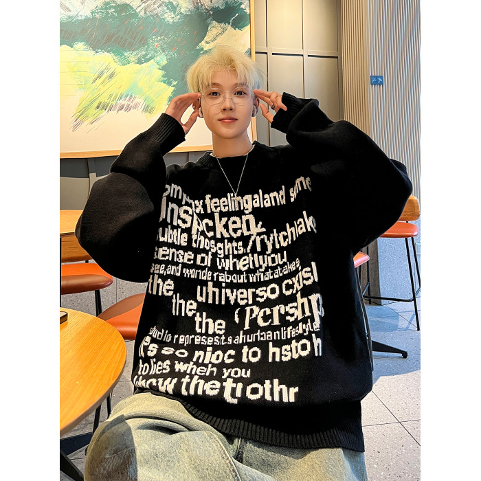 字母提花毛衣男秋冬季日系復古vintage寬松青少年保暖外穿針織衫