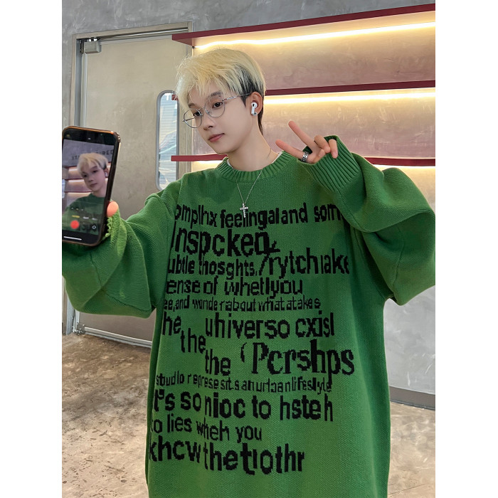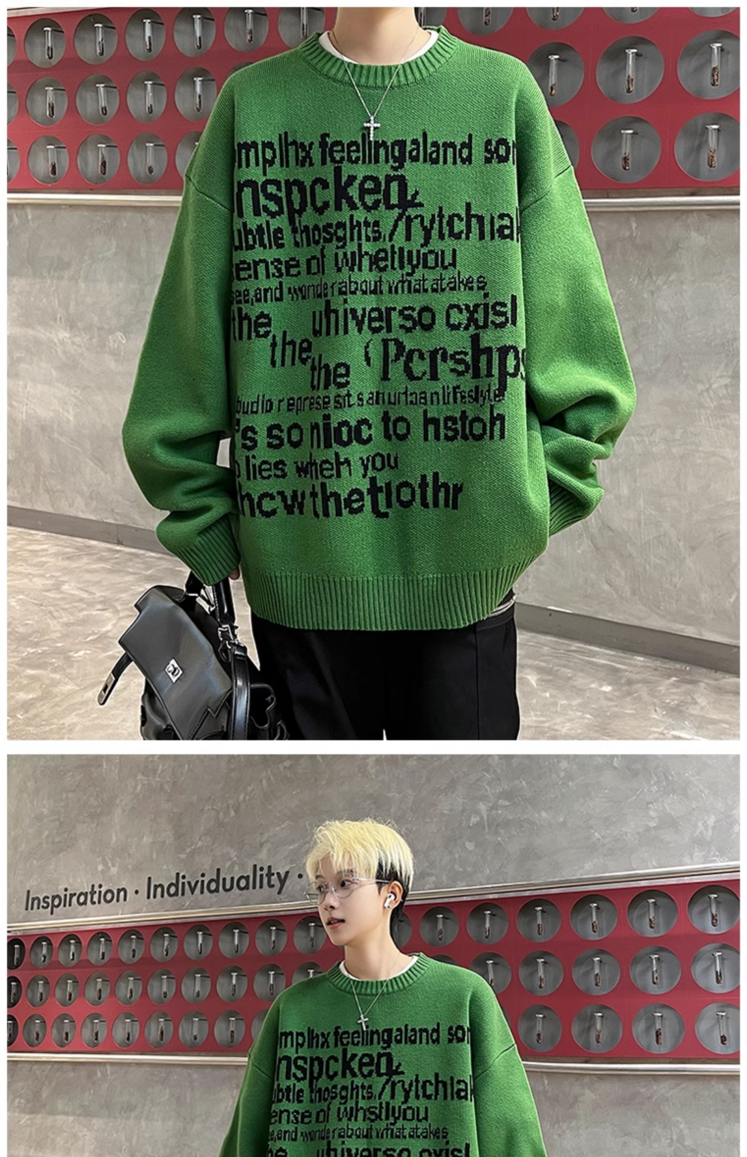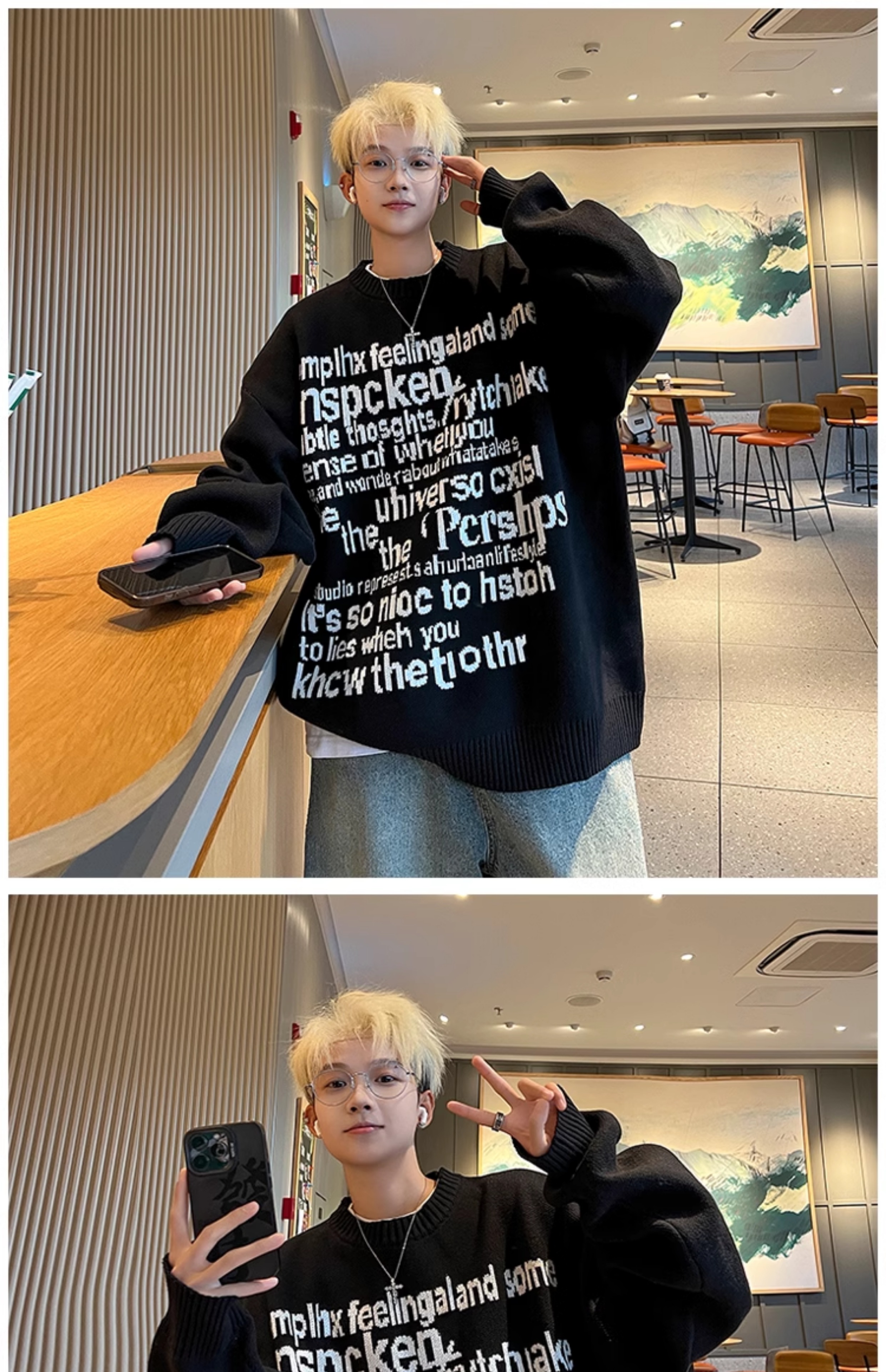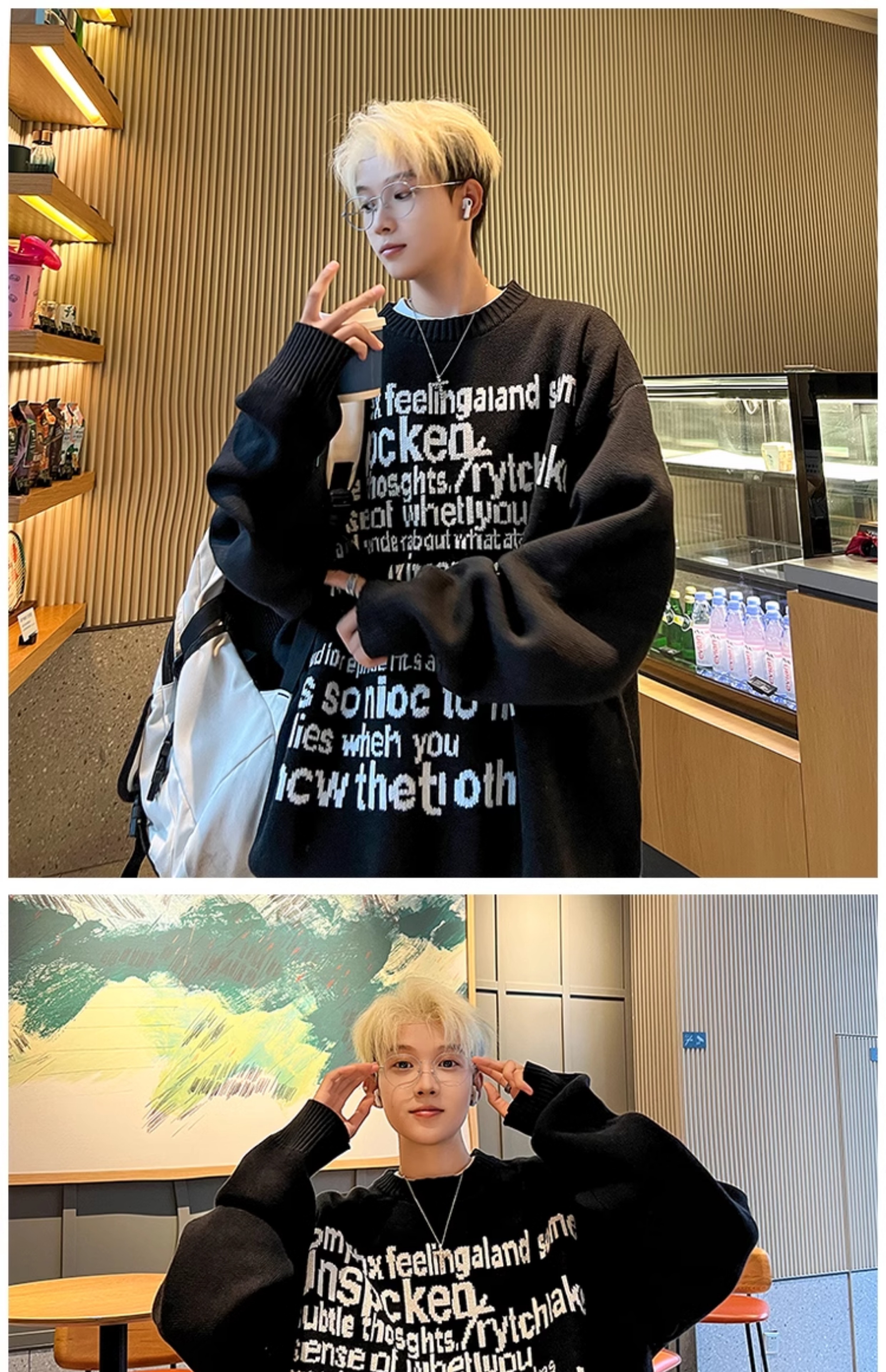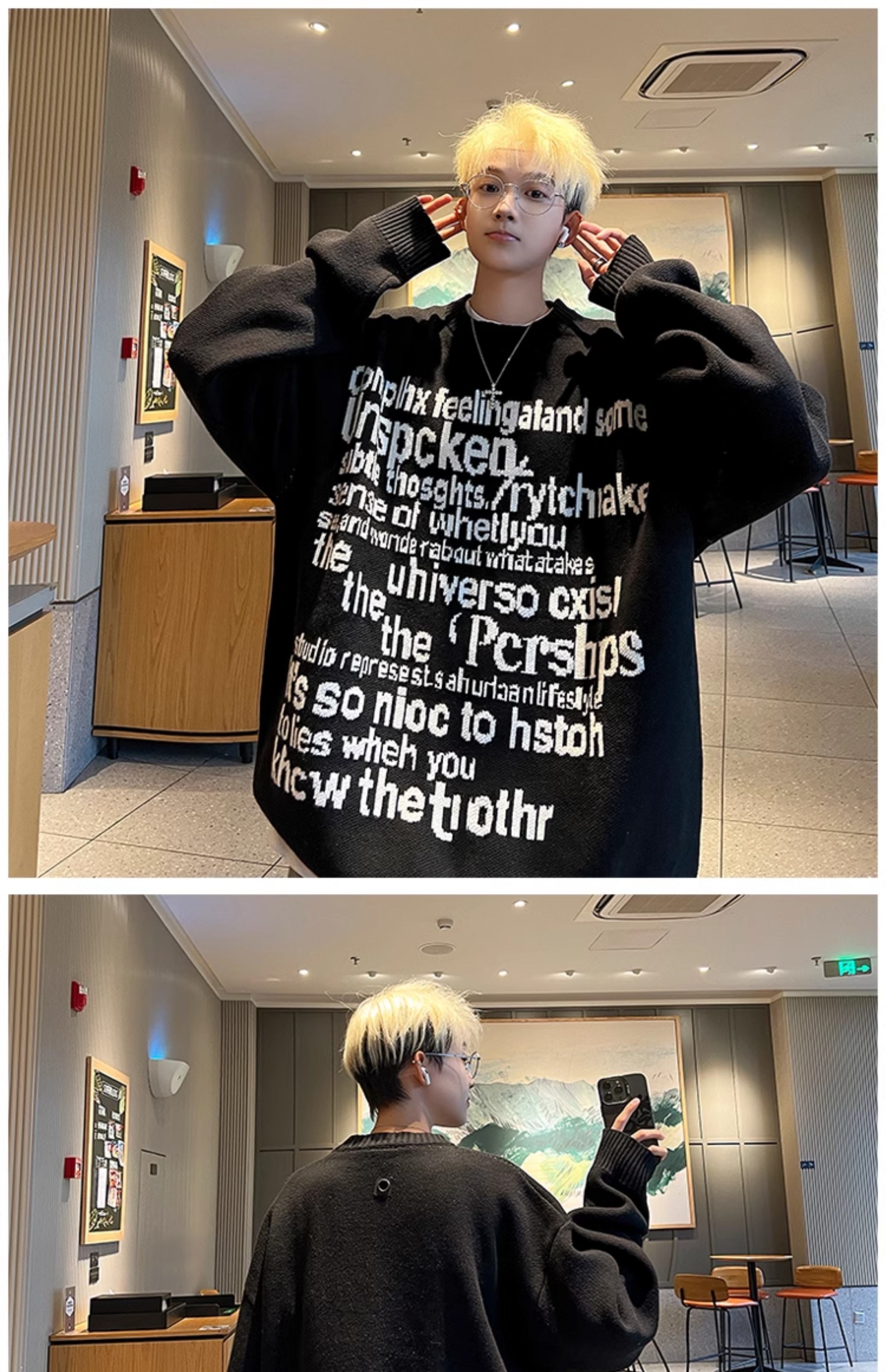 字母提花毛衣男秋冬季日系復古vintage寬松青少年保暖外穿針織衫
