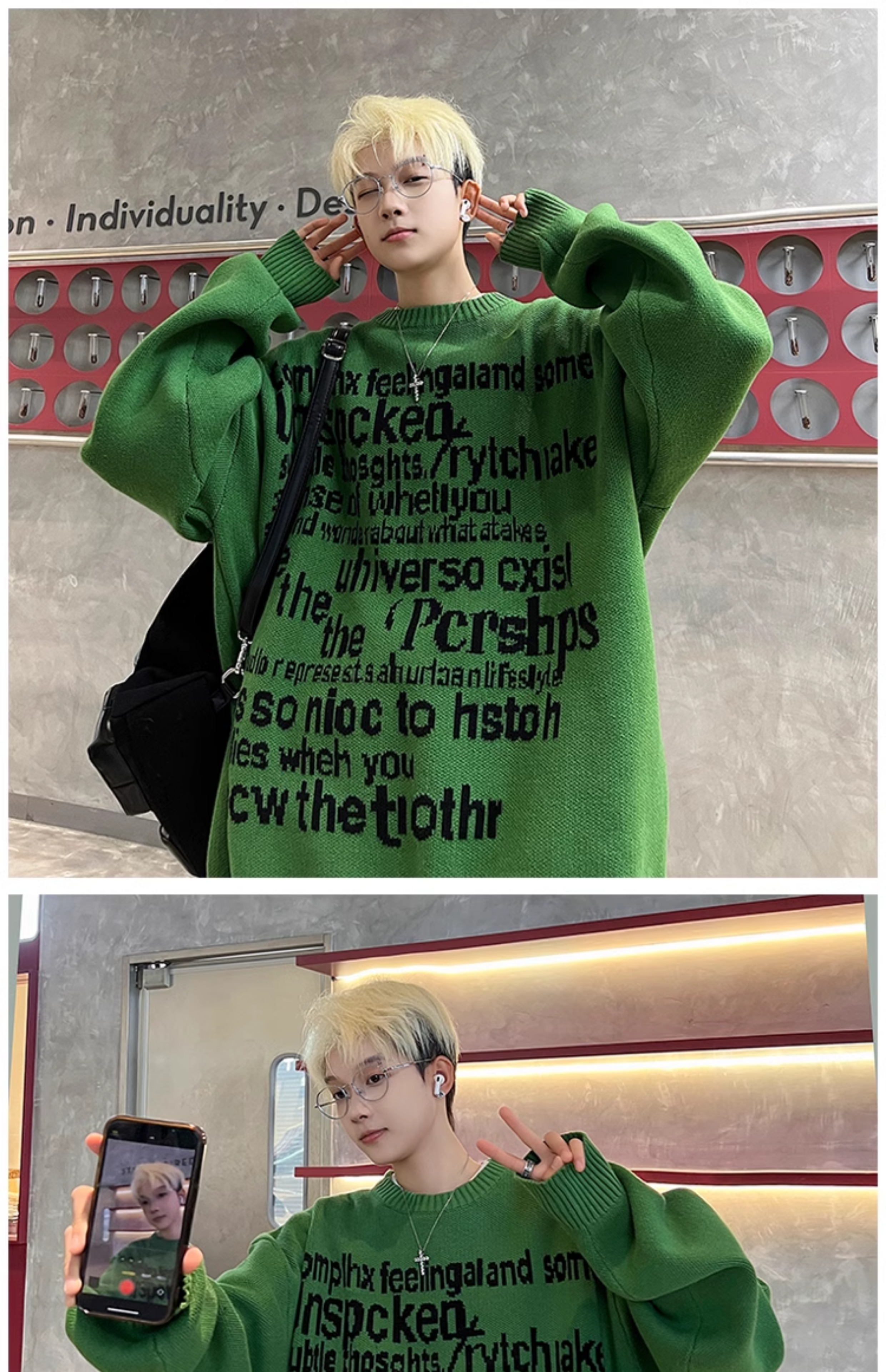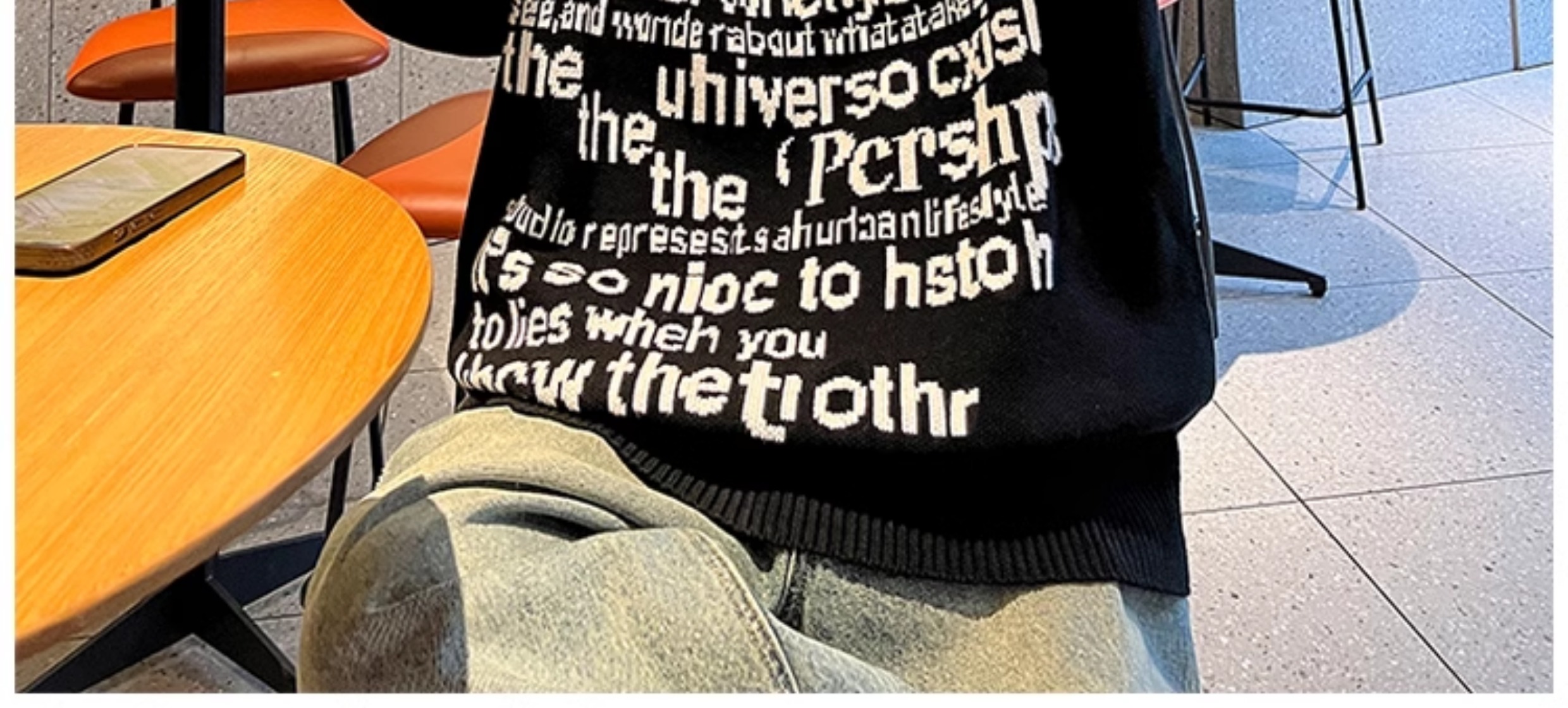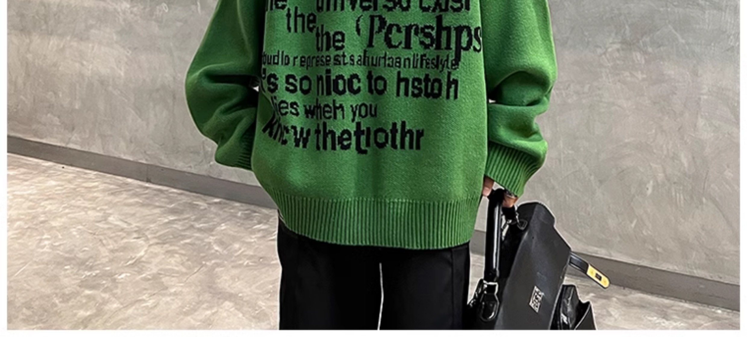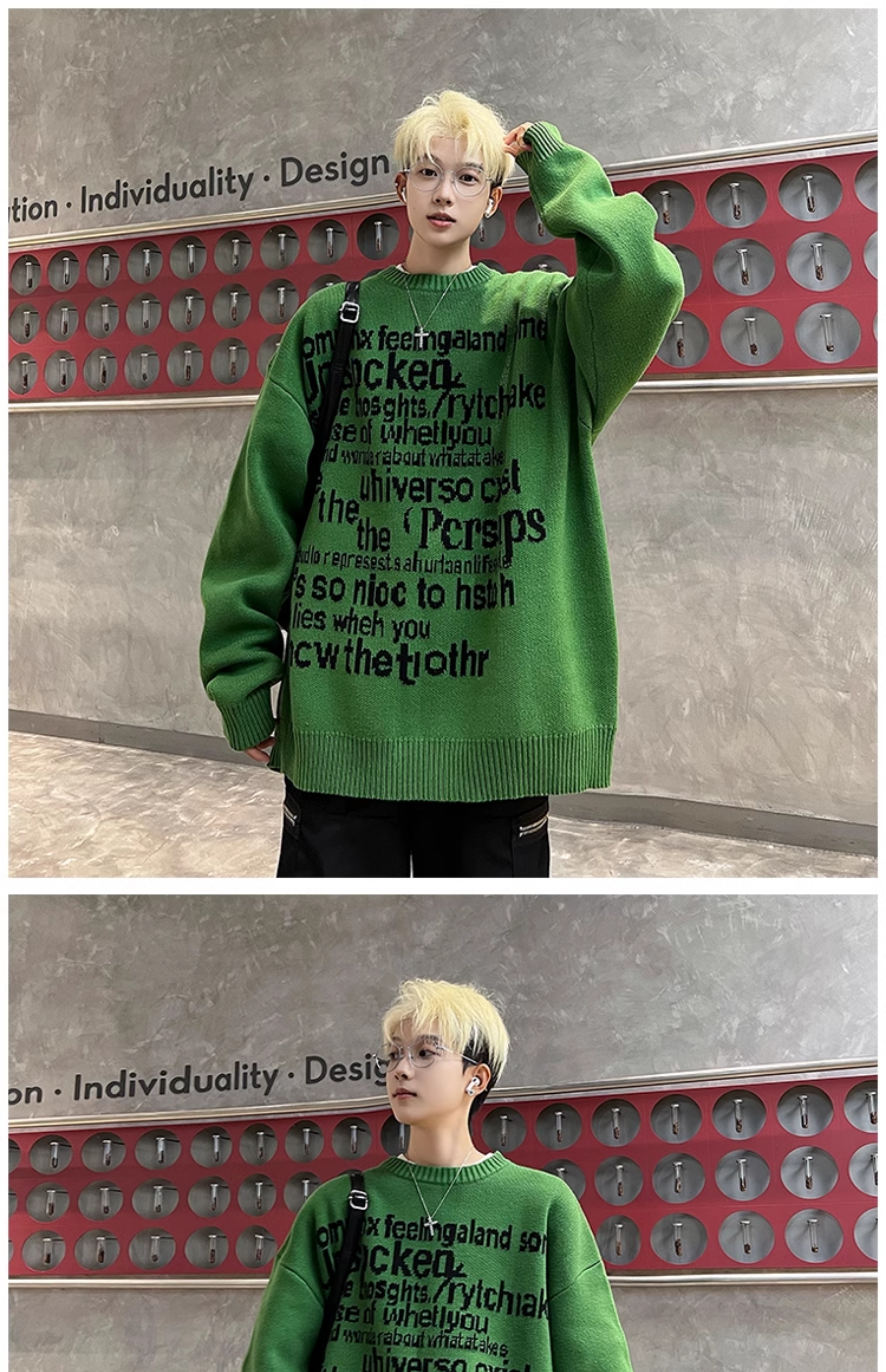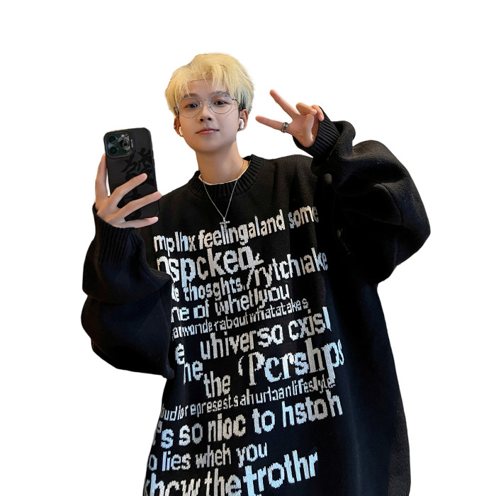 字母提花毛衣男秋冬季日系復古vintage寬松青少年保暖外穿針織衫