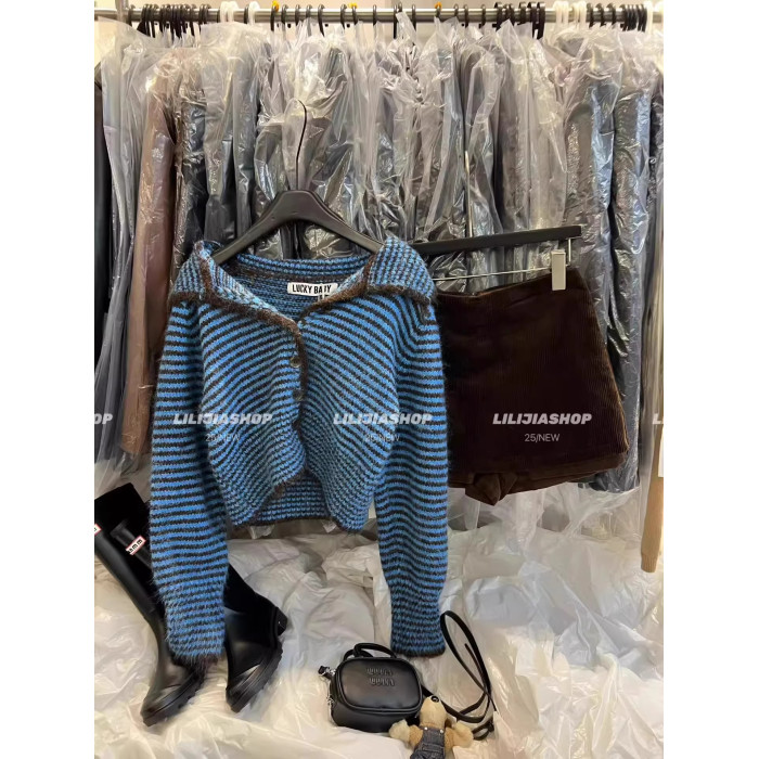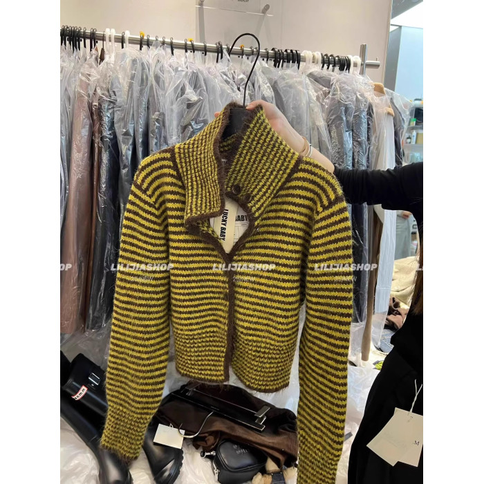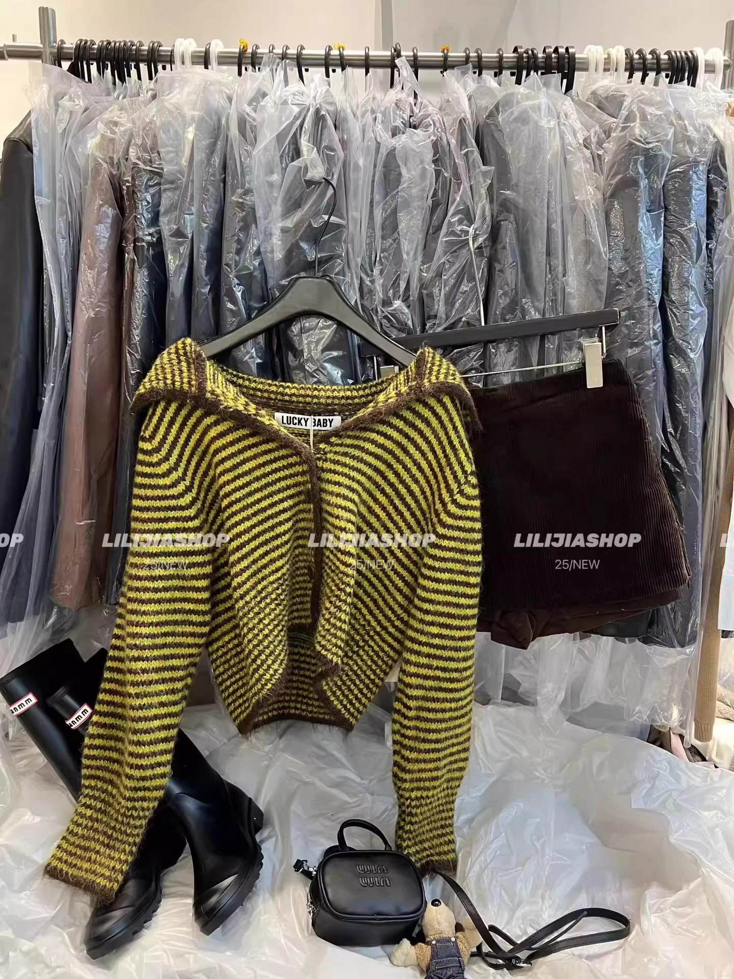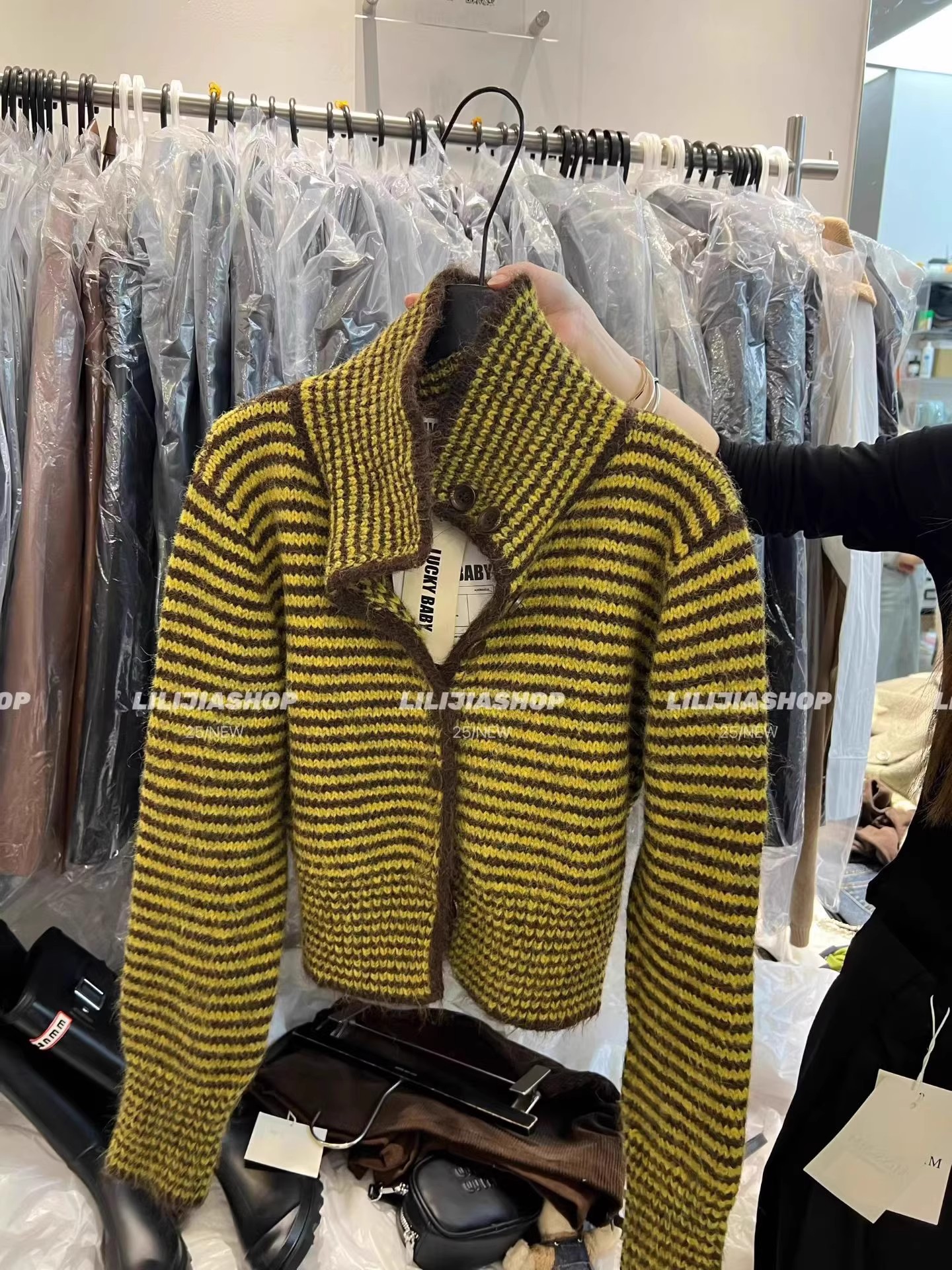 韓國東大門秋季新款韓版寬松顯瘦復古條紋針織開衫單排釦毛衣外套