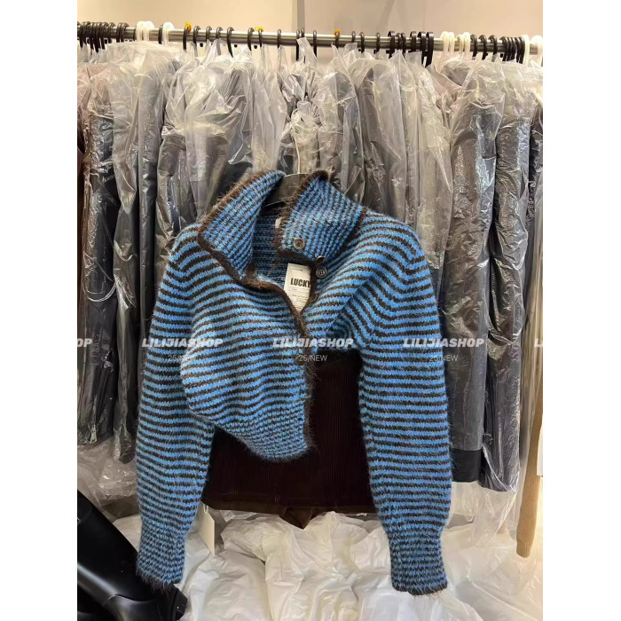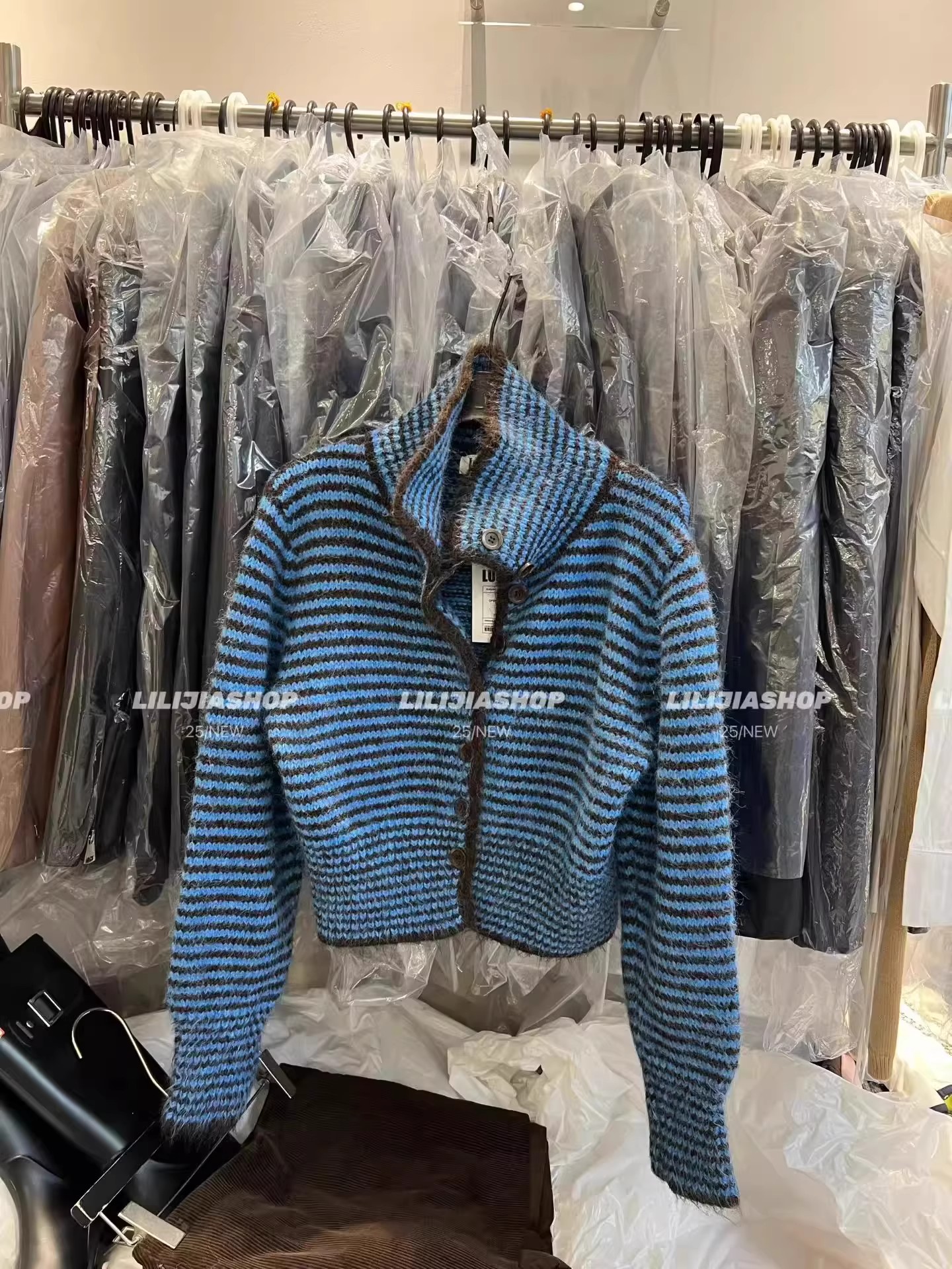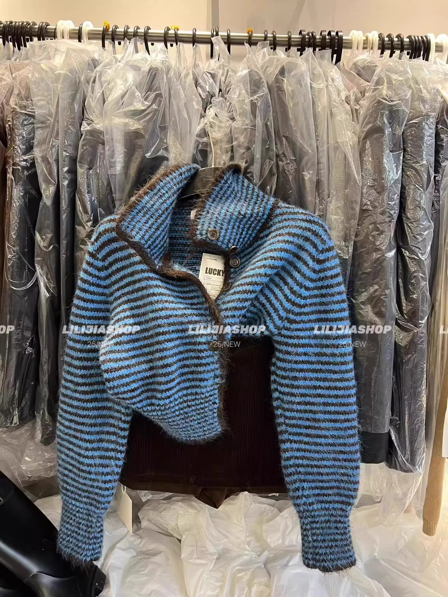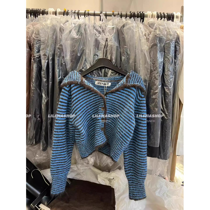 韓國東大門秋季新款韓版寬松顯瘦復古條紋針織開衫單排釦毛衣外套