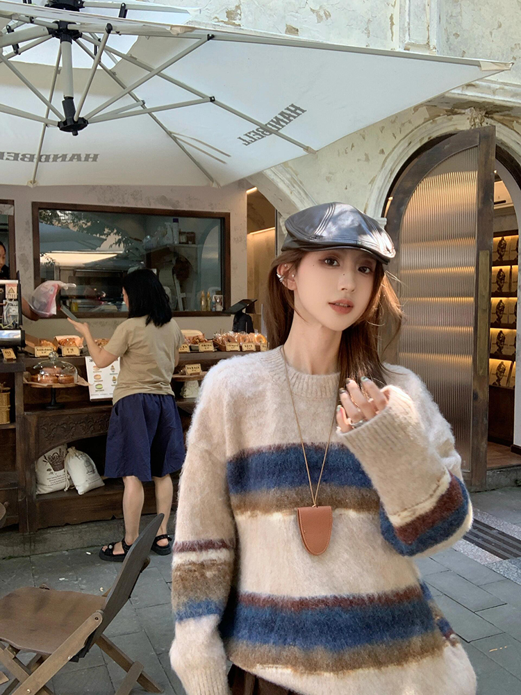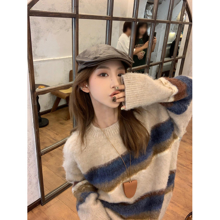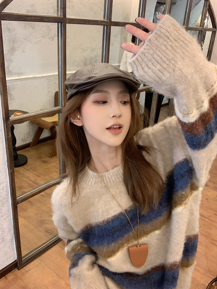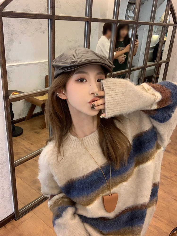 撞色條紋毛衣女秋冬軟糯慵懶松弛感復古韓系寬松針織衫上衣中長款