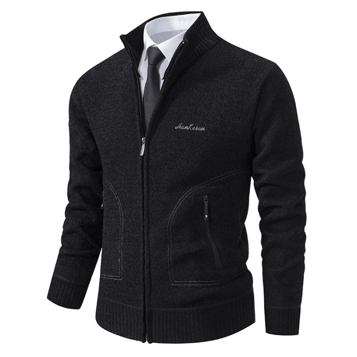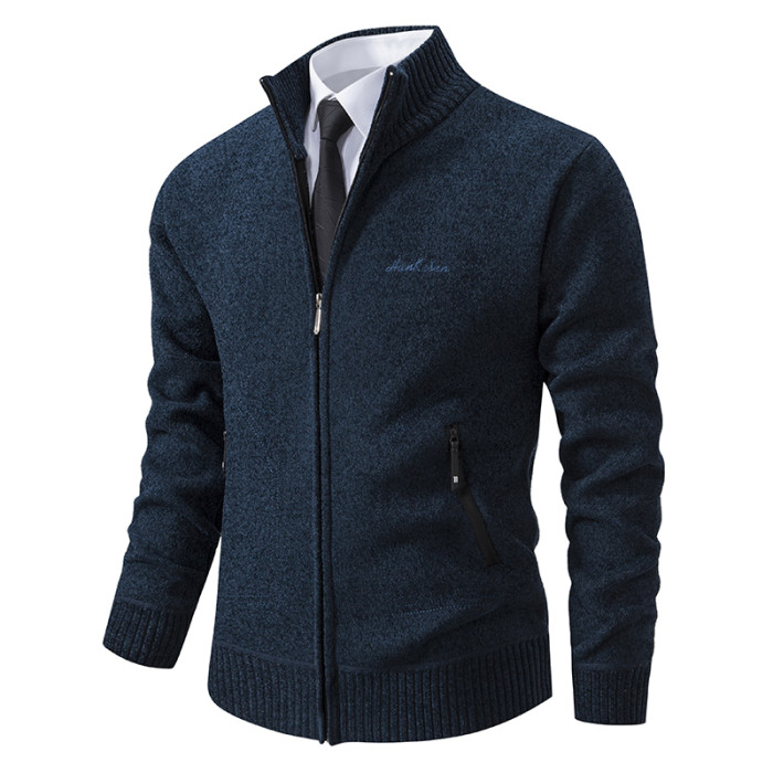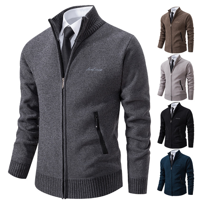 秋冬季男士立領字母綉花針織上衣加絨加厚時尚休閒百搭潮流毛衣男