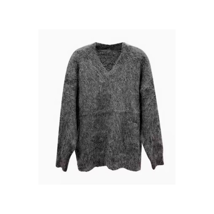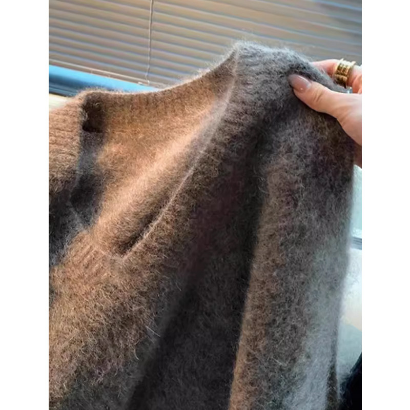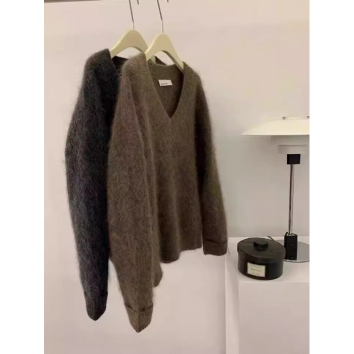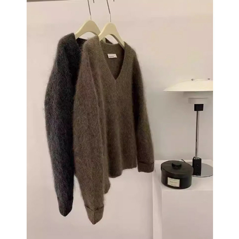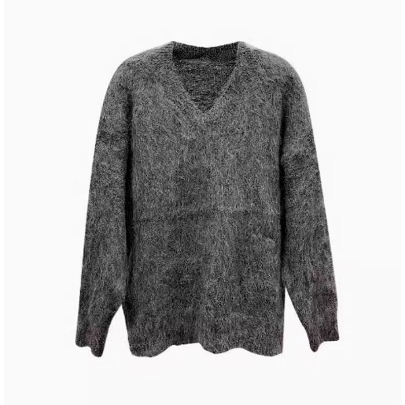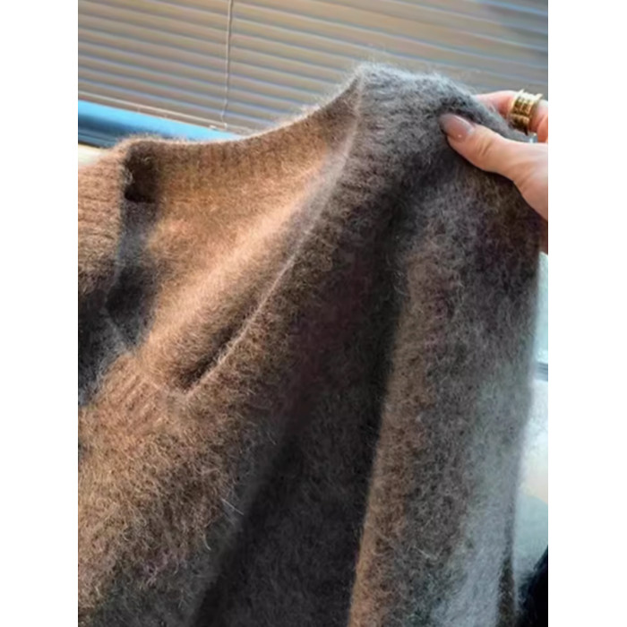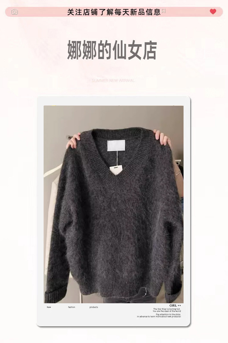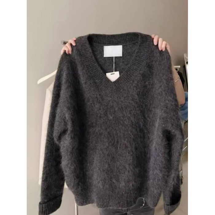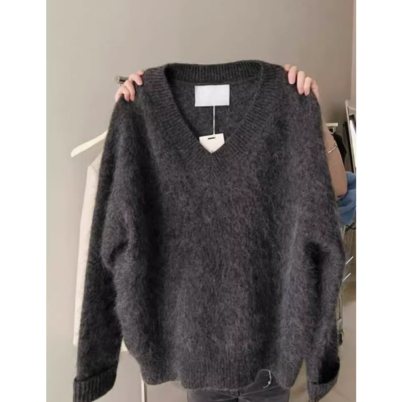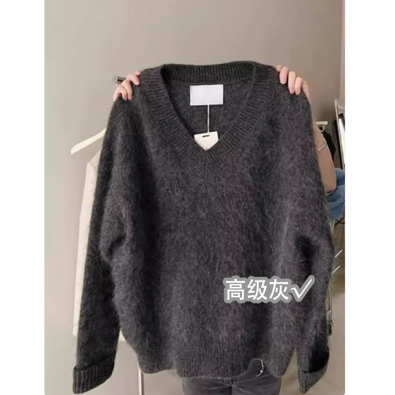 高級感v領水貂絨套頭毛衣女秋冬毛茸茸慵懶軟糯寬松灰色針織上衣