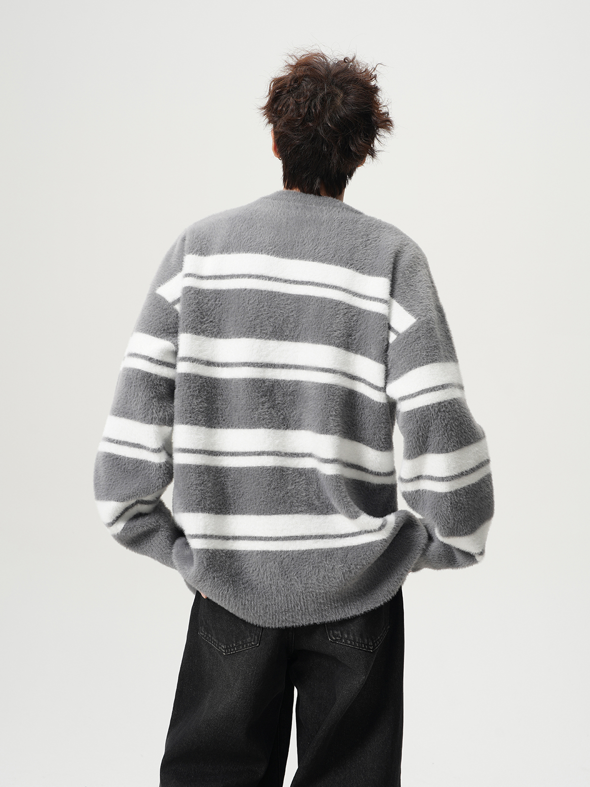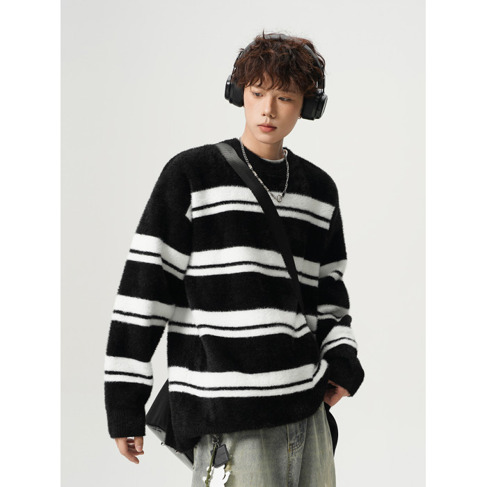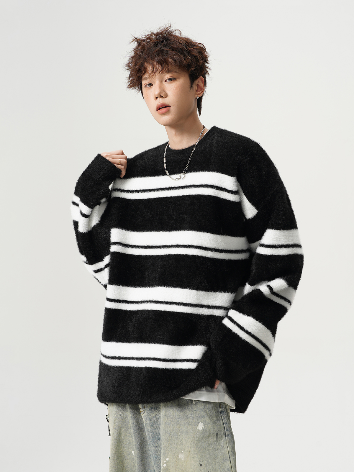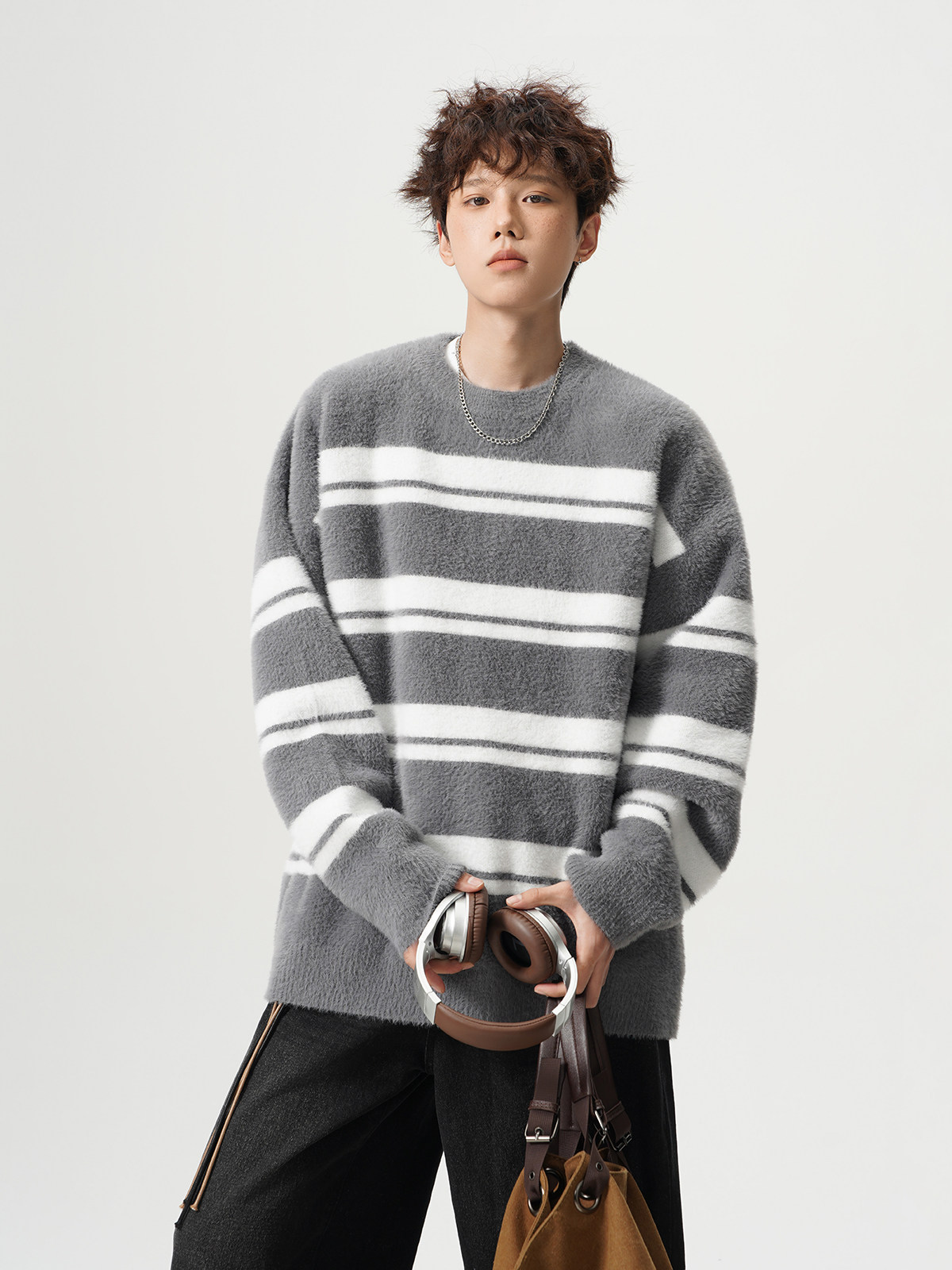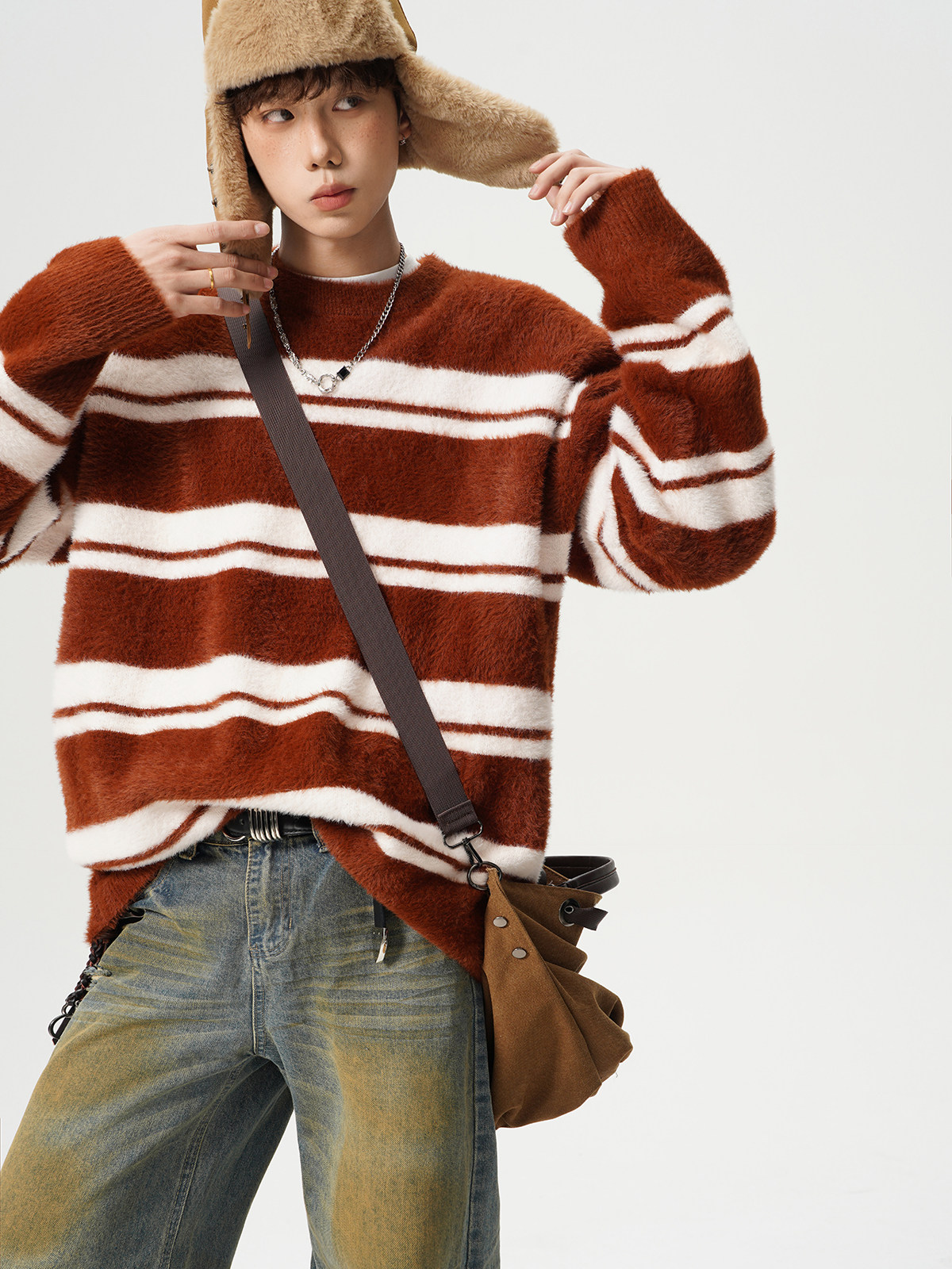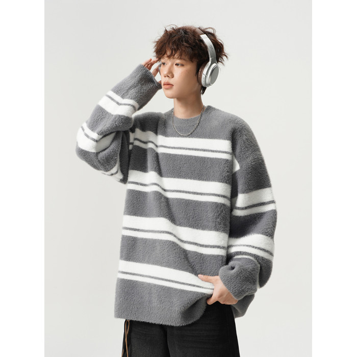日系慵懶風條紋毛衣男女冬季2024新款加厚圓領針織衫百搭內搭外套