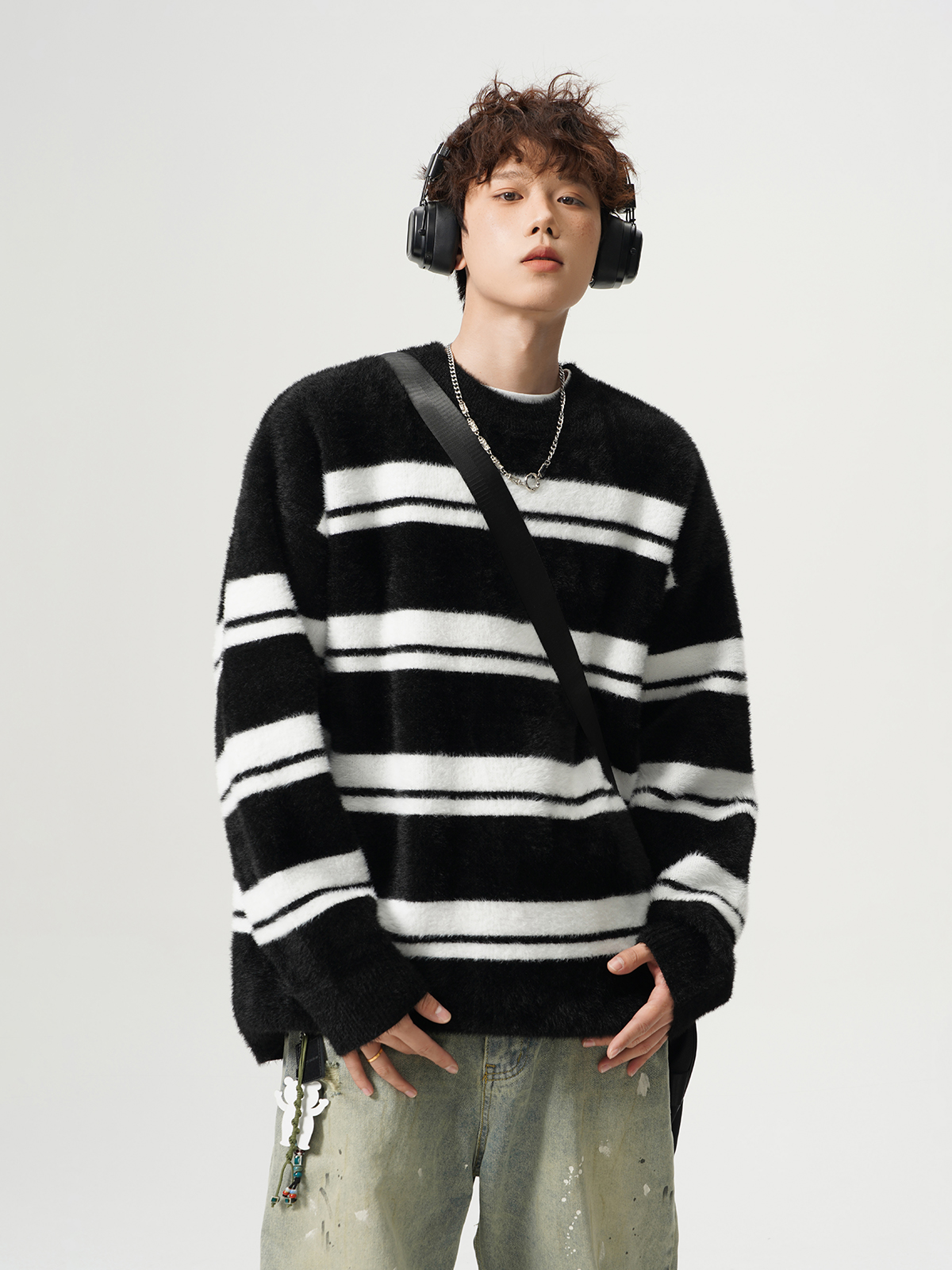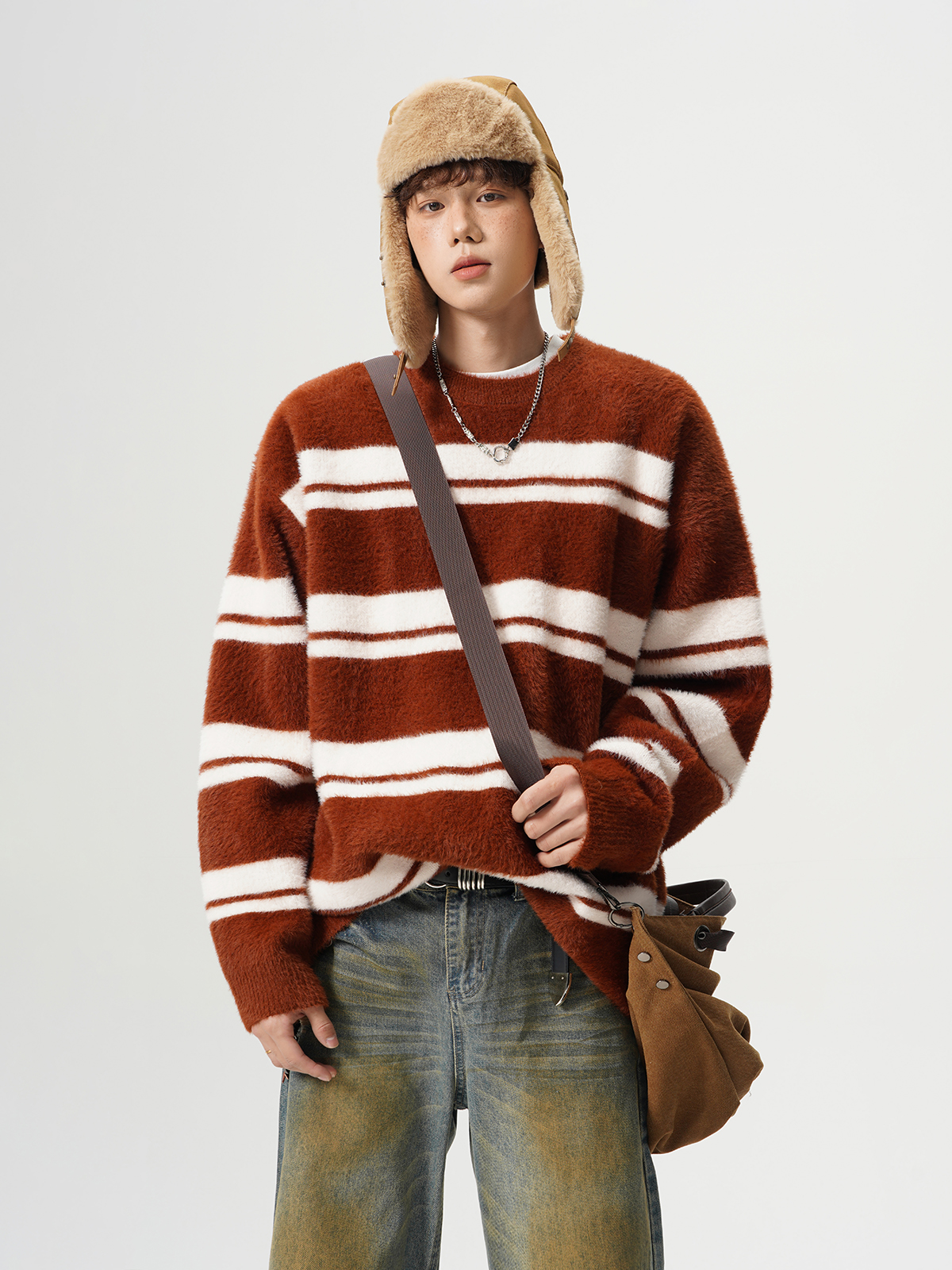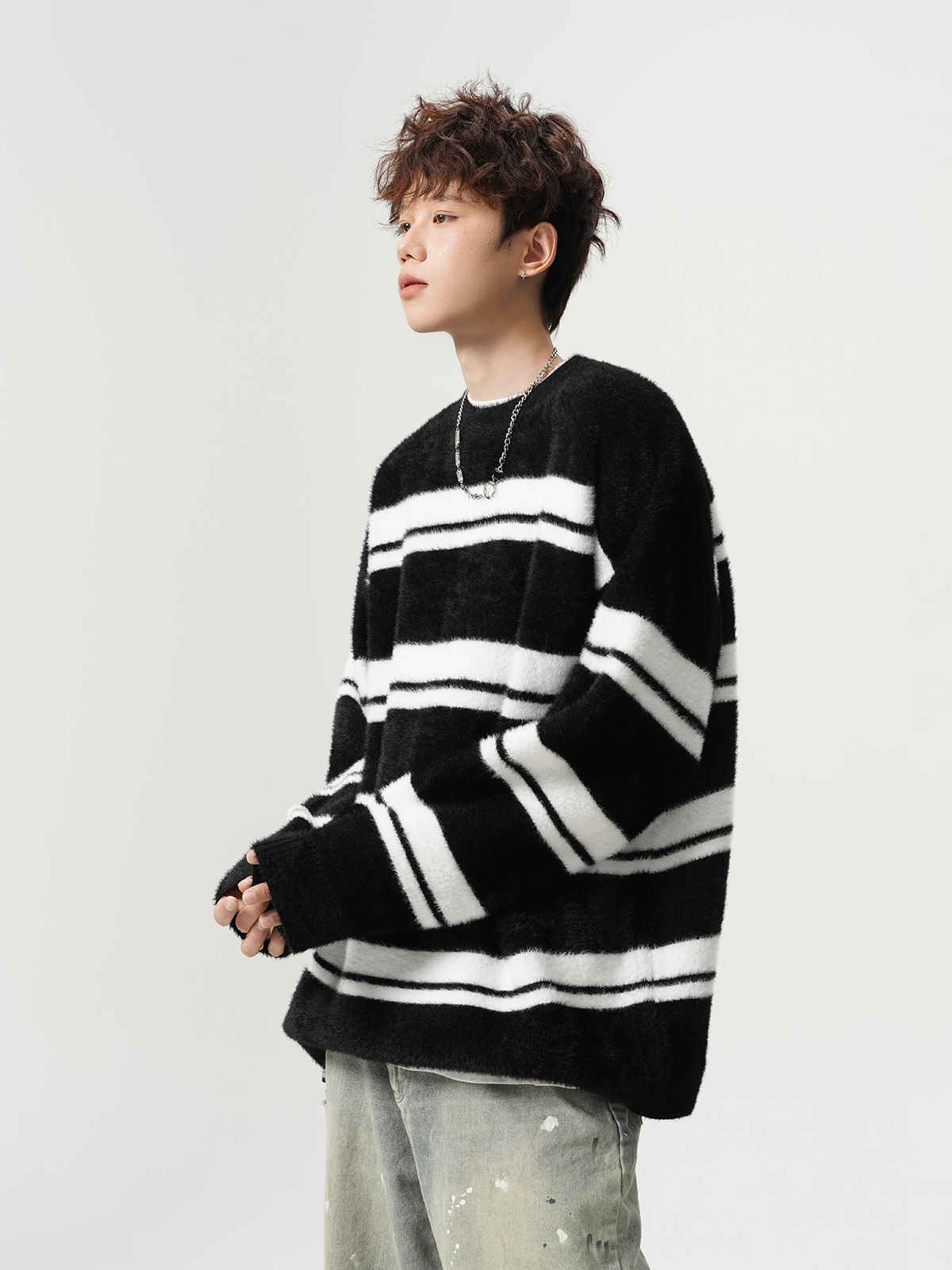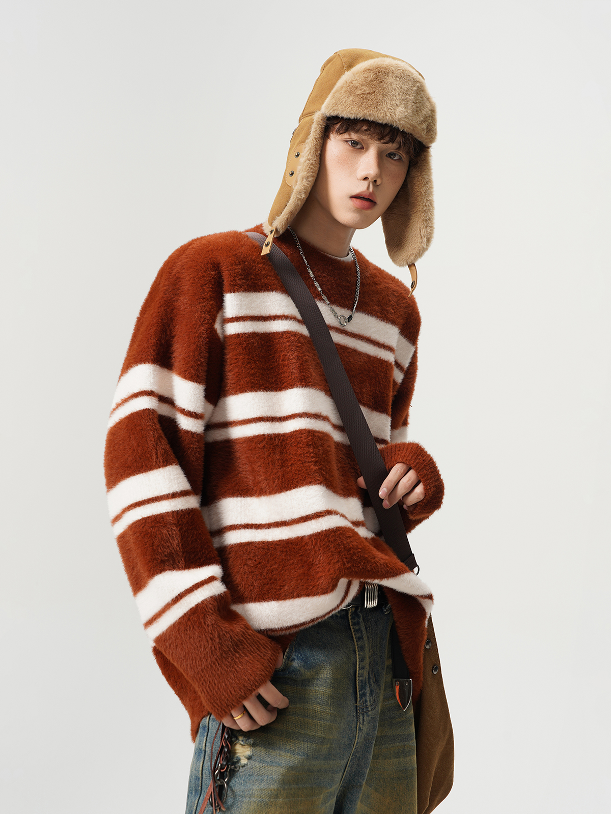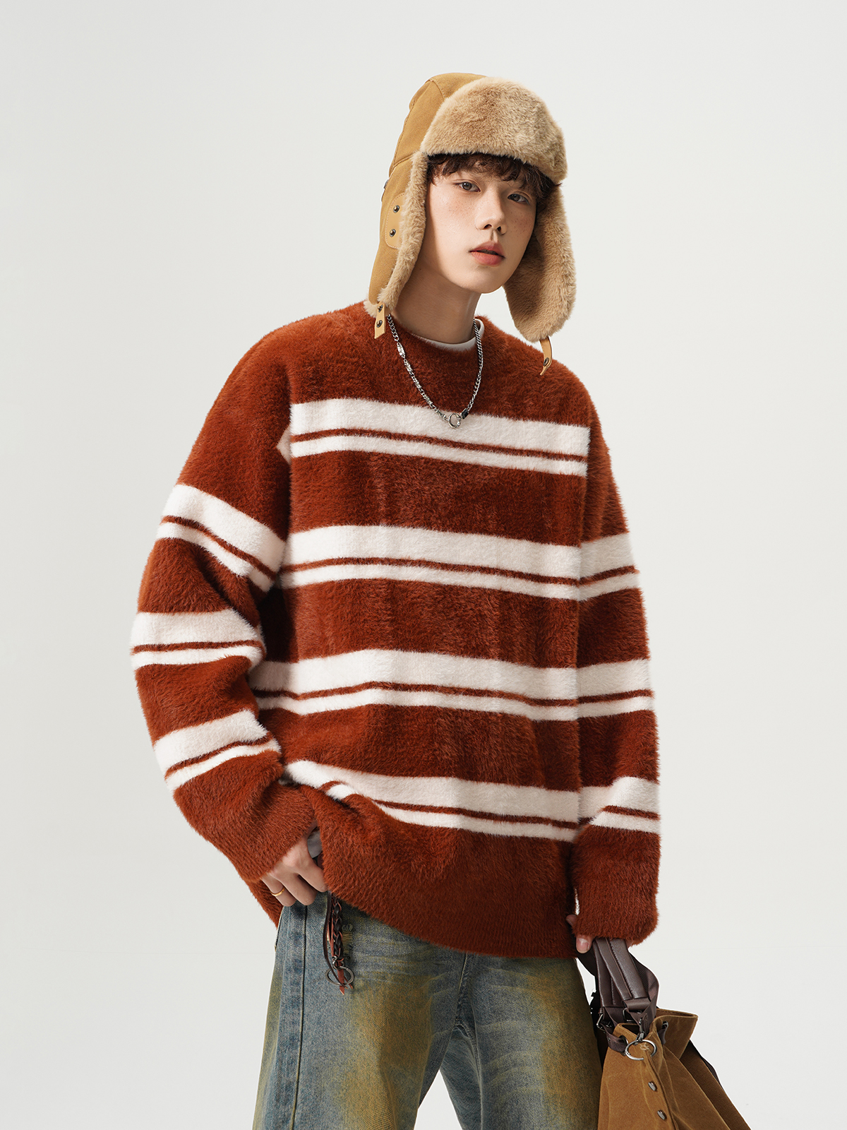 日系慵懶風條紋毛衣男女冬季2024新款加厚圓領針織衫百搭內搭外套